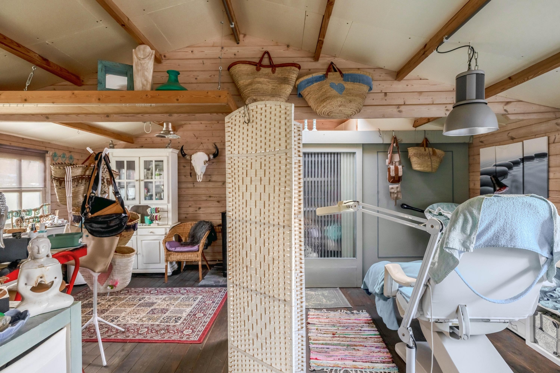 De tuin is rondom de woning gelegen en biedt een verzorgde, groene uitstraling met diverse sfeervolle zitplekken. Naast de woning bevindt zich een garage met een praktische berging (84 m2) met een carport, ideaal voor het overdekt parkeren van een auto. Blokhut met luifel (54 m²) te gebruiken als bedrijfsruimte of kantoor. Direct aan de Schollevaar is een gezellig prieel