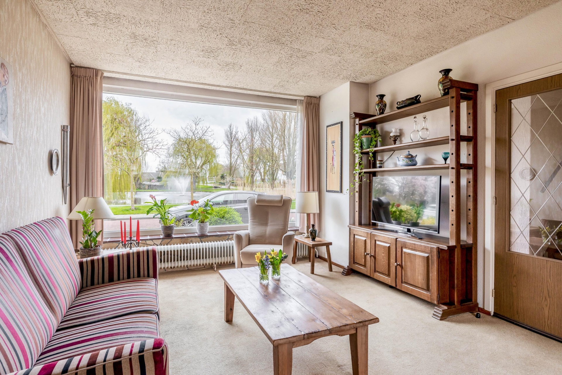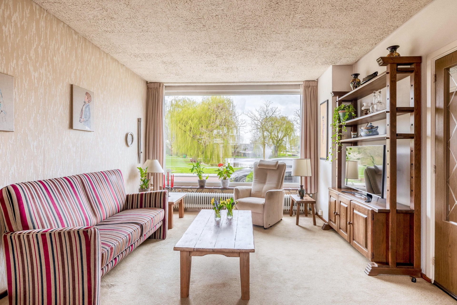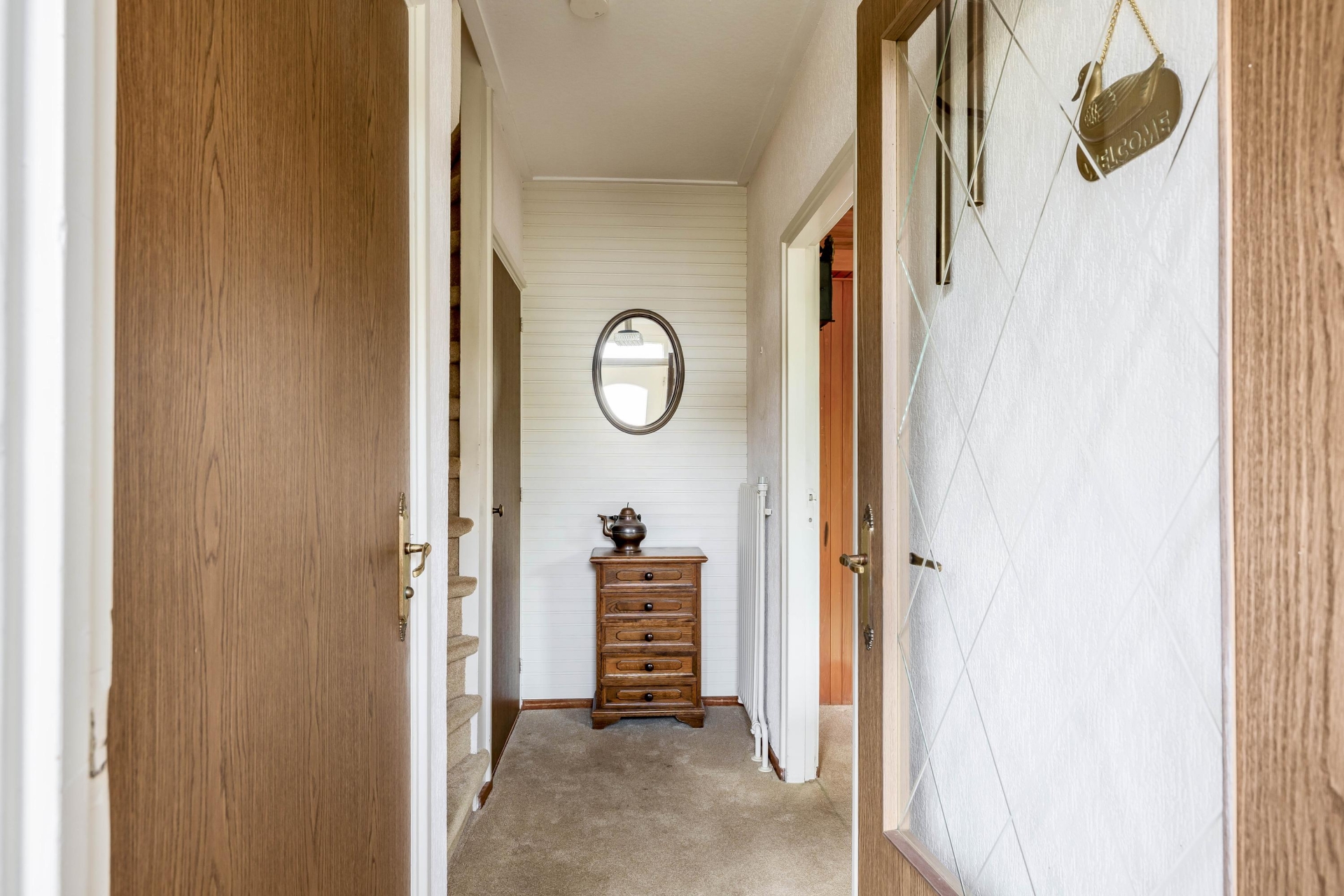 Bij binnenkomst valt direct op dat dit een huis is waar je nog echt je eigen draai aan kunt geven. De doorzonwoonkamer is lekker licht door de grote raampartijen aan zowel de voor- als achterzijde. Aan de voorkant kijk je vrij uit over het groen, terwijl je aan de achterzijde zicht hebt op de tuin.