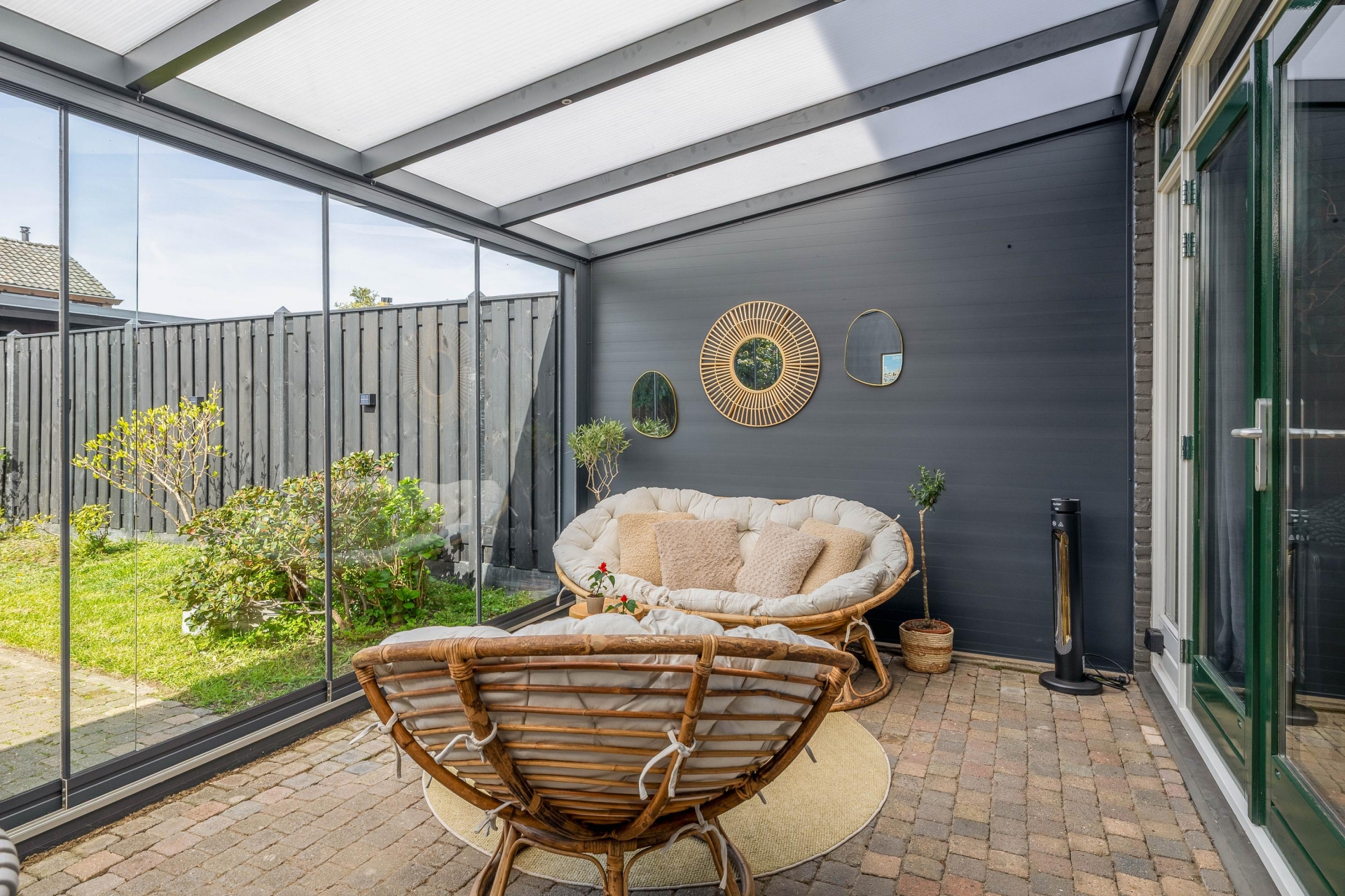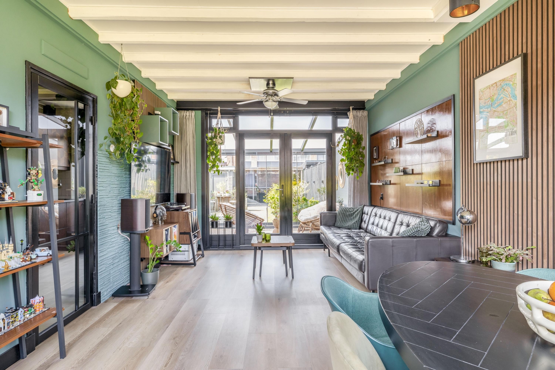 Aan de achterzijde sluit de woonkamer middels openslaande deuren aan op de serre. Dit is echt een verlengstuk van je leefruimte en zorgt voor extra comfort. Of het nu voorjaar of najaar is: hier zit je al snel lekker beschut en licht.