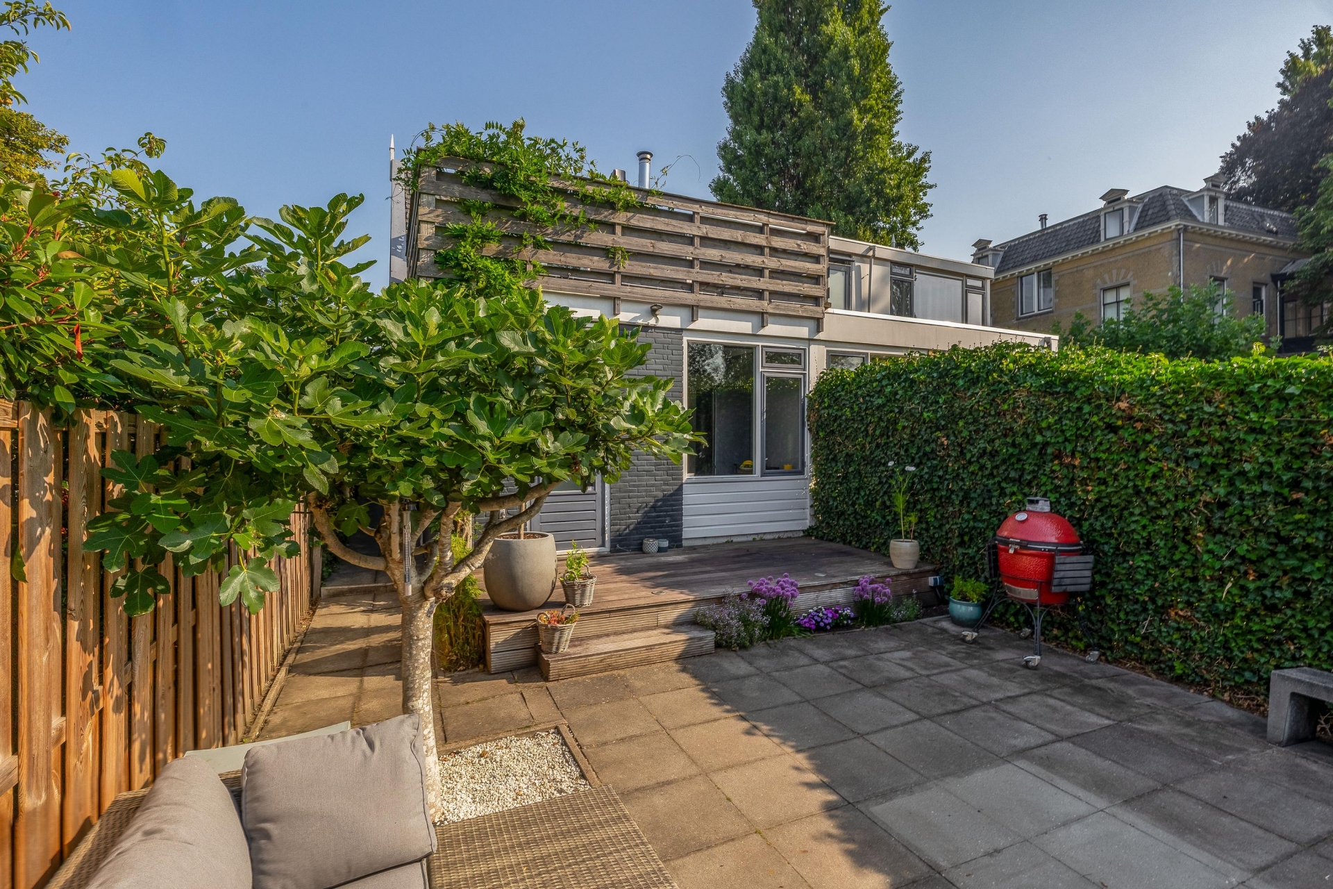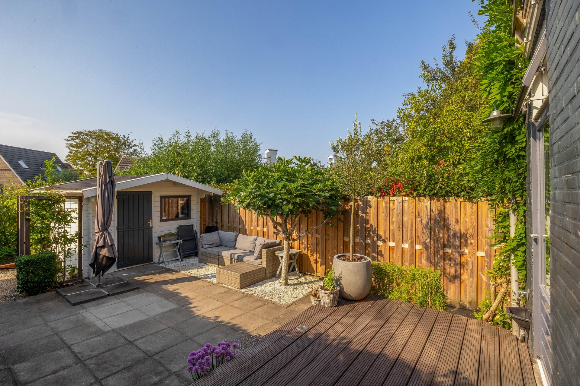 Via de achterdeur kom je in de verrassend ruime en fraai aangelegde tuin – een echt pluspunt van deze woning. De tuin ligt op het zuiden, dus zon is hier (bij goed weer) gegarandeerd. De combinatie van groen, bestrating, een sfeervol terras én een berging maakt dit tot een tuin waar je het hele voorjaar en zomer met plezier doorbrengt. Achterin is er een knusse zithoek gecreëerd – perfect voor een rustige ochtend met koffie of een barbecue met vrienden.