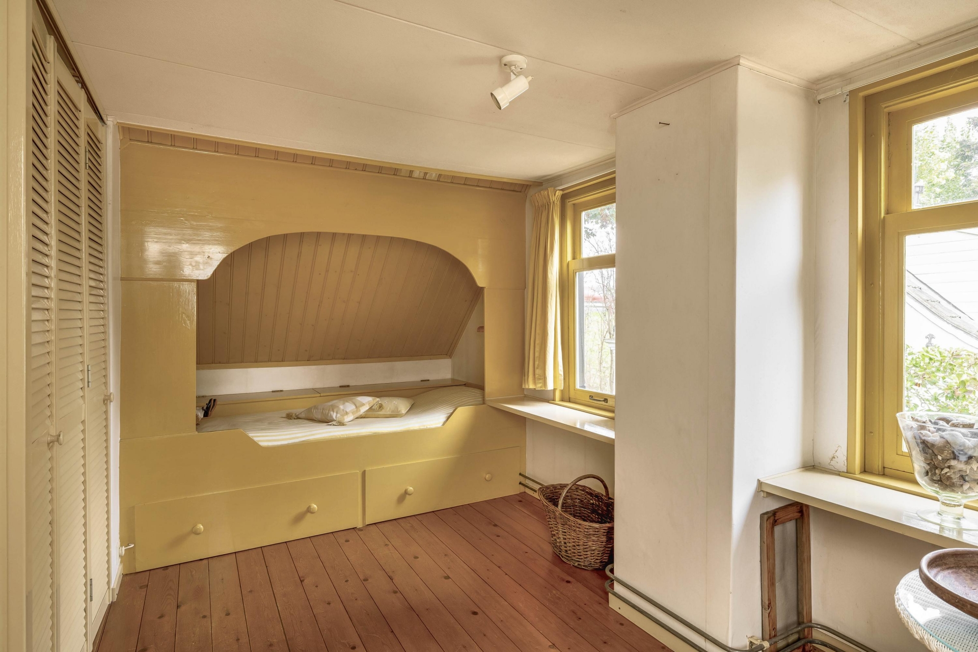 Op de verdieping bevinden zich drie charmante slaapkamers – elk met vaste kasten, bedstede-elementen of dakkapellen – en een overloop met voldoende bergruimte. Er is een aparte kast waar eventueel een tweede toilet gerealiseerd kan worden (waterafvoer aanwezig). Boven de verdieping bevindt zich nog een praktische bergvliering, bereikbaar via een losse trap.
