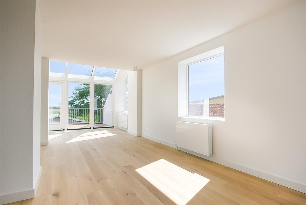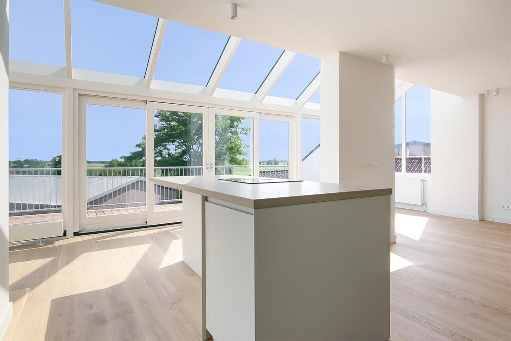 Via de ingang bovendijks kom je kom je in de gemeenschappelijke hal met meterkast. Van daaruit loop je door naar je eigen hal met glazen wand. De woonkamer is strak afgewerkt met gestucte wanden en is heerlijk licht door de vele raampartijen en lichtstraat. Een ruimte om verliefd op te worden. Vanuit de woonkamer kijk je uit over het polderlandschap. De keuken beschikt over een kookeiland en alle benodigde inbouwapparatuur, zoals een inductiekookplaat met geïntegreerde afzuigkap, vaatwasser, combi-oven, koelkast, vriezer en voldoende opbergruimte. Het terras van ruim 15 M² is gelegen op het noord-oosten bereik je middels de glazen schuifpui. Ondanks de ligging kun je hier vanwege de hoogte vrijwel de gehele dag van de zon genieten.