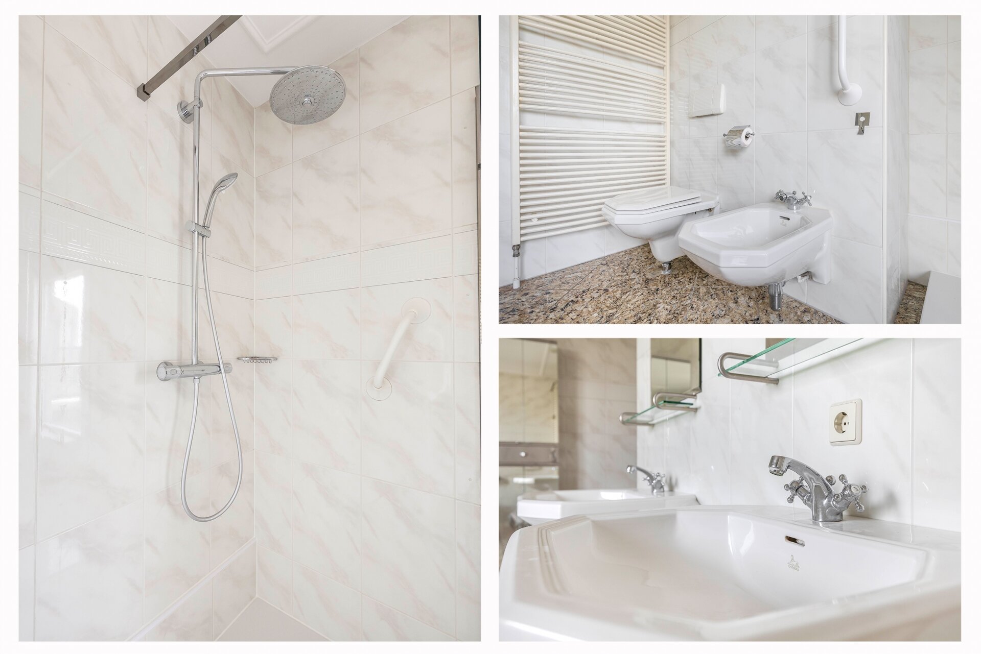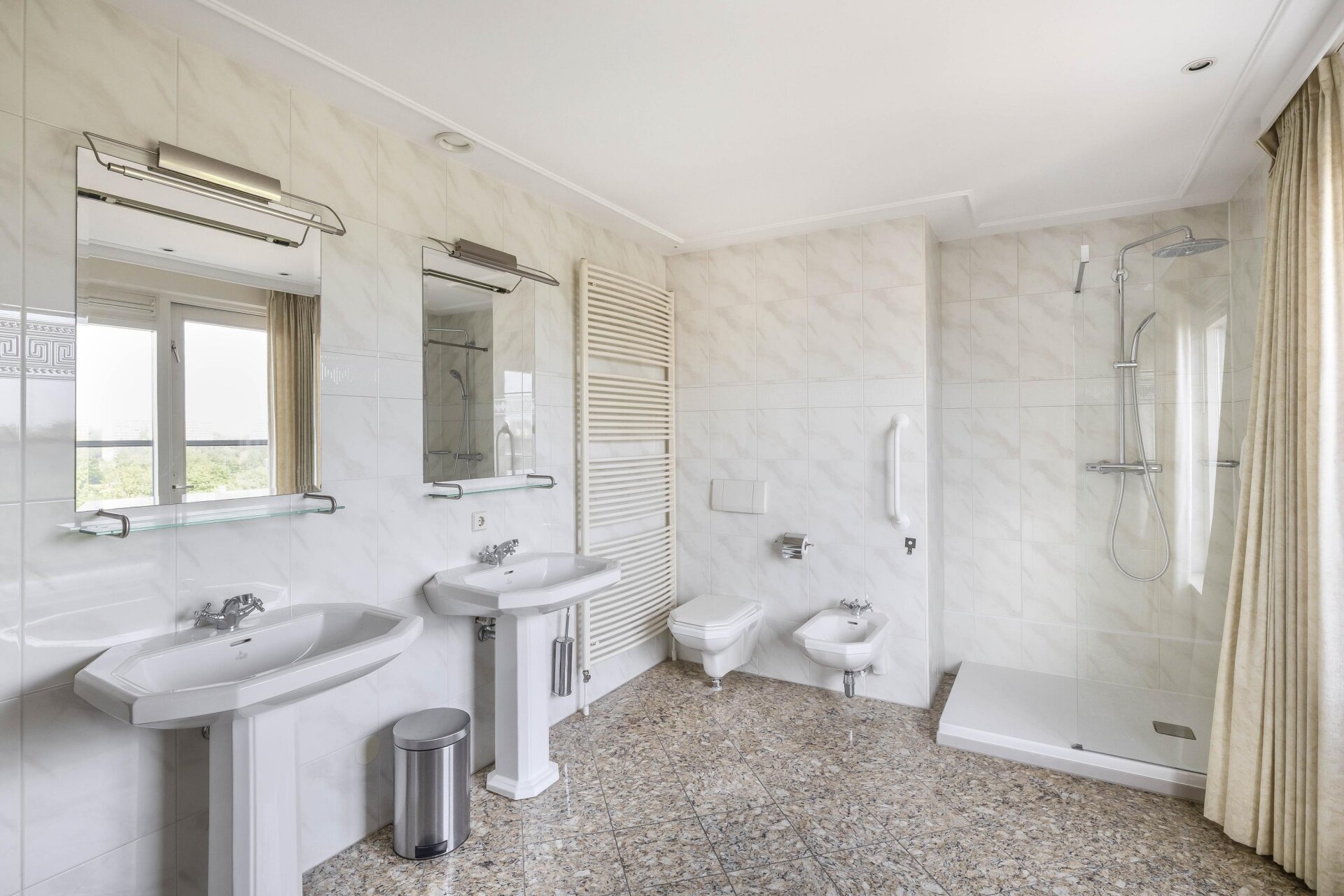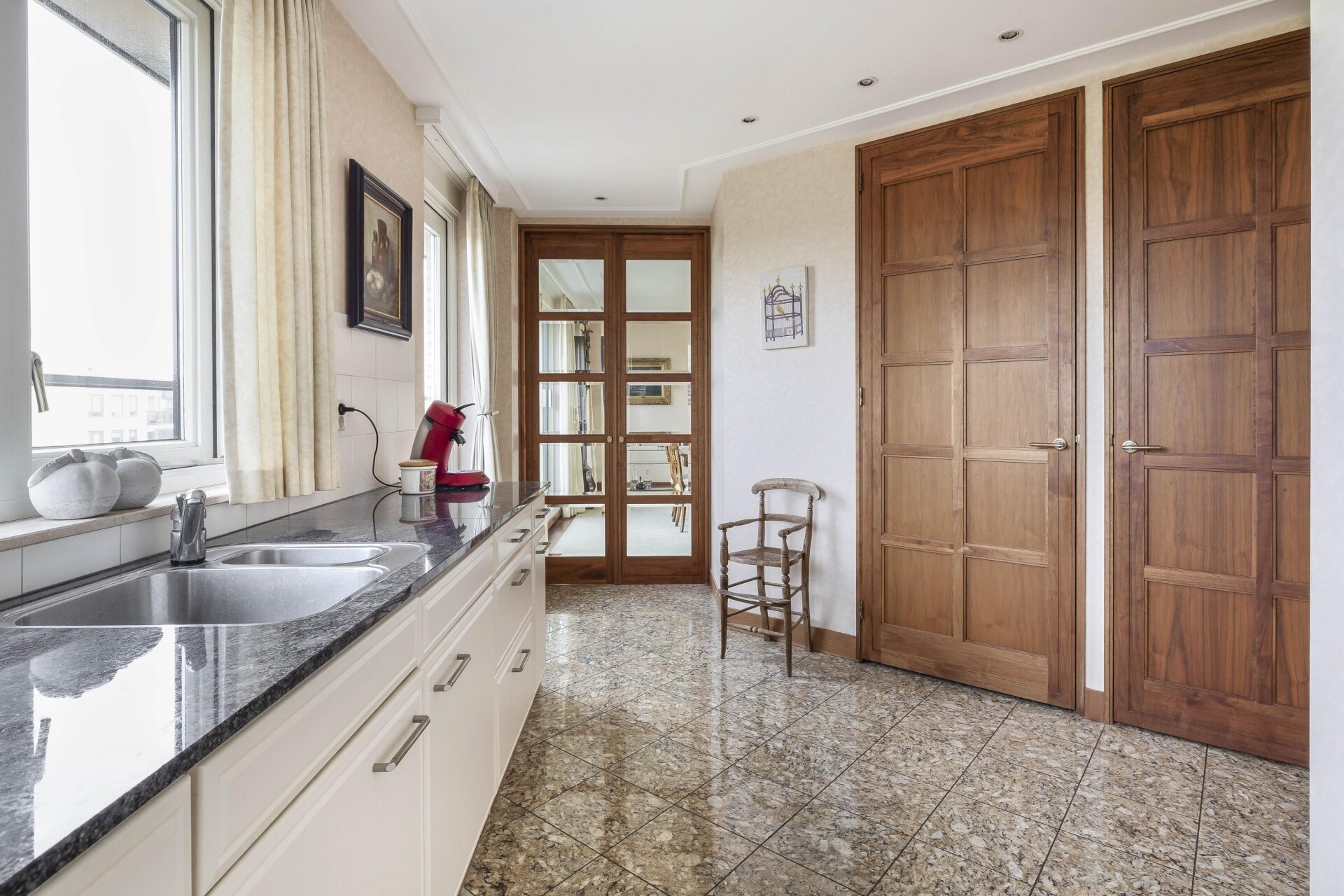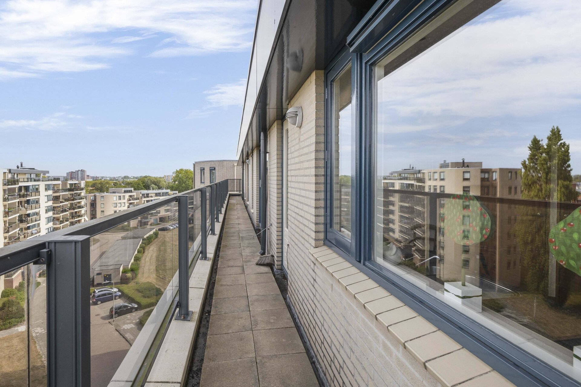Wanneer u het penthouse betreedt, wordt u begroet door een ruime hal die toegang biedt tot een praktische vaste kast, een chic toilet, de royale woonkamer en de keuken. De keuken, uitgevoerd in een elegante U-opstelling, is uitgerust met hoogwaardige inbouwapparatuur en een praktische inpandige kast voor uw voorraad. De woonkamer vormt het kloppende hart van het appartement en is omringd door talloze raampartijen die zorgen voor een overvloed aan daglicht. Het gaat niet alleen om de ruimte, maar vooral om het sensationele uitzicht! Via verschillende schuifpuien heeft u toegang tot een prachtig dakterras, waar u optimaal kunt genieten van het buitenleven. De woonkamer biedt ook toegang tot twee sfeervolle slaapkamers, evenals een kantoorruimte die uiteraard ook als derde slaapkamer kan dienen. Beide slaapkamers zijn voorzien van een luxe badkamer ensuite, terwijl de master bedroom bovendien beschikt over een royale inloopkast en een aangrenzende wasruimte.