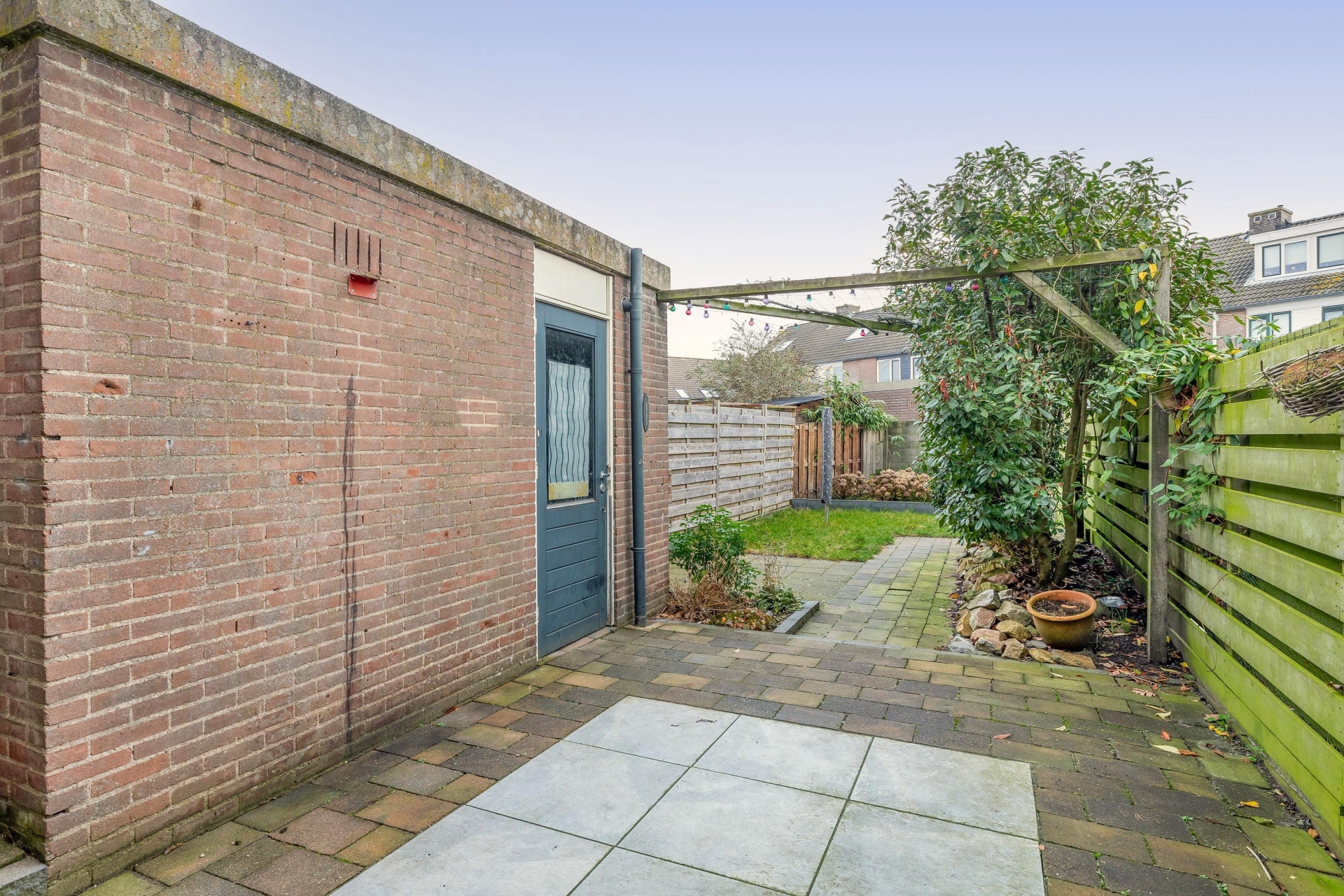 Een van de grootste pluspunten van dit huis is de diepe achtertuin van ruim 15 meter. De tuin ligt op het noordoosten en biedt door zijn lengte de hele dag door zon én schaduw. Tevens vindt je hier de stenen berging, voorzien van elektra – ideaal voor fietsen, tuingereedschap of als klusruimte. Via de achterom heb je gemakkelijk toegang vanaf het achterpad.