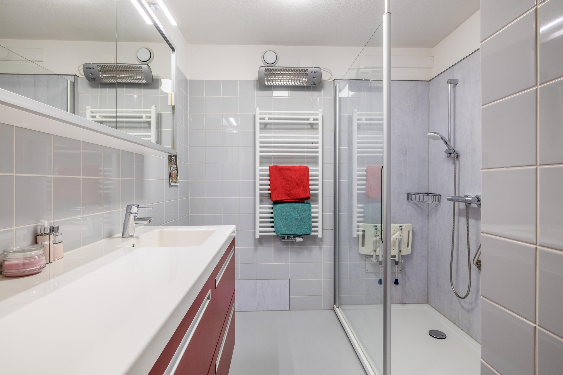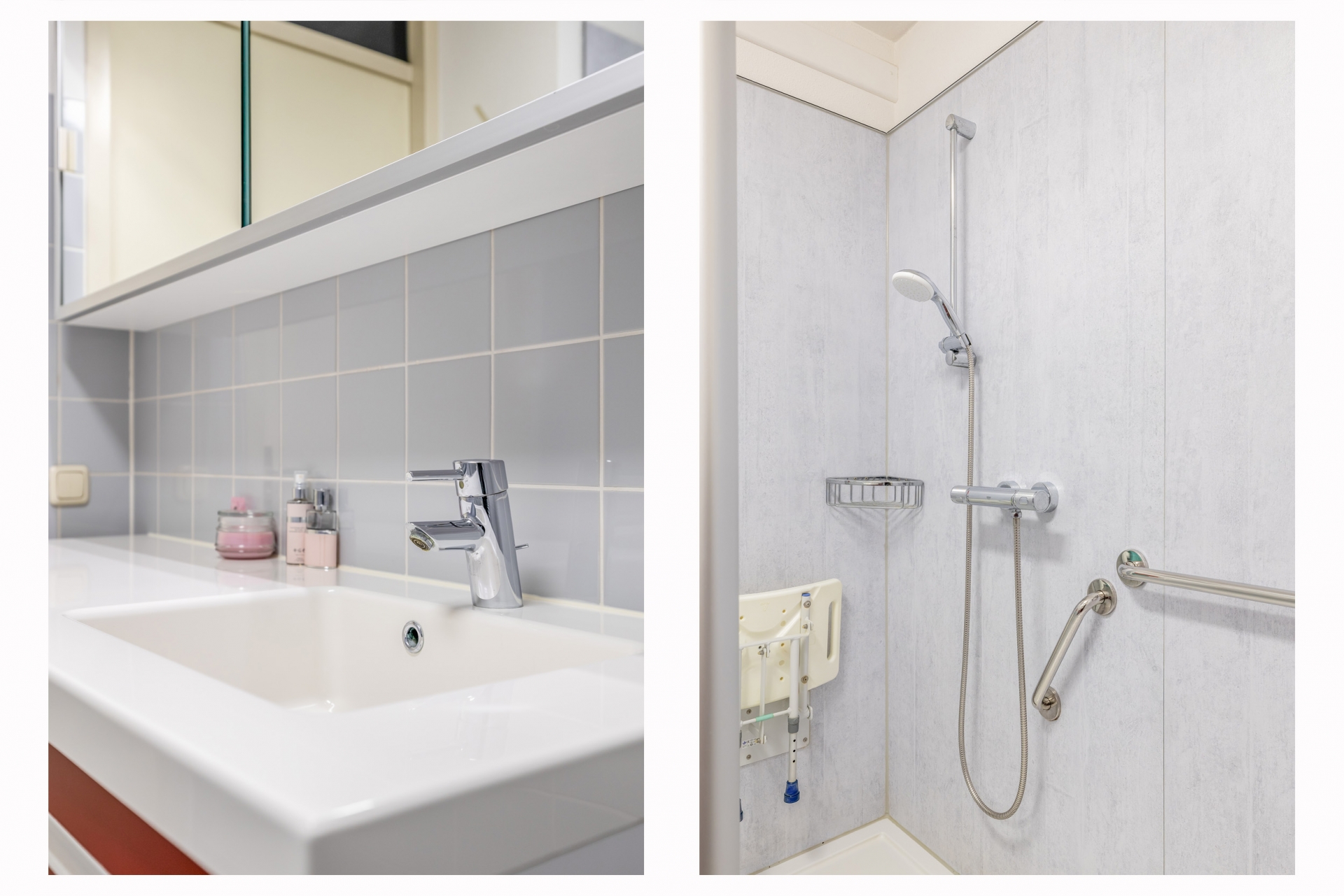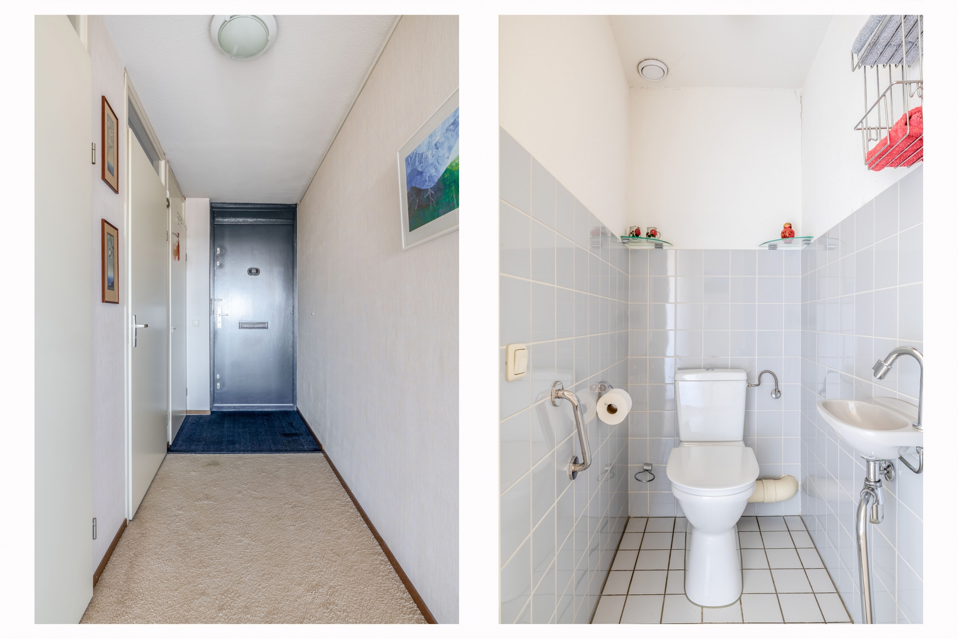 Op de 6e etage komen we vanuit het portiek bij de entree met meterkast en een lange gang waar vandaan toegang tot de verschillende ruimtes van het appartement. Als eerste treffen we de badkamer (4m²) met daarin ruimte voor een wastafelmeubel, handdoekradiator en een grote inloopdouche. Naast de badkamer bevindt zich het toilet (1.5m²), voorzien van staand closet en fontein. Vervolgens de eerste van de 2 slaapkamers van het appartement.