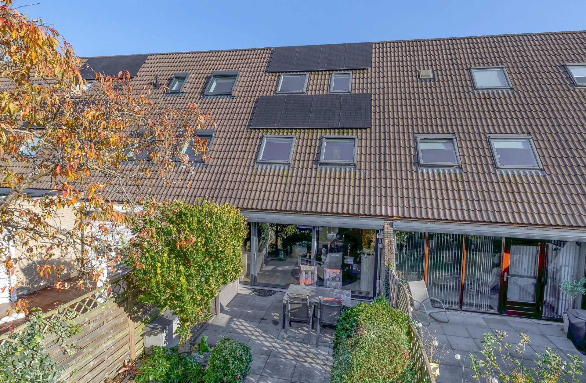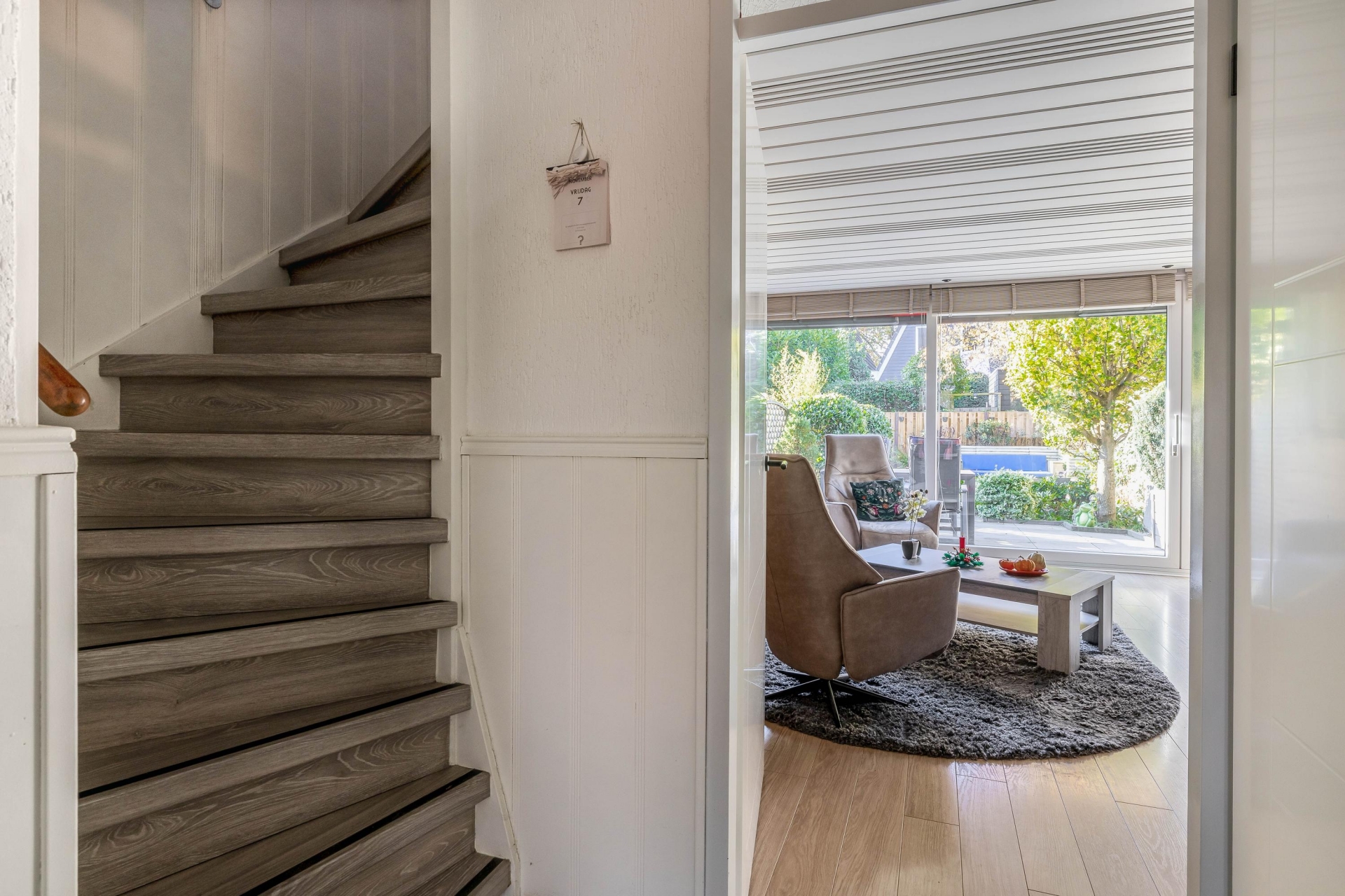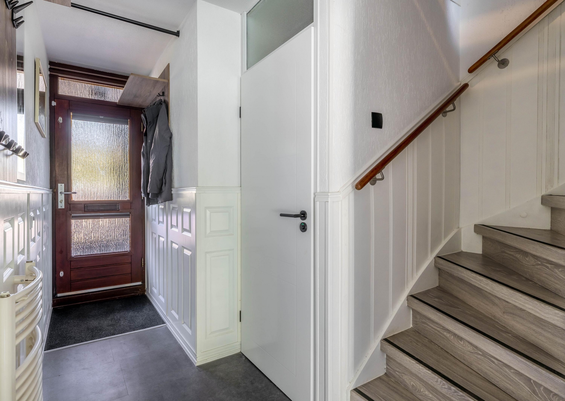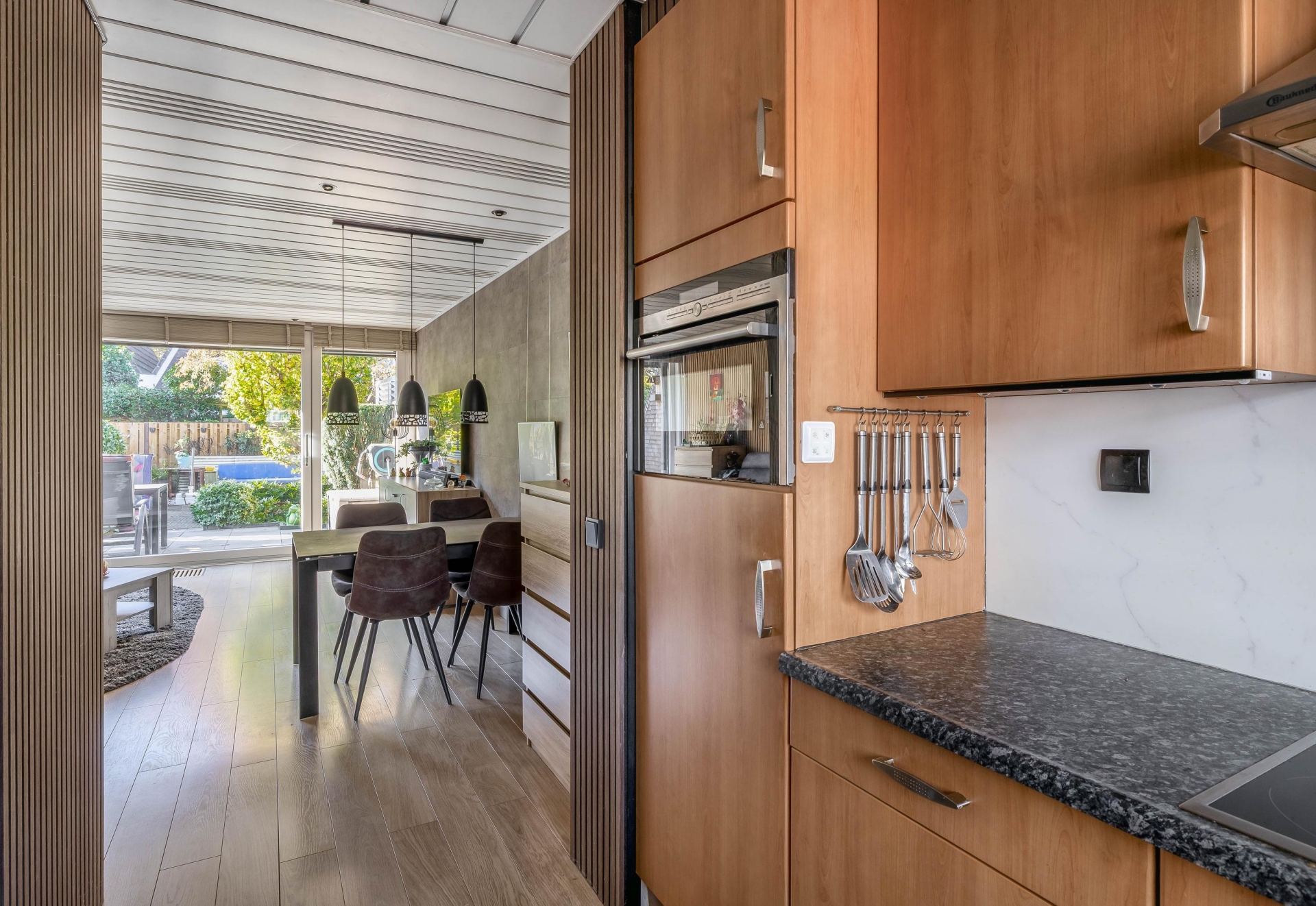 Via de fraai aangelegde voortuin bereik je zowel de woning als de aangebouwde berging. Vanuit de entree zijn alle vertrekken direct toegankelijk. Hier bevinden zich het toilet met fonteintje, de meterkast en de trapopgang. De entree leidt naar de woningbrede woonkamer, die naadloos overgaat in de ruime open keuken met diverse inbouwapparatuur. Dankzij de grote schuifpui sta je zo in de zonnige achtertuin op het zuidwesten. De tuin is speels ingericht met een combinatie van groen en een gezellig terras, en beschikt bovendien over een praktische achterom.