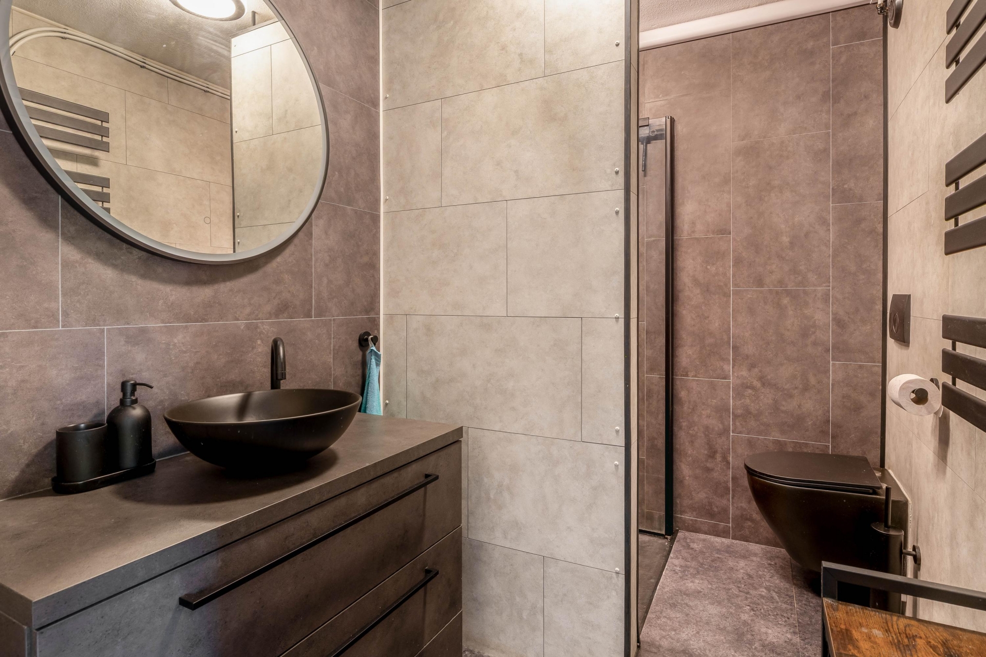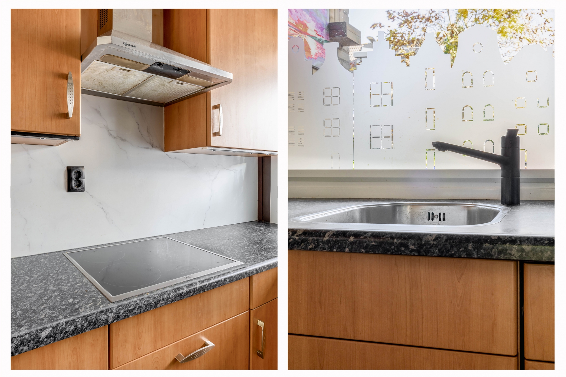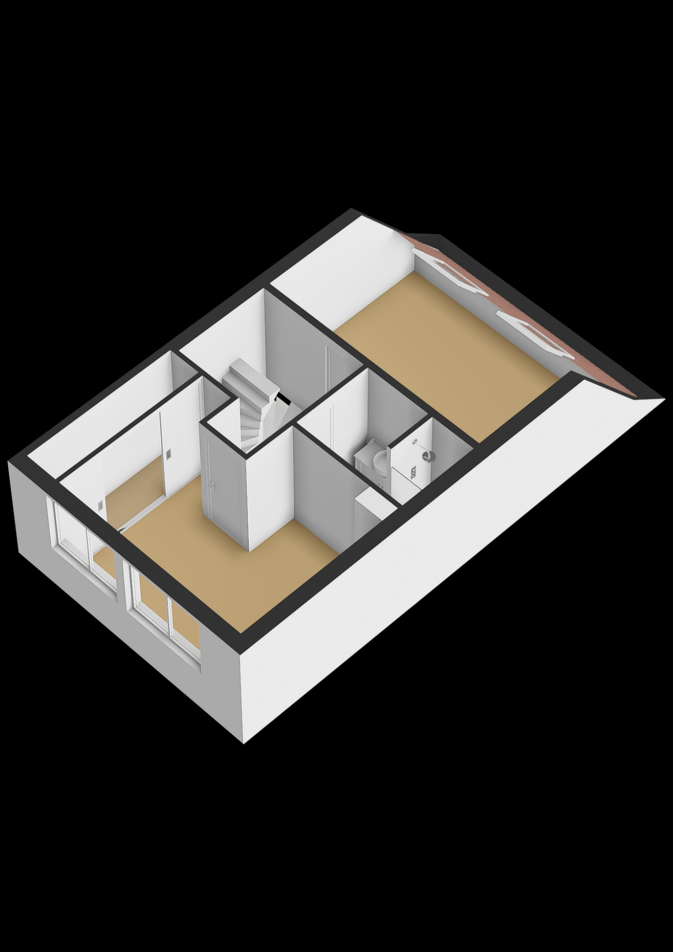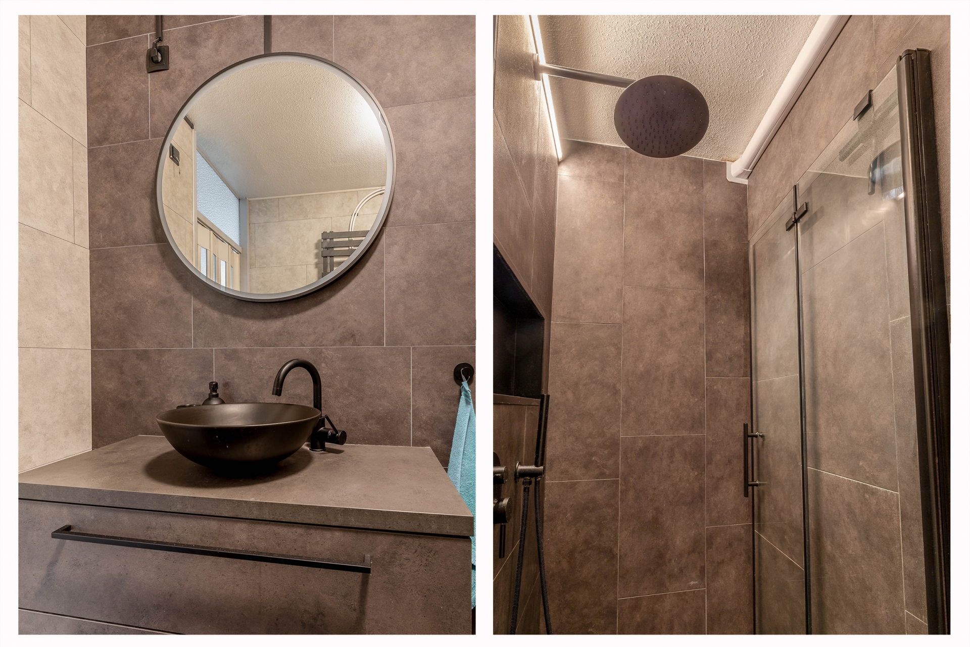 Via de trap bereik je de eerste verdieping. Aan de achterzijde van de woning bevindt zich de eerste slaapkamer, voorzien van twee dakramen en met een oppervlakte van circa 17 m². Aan de voorzijde ligt de tweede slaapkamer, die beschikt over een praktische vaste kast en een oppervlakte heeft van ongeveer 13 m². De inpandige badkamer is compleet uitgerust met een inloopdouche (incl. 2 delige vouwdeur), toilet en een modern wastafelmeubel.
