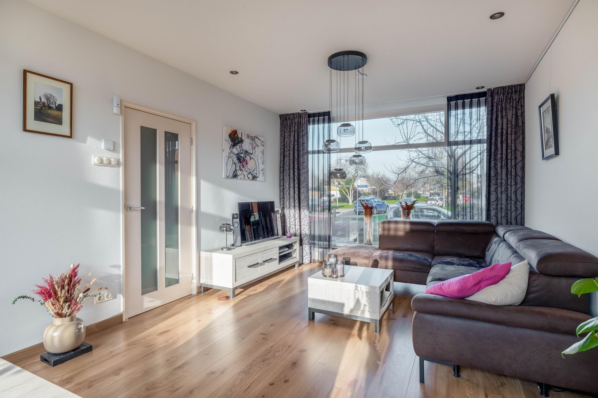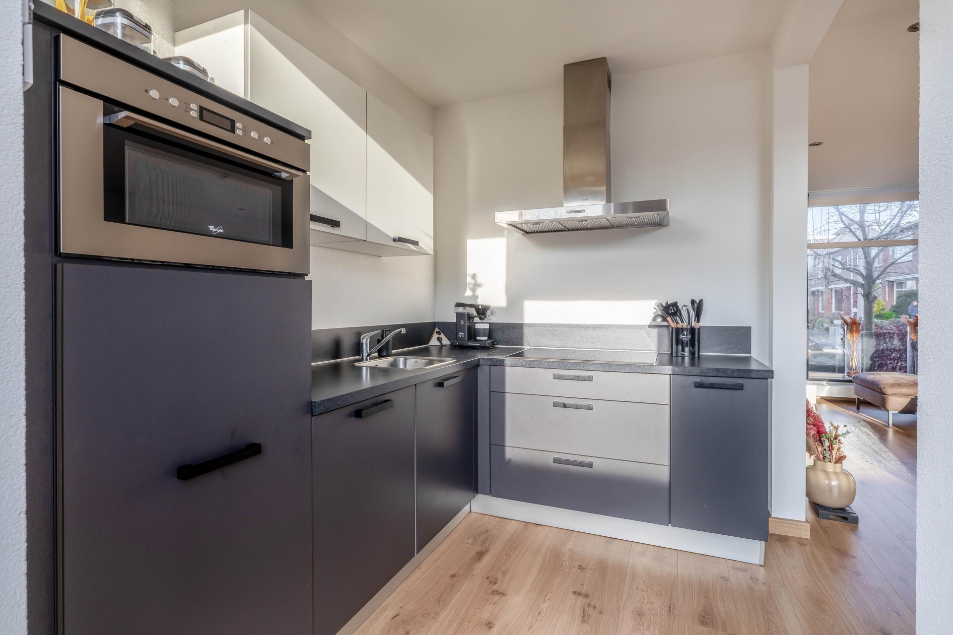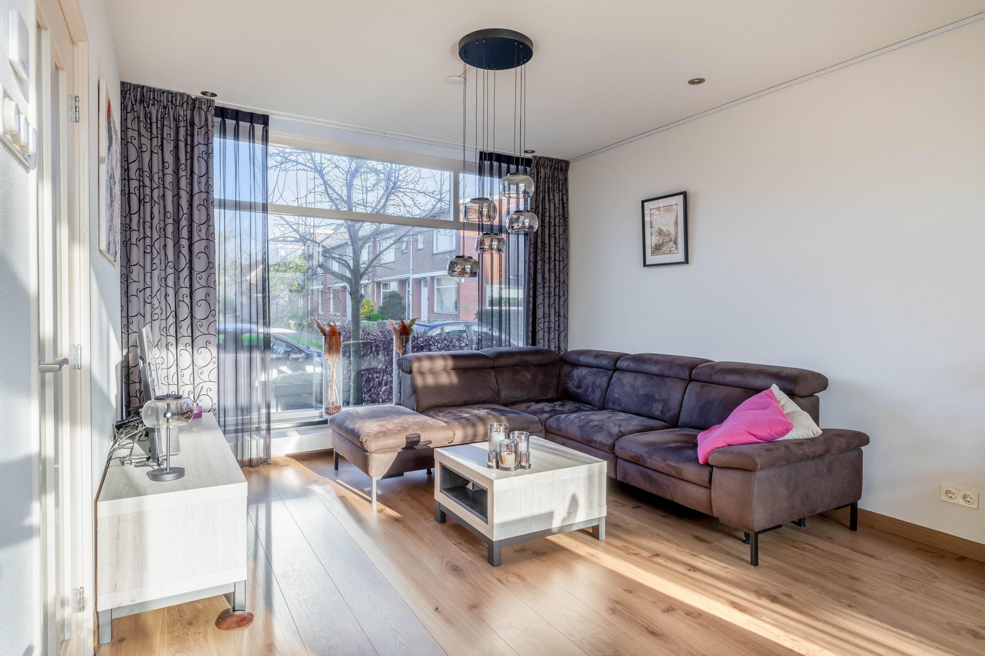 Bij binnenkomst valt direct de prettige lichtinval op. De woonkamer ligt aan de voorzijde en kijkt vrij de straat in, wat zorgt voor een open en ruimtelijk gevoel. Grote ramen laten veel daglicht binnen en maken dit een fijne plek om thuis te komen. De zithoek is ruim genoeg voor een grote bank en dankzij de hoekligging voelt de woonkamer extra breed aan.