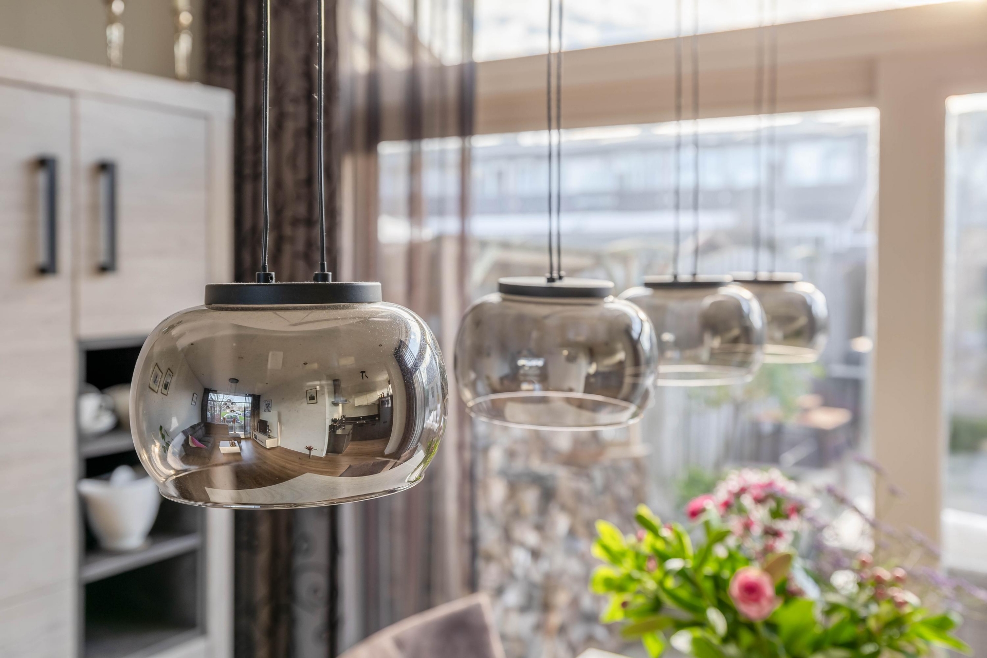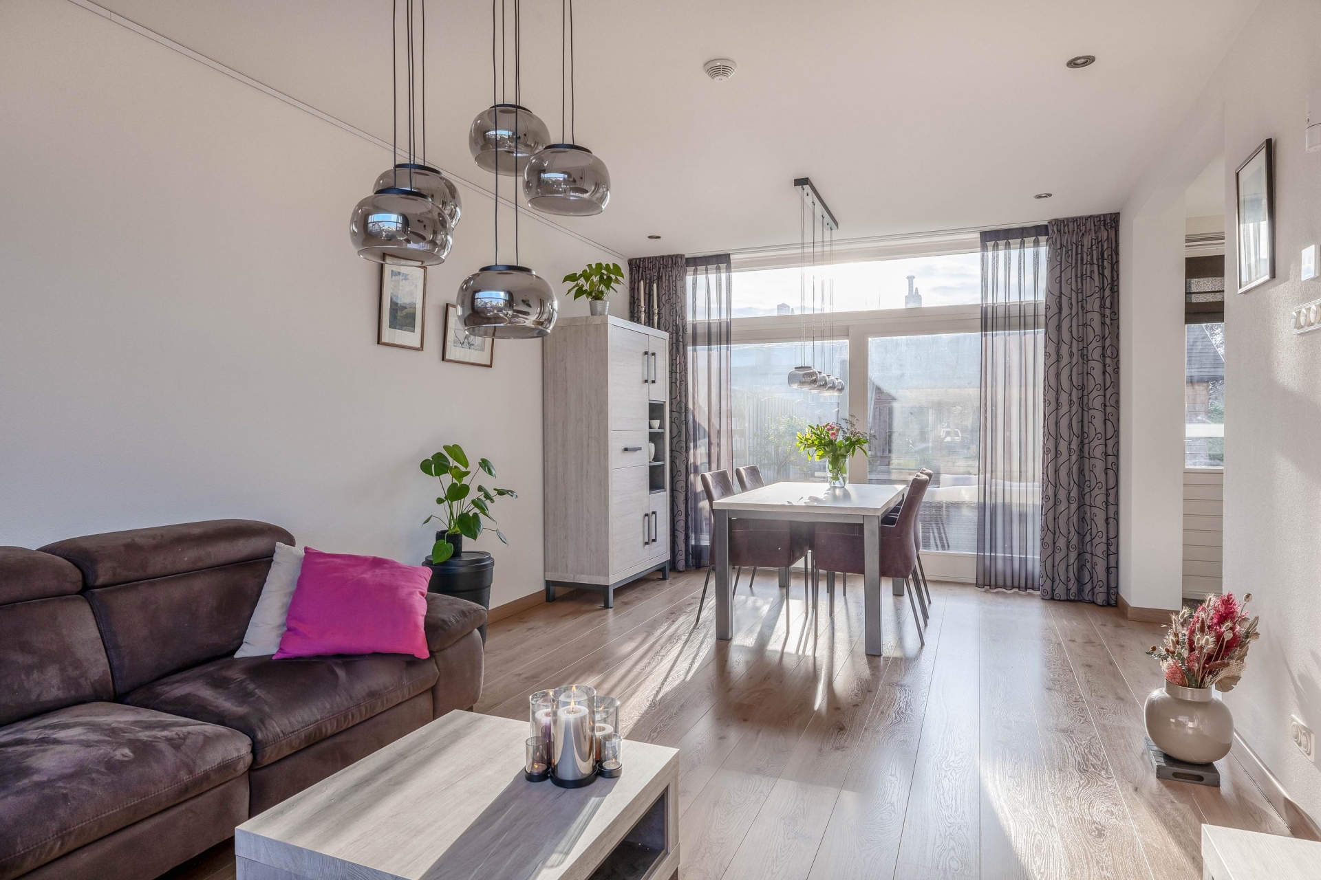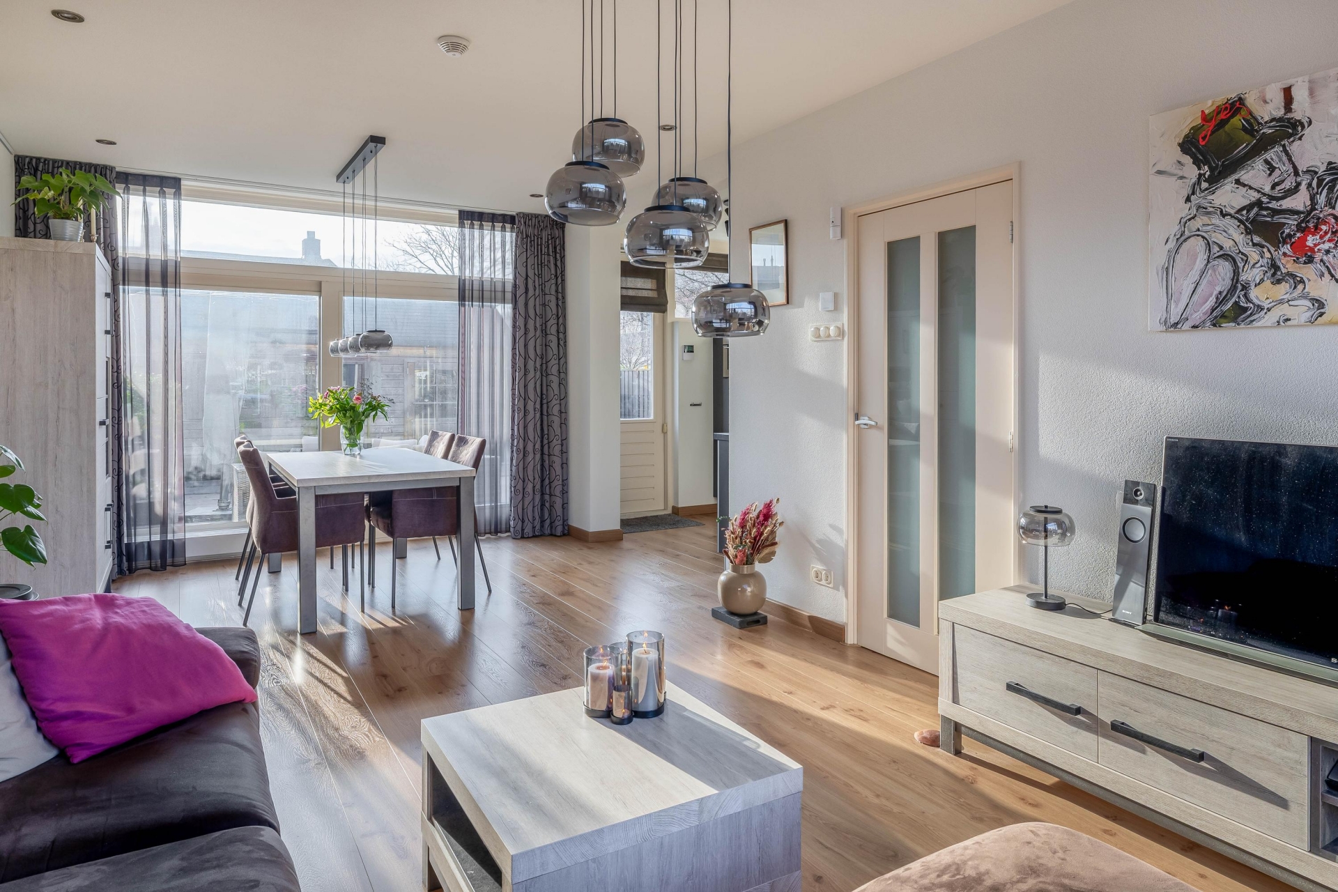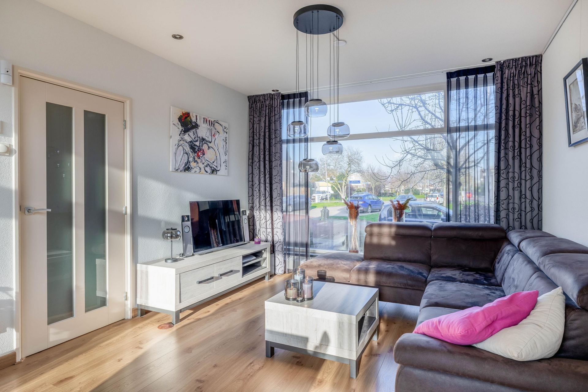 Bij binnenkomst valt direct de prettige lichtinval op. De woonkamer ligt aan de voorzijde en kijkt vrij de straat in, wat zorgt voor een open en ruimtelijk gevoel. Grote ramen laten veel daglicht binnen en maken dit een fijne plek om thuis te komen. De zithoek is ruim genoeg voor een grote bank en dankzij de hoekligging voelt de woonkamer extra breed aan.