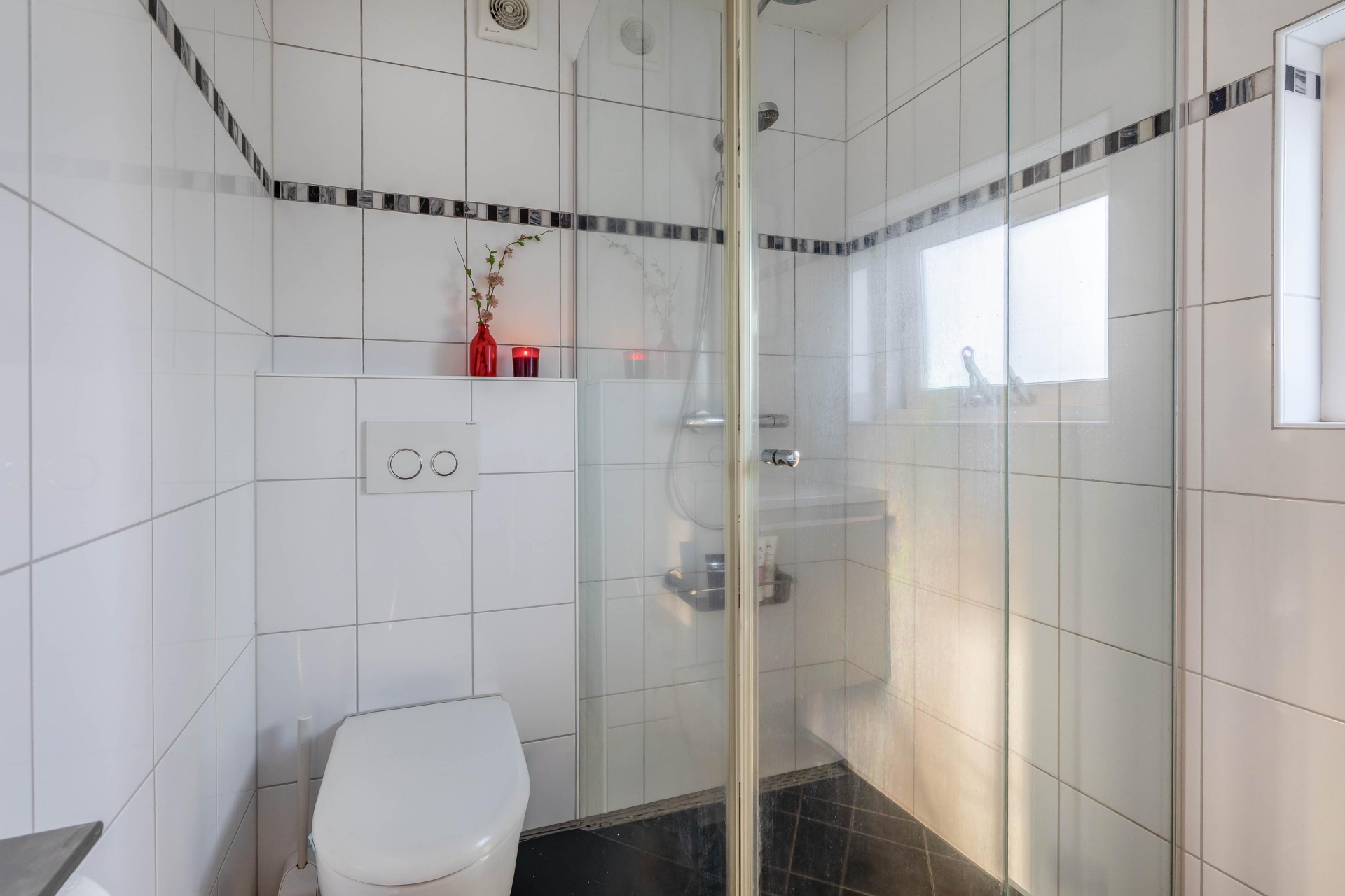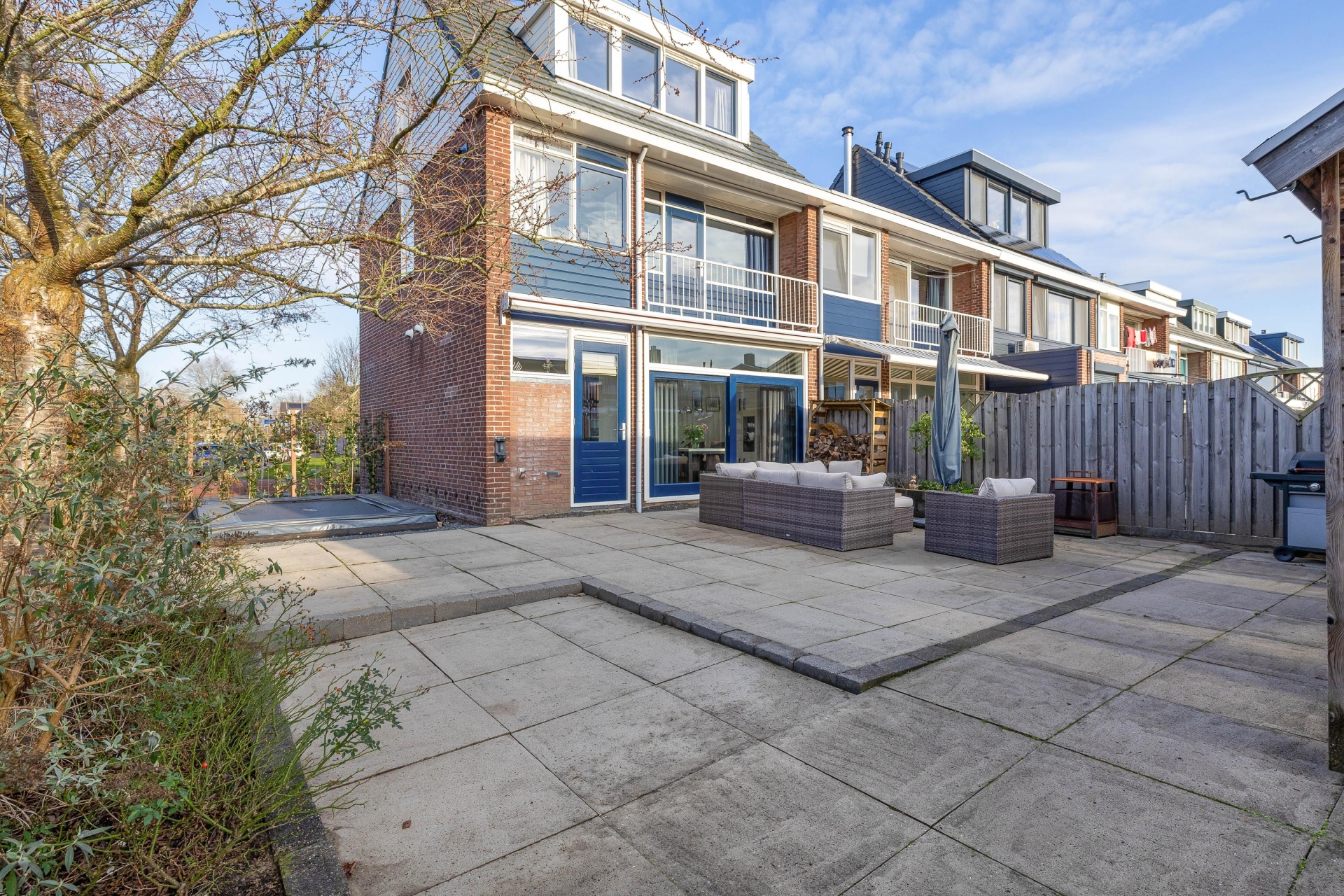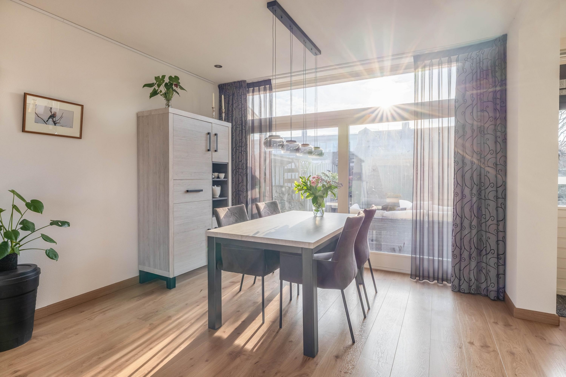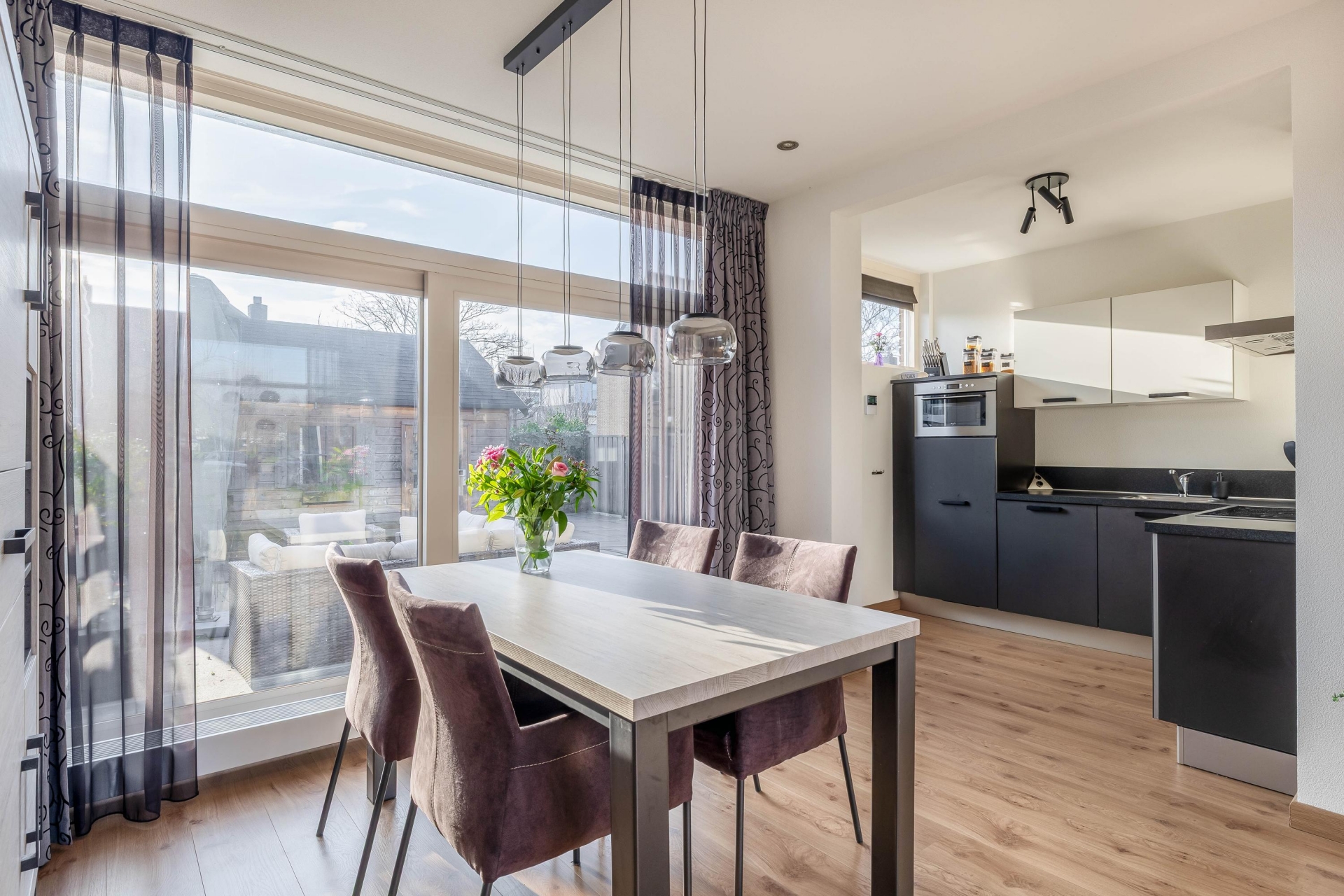 Aan de achterzijde is ruimte voor een eethoek met zicht op de tuin. Op zonnige dagen zorgt het elektrische zonnescherm voor een prettige schaduw en blijft het binnen comfortabel. De afwerking is netjes en verzorgd, waardoor je hier zo kunt intrekken.