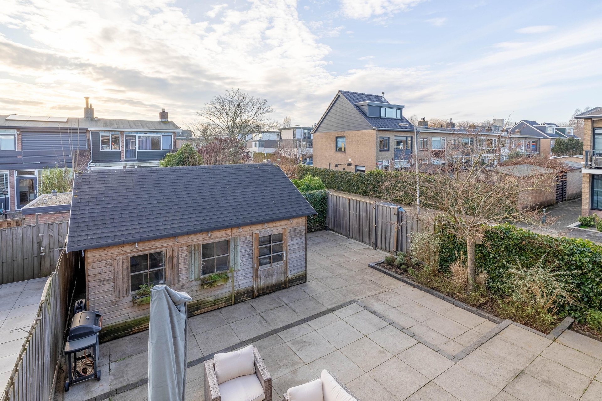 Buiten is dit huis minstens zo aantrekkelijk. Door de hoekligging beschik je over een grote voor-, zij- en achtertuin met volop zon, dankzij de gunstige ligging op het zuidwesten. Er is altijd wel een plek in de zon of juist in de schaduw te vinden. Parkeren op eigen terrein is hier mogelijk en daarnaast is er een grote houten garage/schuur, ideaal voor opslag, hobby’s of fietsen.