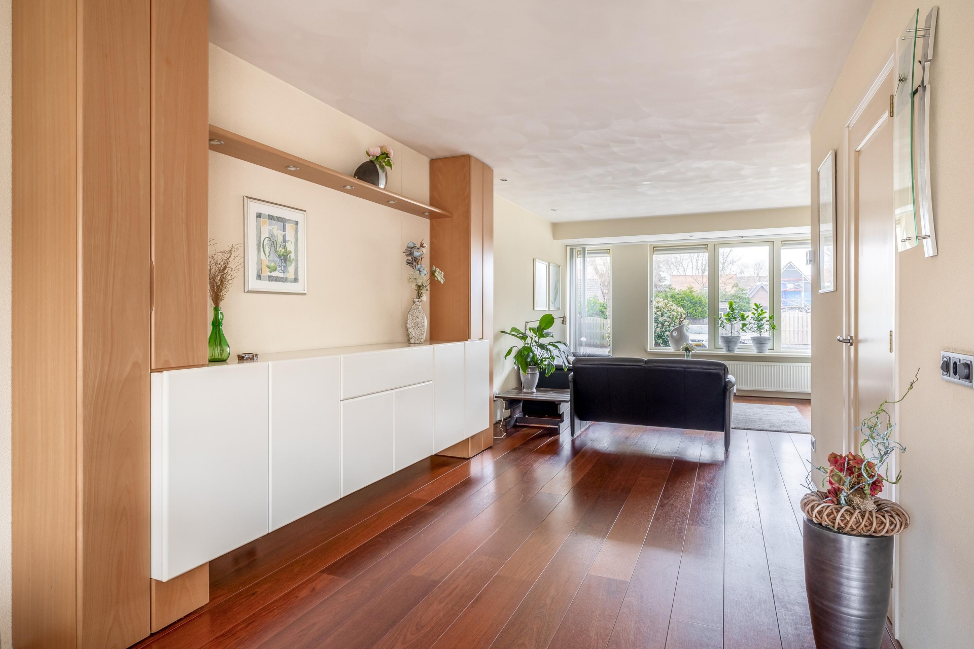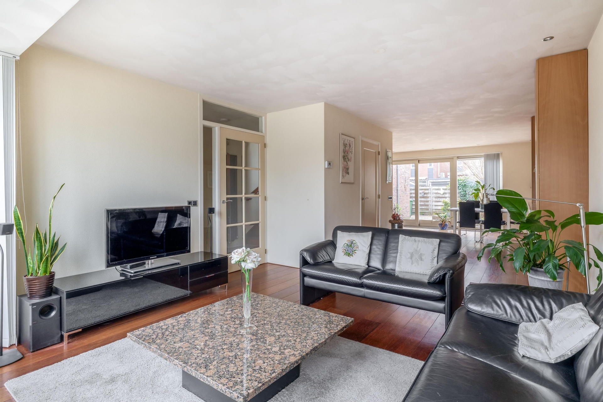 De woonkamer is ruim opgezet en profiteert optimaal van de grote raampartijen aan zowel de voor- als achterzijde. Hierdoor valt het daglicht rijkelijk naar binnen en voelt de leefruimte de hele dag door aangenaam. Er is volop ruimte voor een royale zithoek en een grote eettafel, waar je met gemak met het hele gezin of vrienden samenkomt.