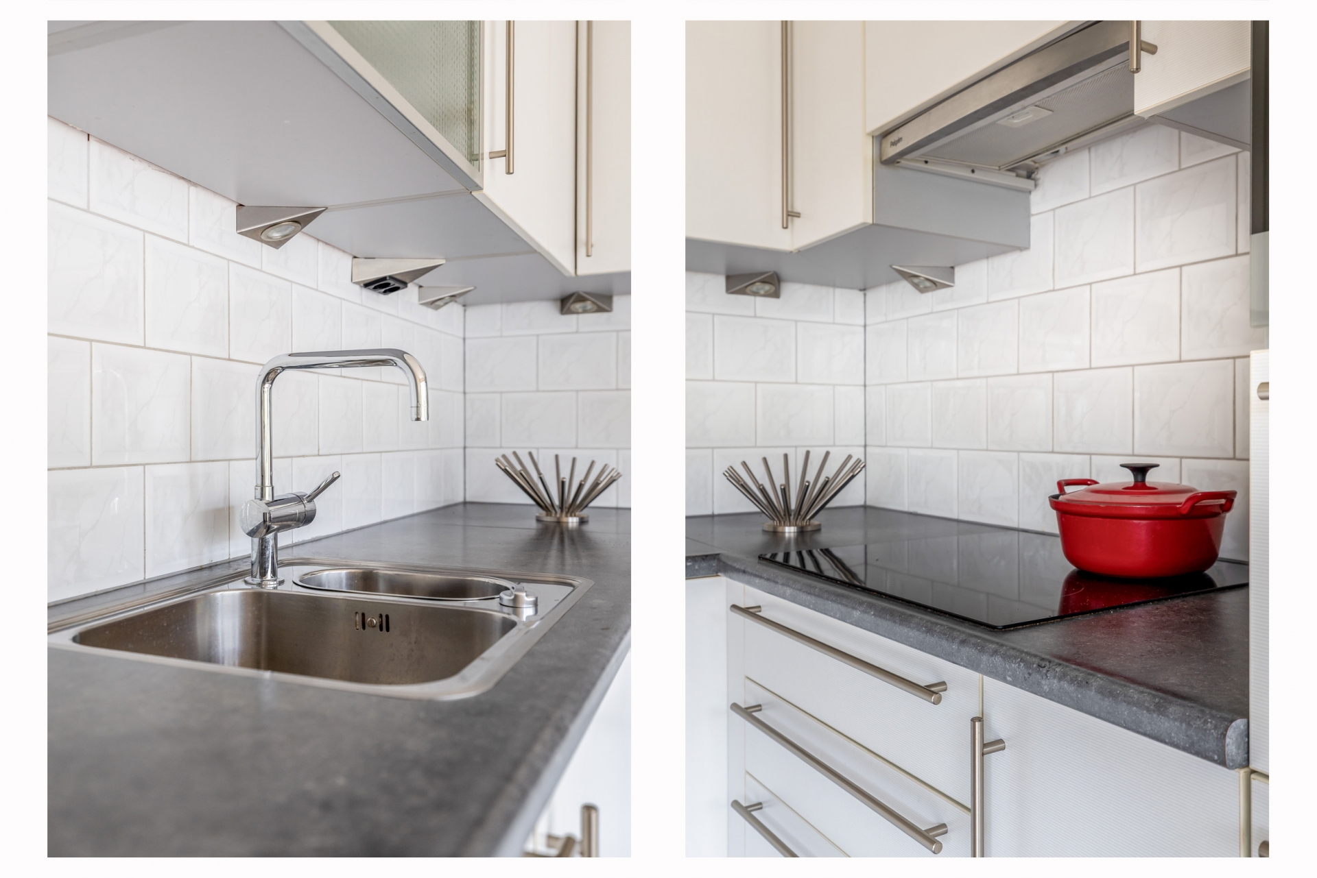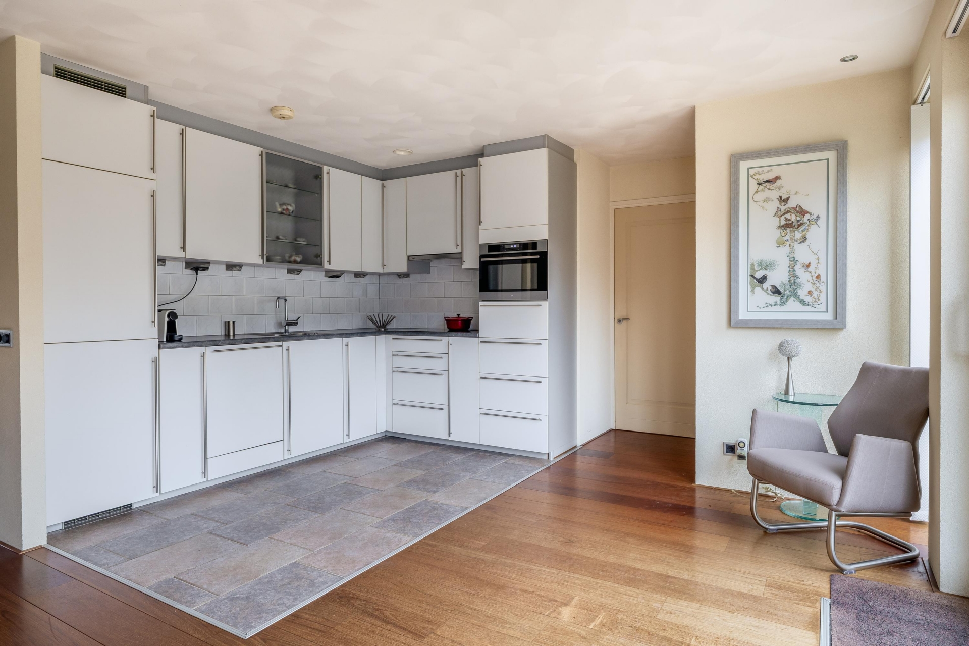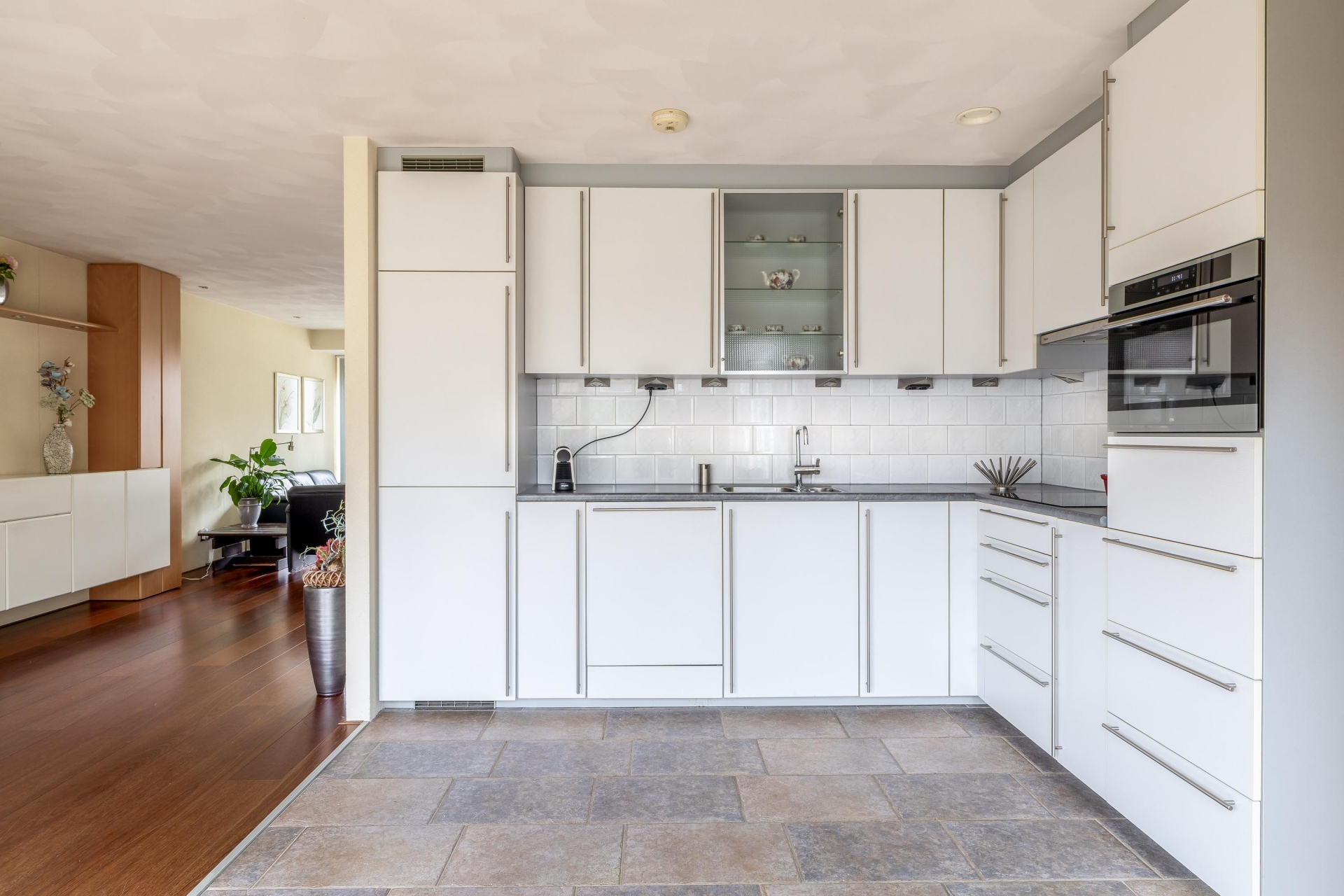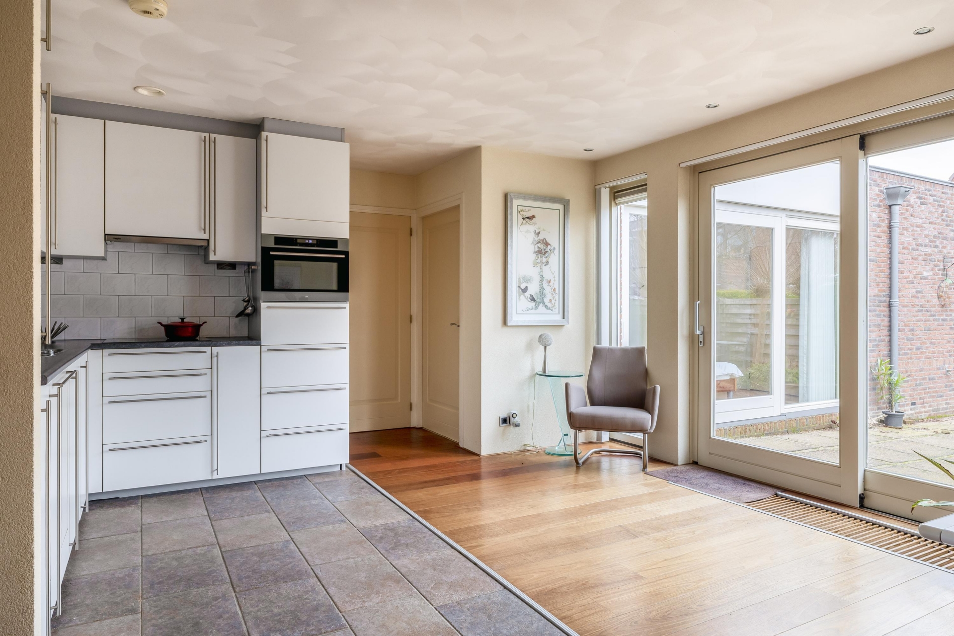 De halfopen woonkeuken sluit hier naadloos op aan. Deze opstelling zorgt voor een fijne verbinding tussen koken, eten en wonen, zonder dat alles volledig open is. Vanuit de keuken is er een directe doorloop naar de tuin, wat het dagelijks gebruik extra comfortabel maakt. De keuken is praktisch ingericht en biedt een goede basis om naar eigen smaak verder te moderniseren.