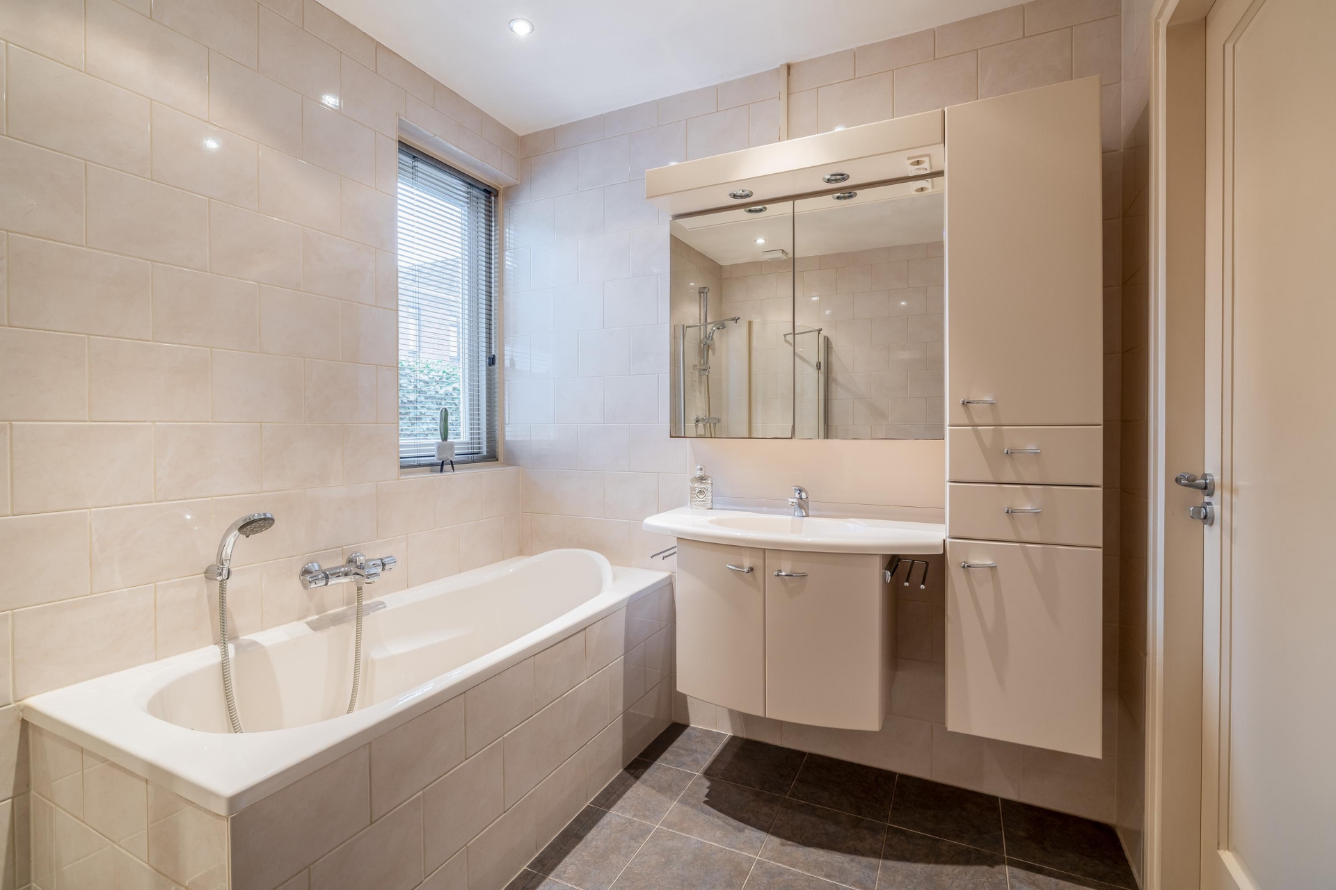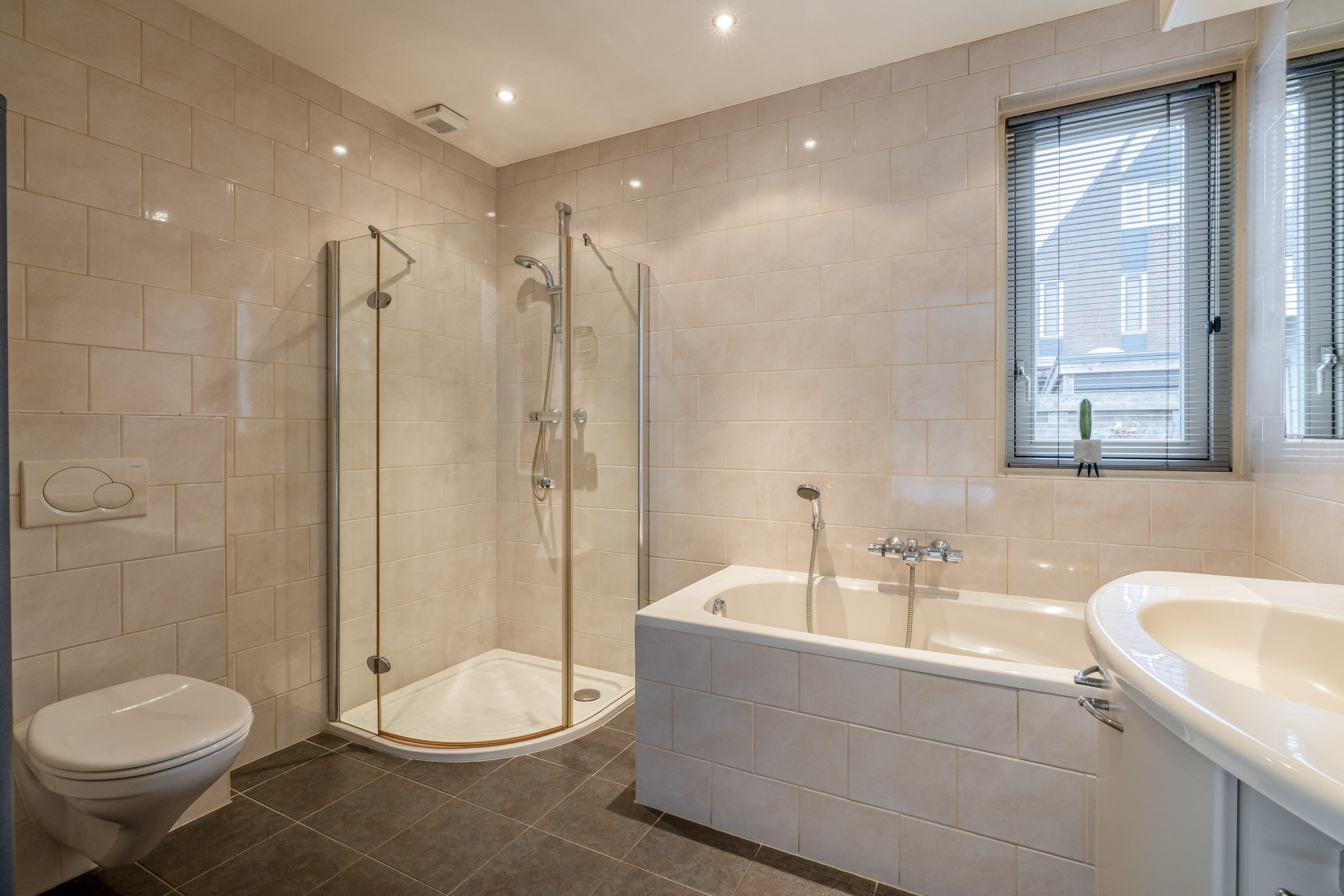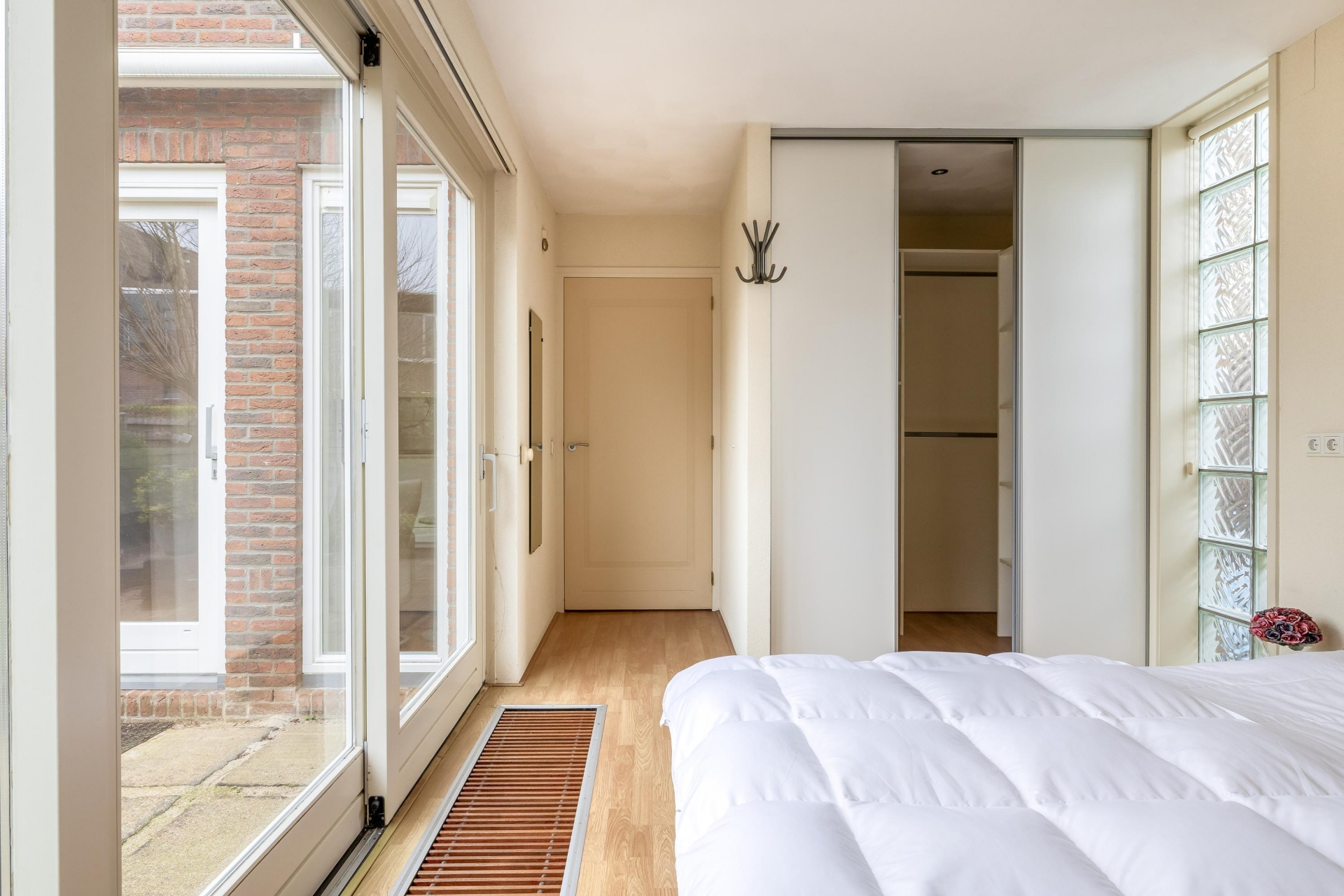 Een groot pluspunt van dit huis, zijn de 2 kamers op de begane grond, gecombineerd met een badkamer en separaat toilet. De kamer aan de tuinzijde is uitstekend te gebruiken als slaapkamer, waardoor het huis levensloopbestendig is. Vanuit deze slaapkamer met inloopkast loop je zo de luxe badkamer met ligbad, aparte douche, wastafel in toilet in.