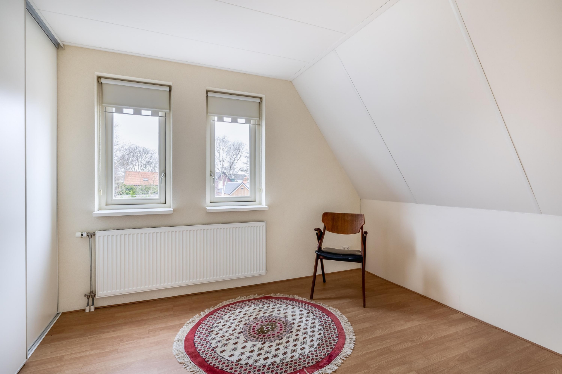 Op de verdieping bevinden zich nog twee goed bemeten slaapkamers. De grootste kamer leent zich uitstekend als comfortabele hoofdslaapkamer, terwijl de tweede kamer ideaal is als kinder-, werk- of logeerkamer. De overloop is ruim en overzichtelijk, wat opnieuw de praktische indeling van het huis onderstreept.