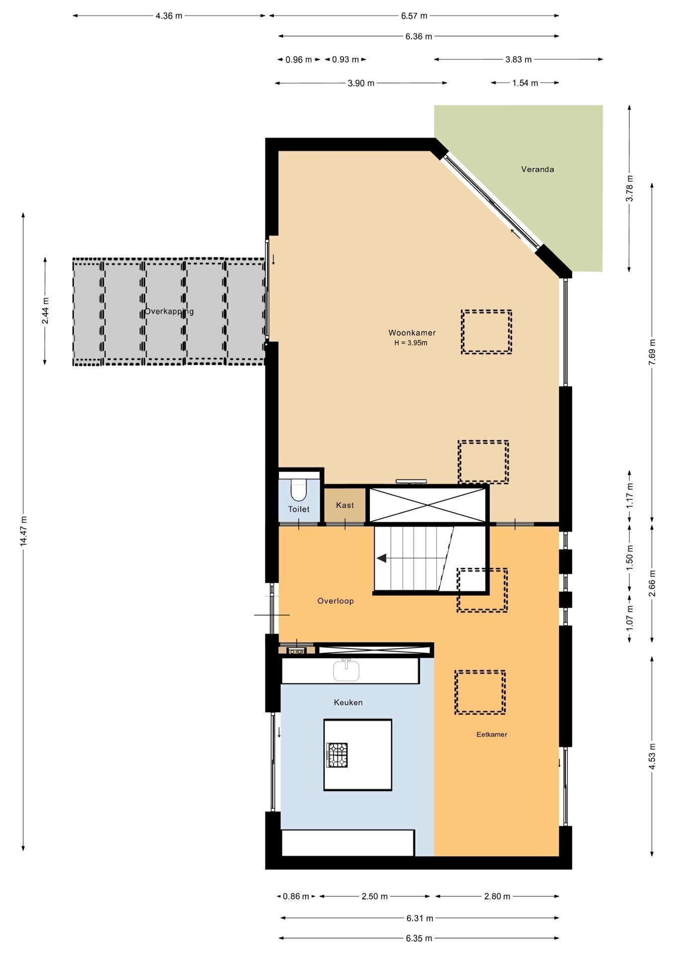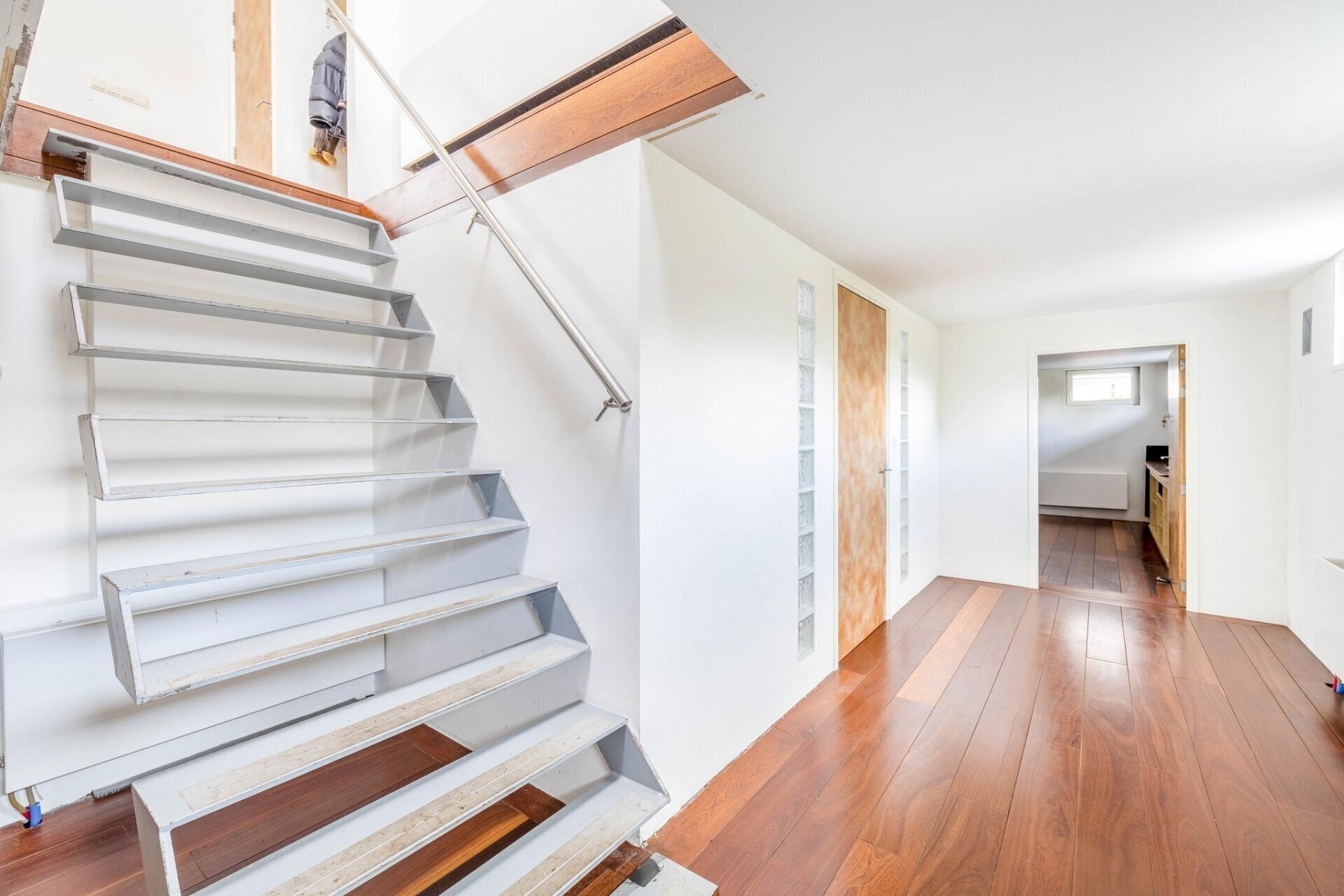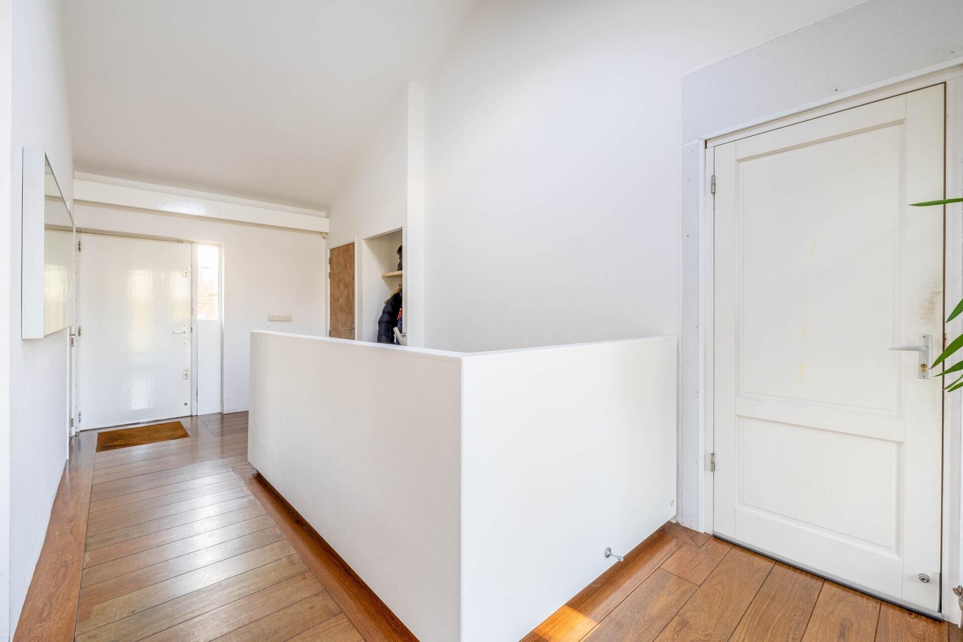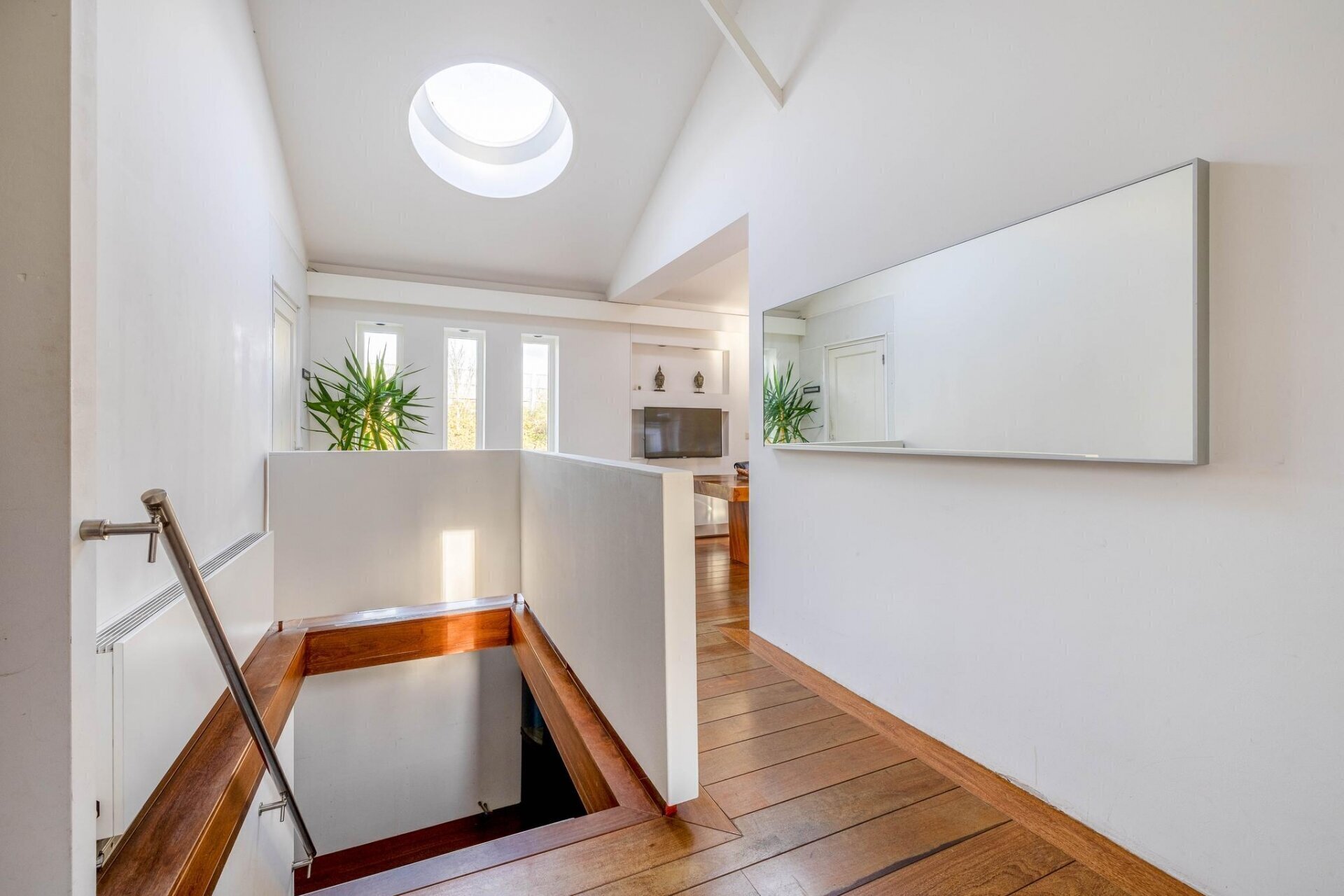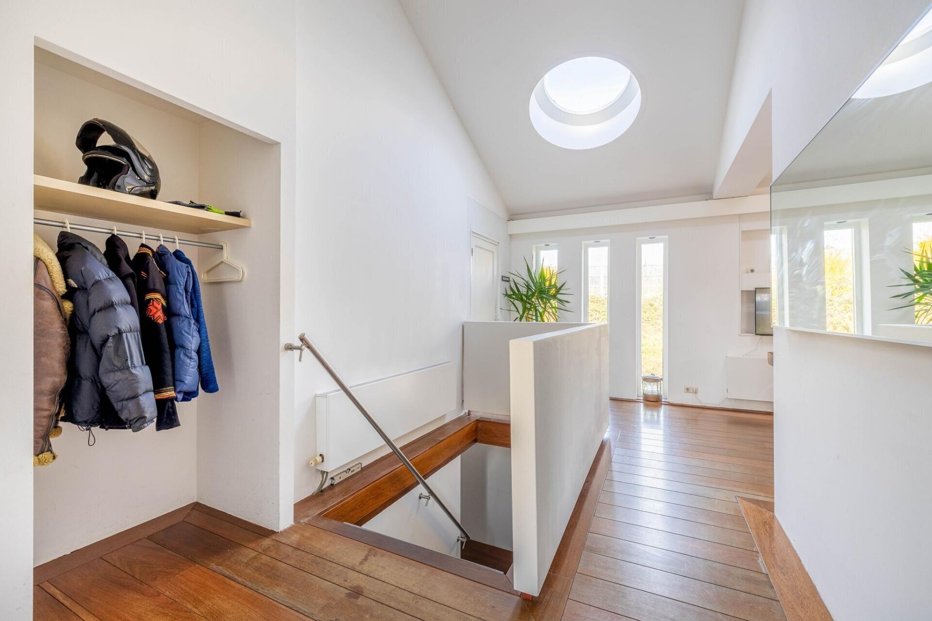 Bij binnenkomst word je direct omarmd door een zee van licht en ruimte. De hal met grote ramen laat het daglicht overvloedig binnenstromen en geeft toegang tot alle vertrekken op de bovenverdieping. Links bevindt zich de royale woonkamer met een indrukwekkende nokhoogte van 3,90 meter. Schuifdeuren leiden naar zowel een terras aan de voorzijde als een balkon en terras aan de achterzijde.