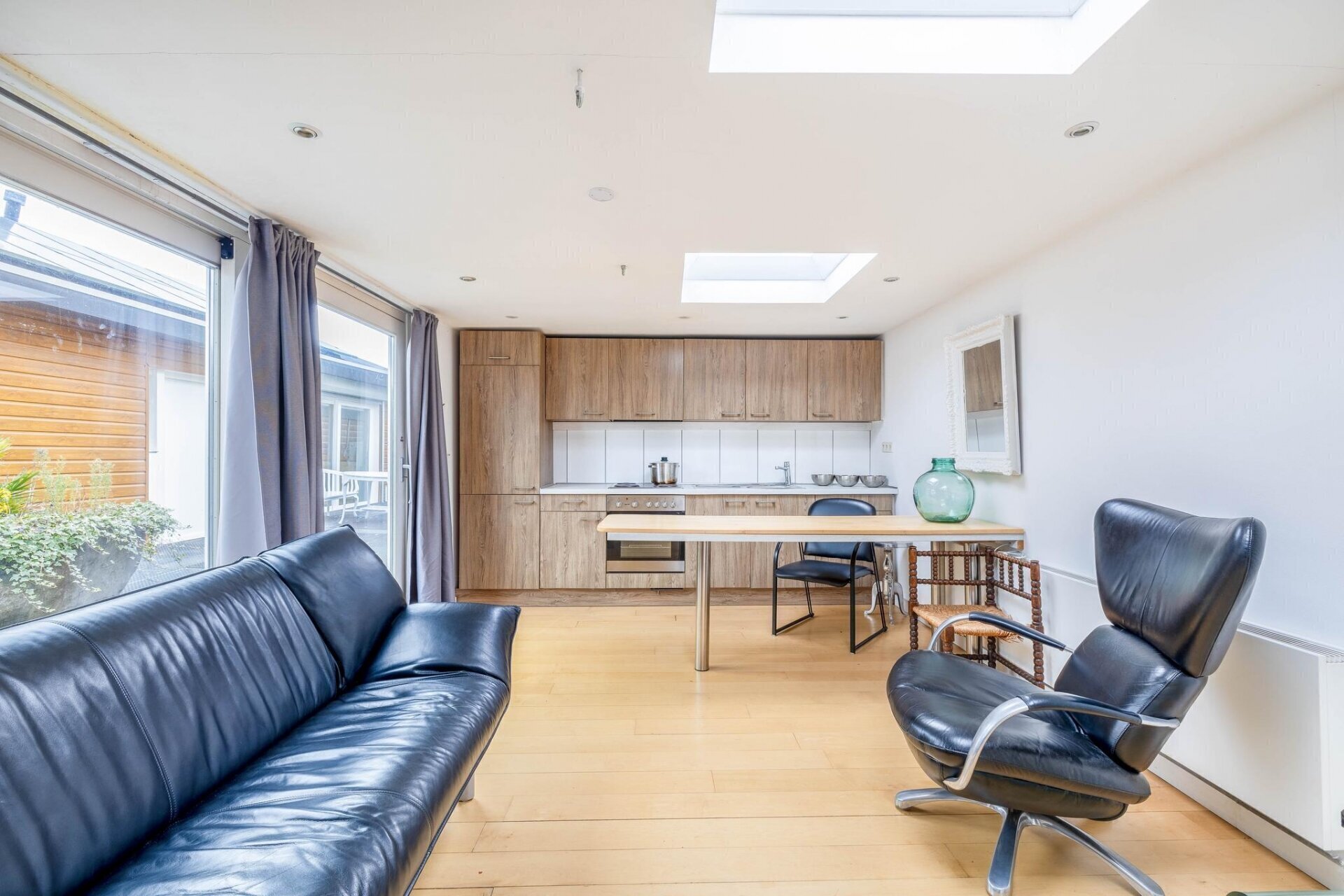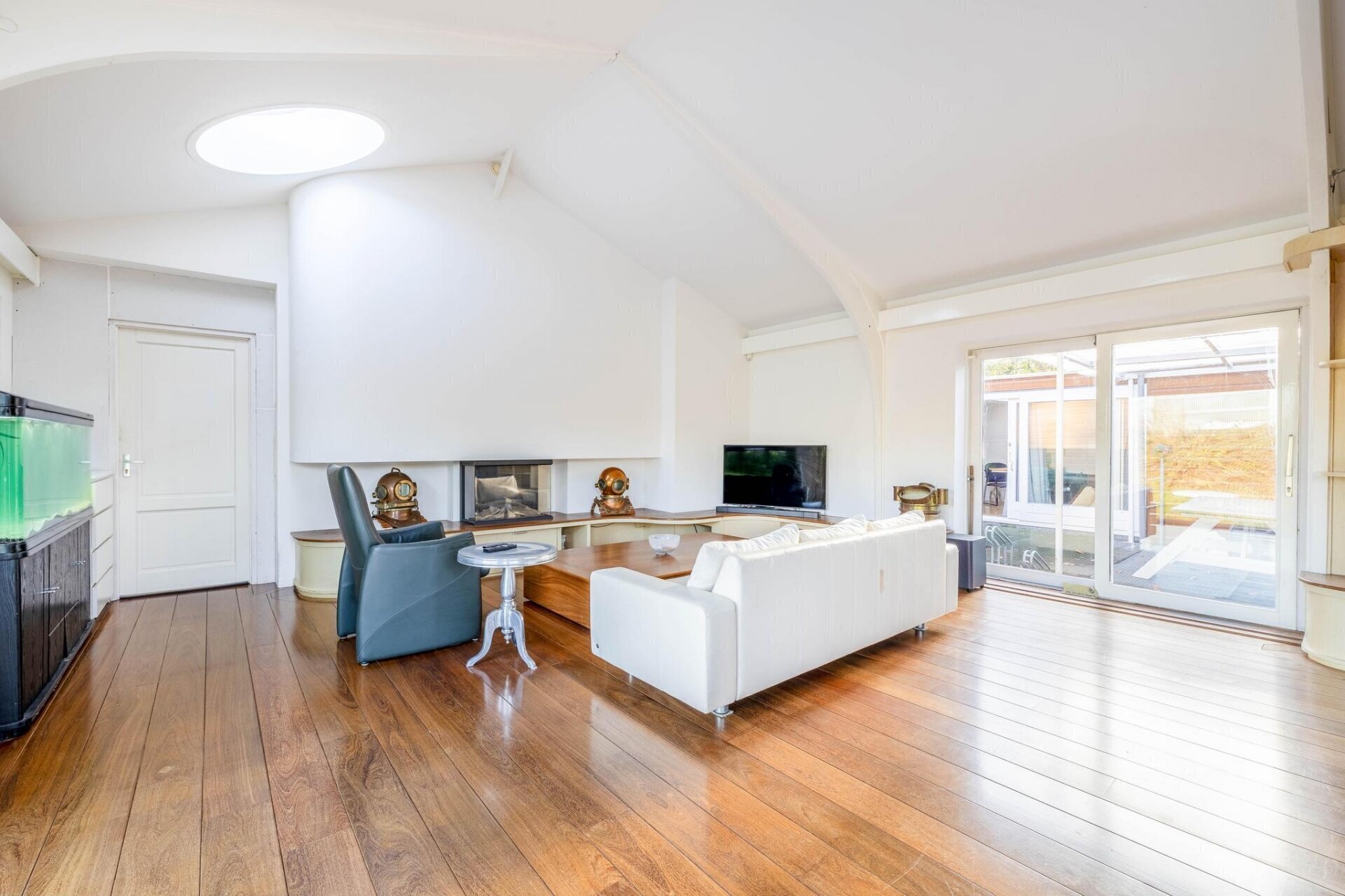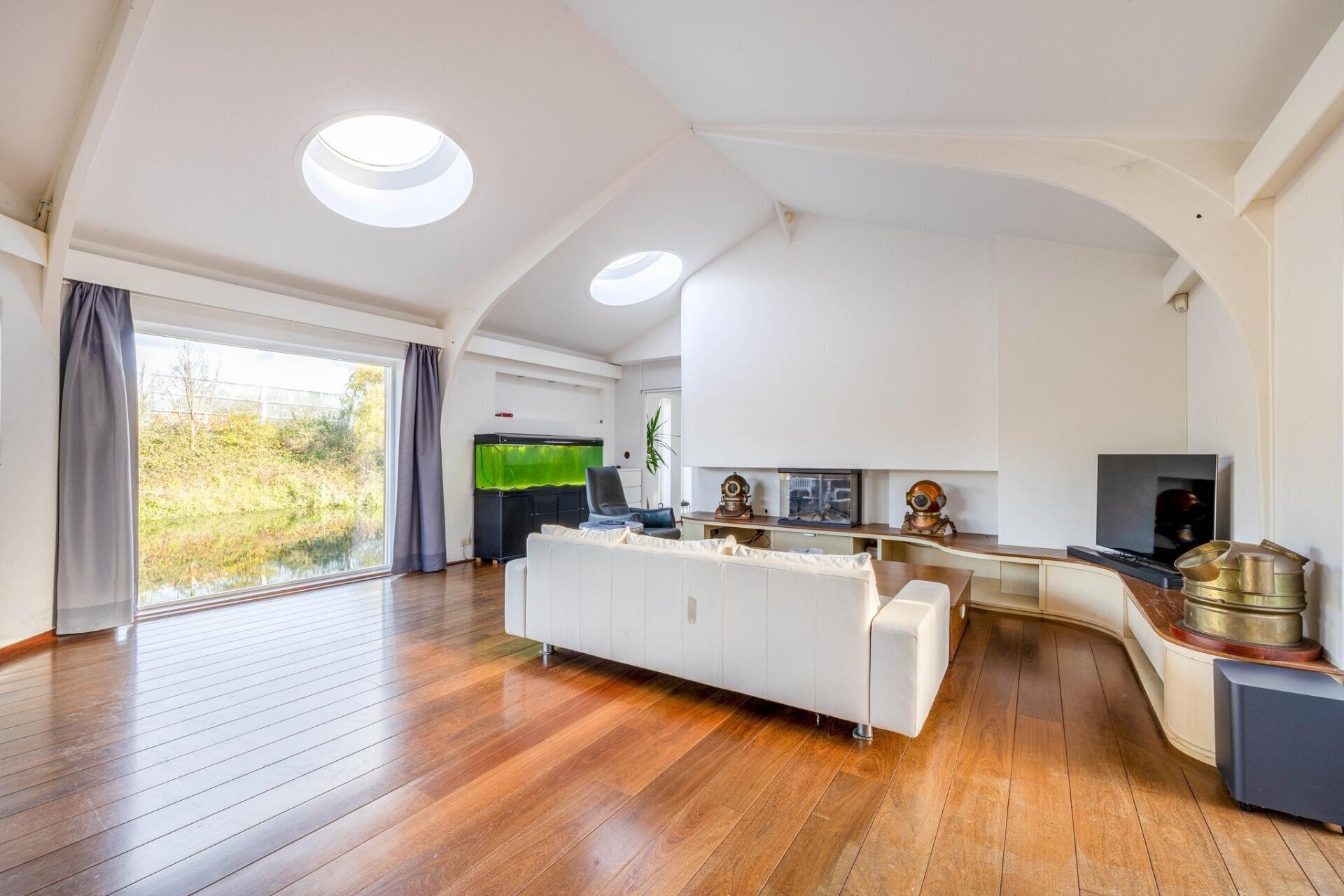 De woonkamer straalt warmte en sfeer uit, mede dankzij de stijlvolle gashaard. De massief Coumarou-hardhouten vloer versterkt de nautische charme van de ark, terwijl de strak gestucte wanden en plafonds zorgen voor een moderne, verfijnde uitstraling.