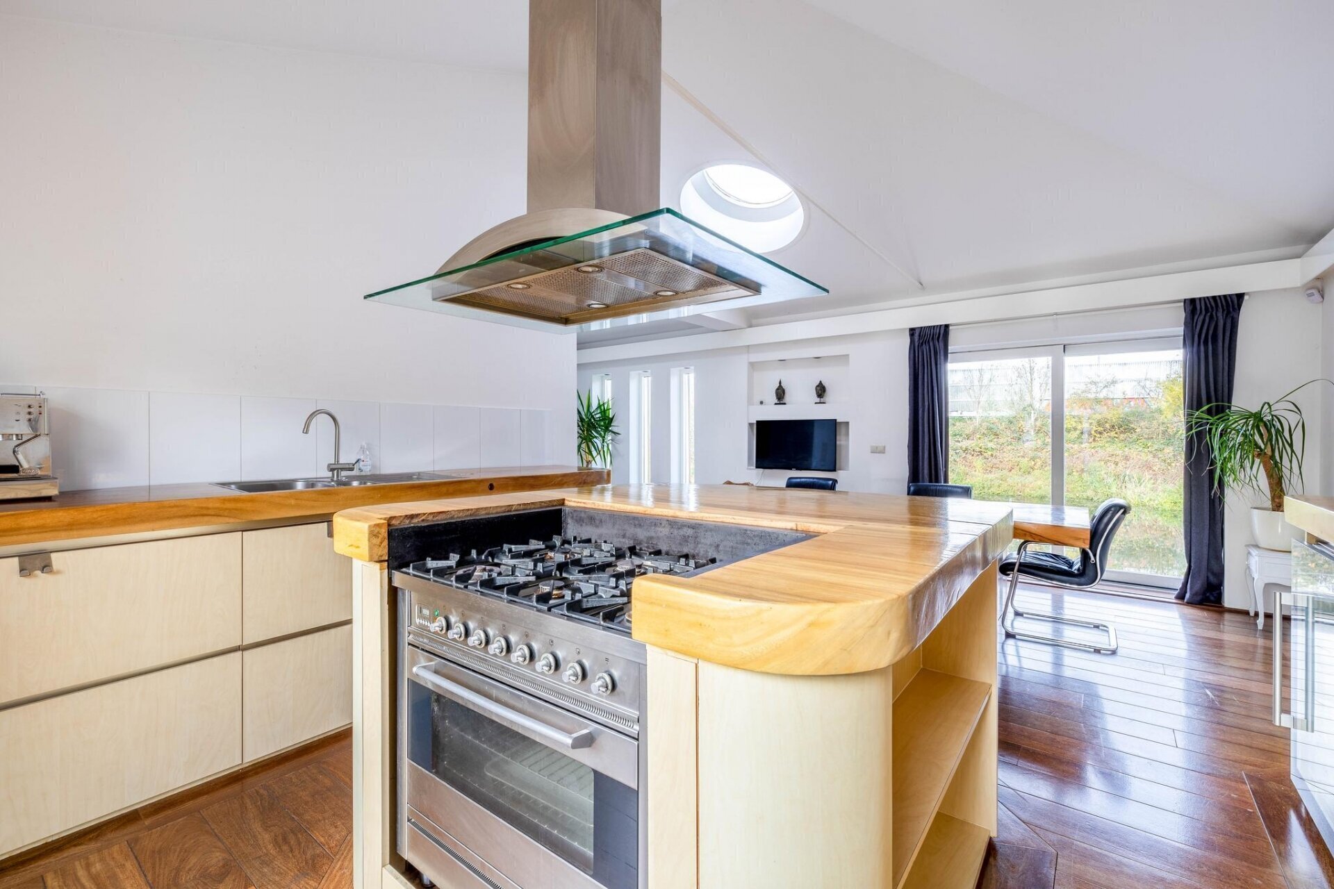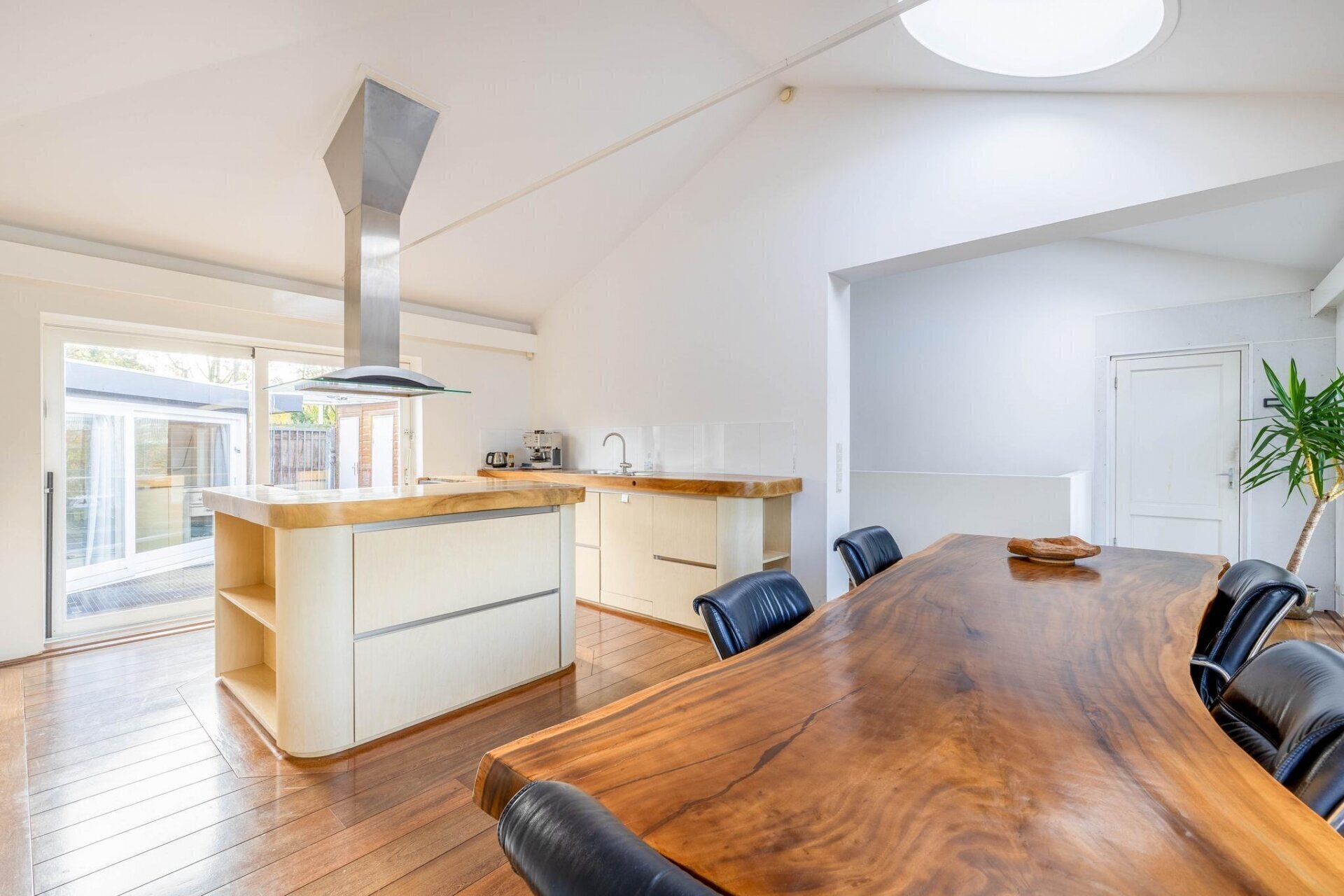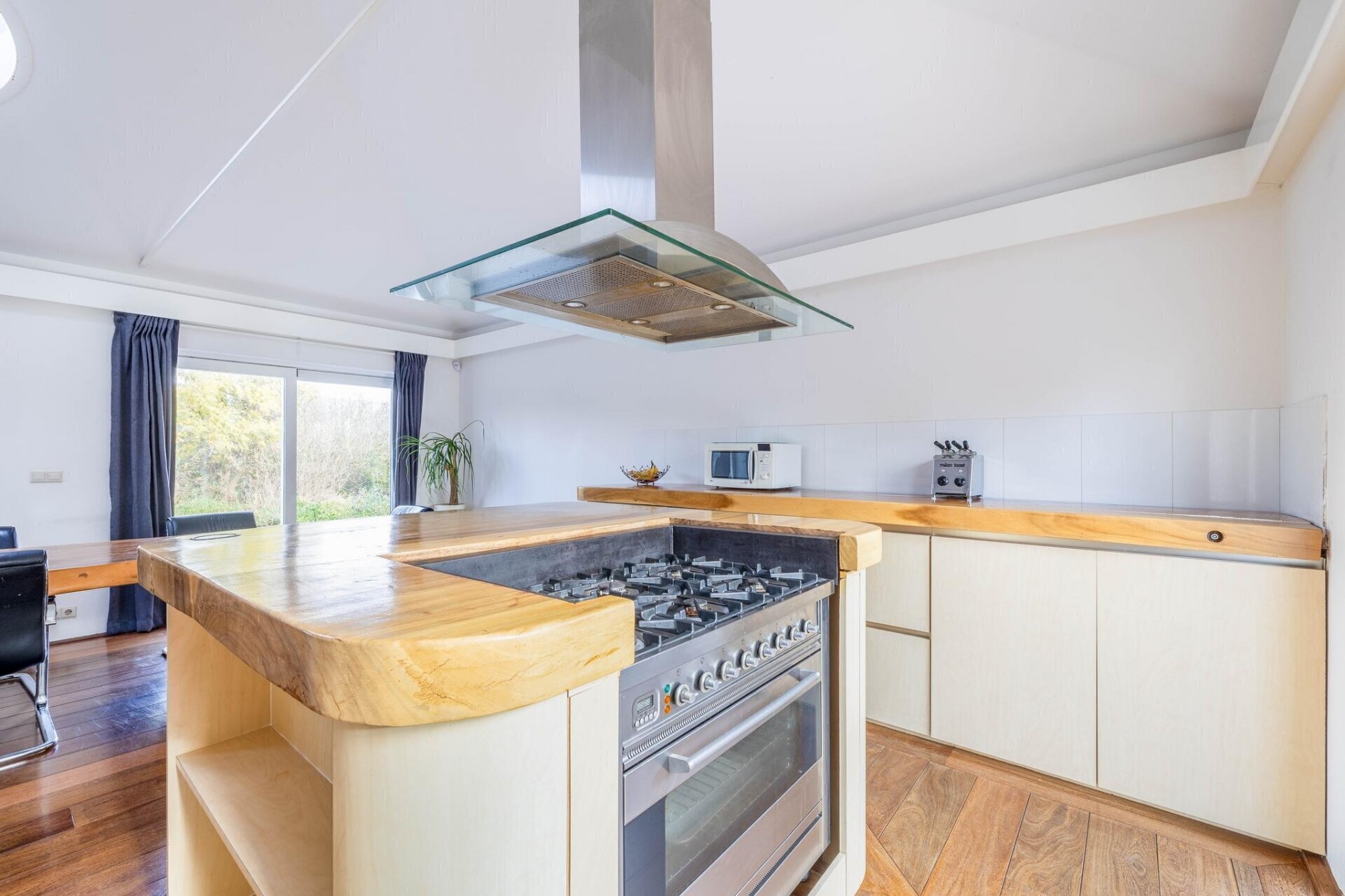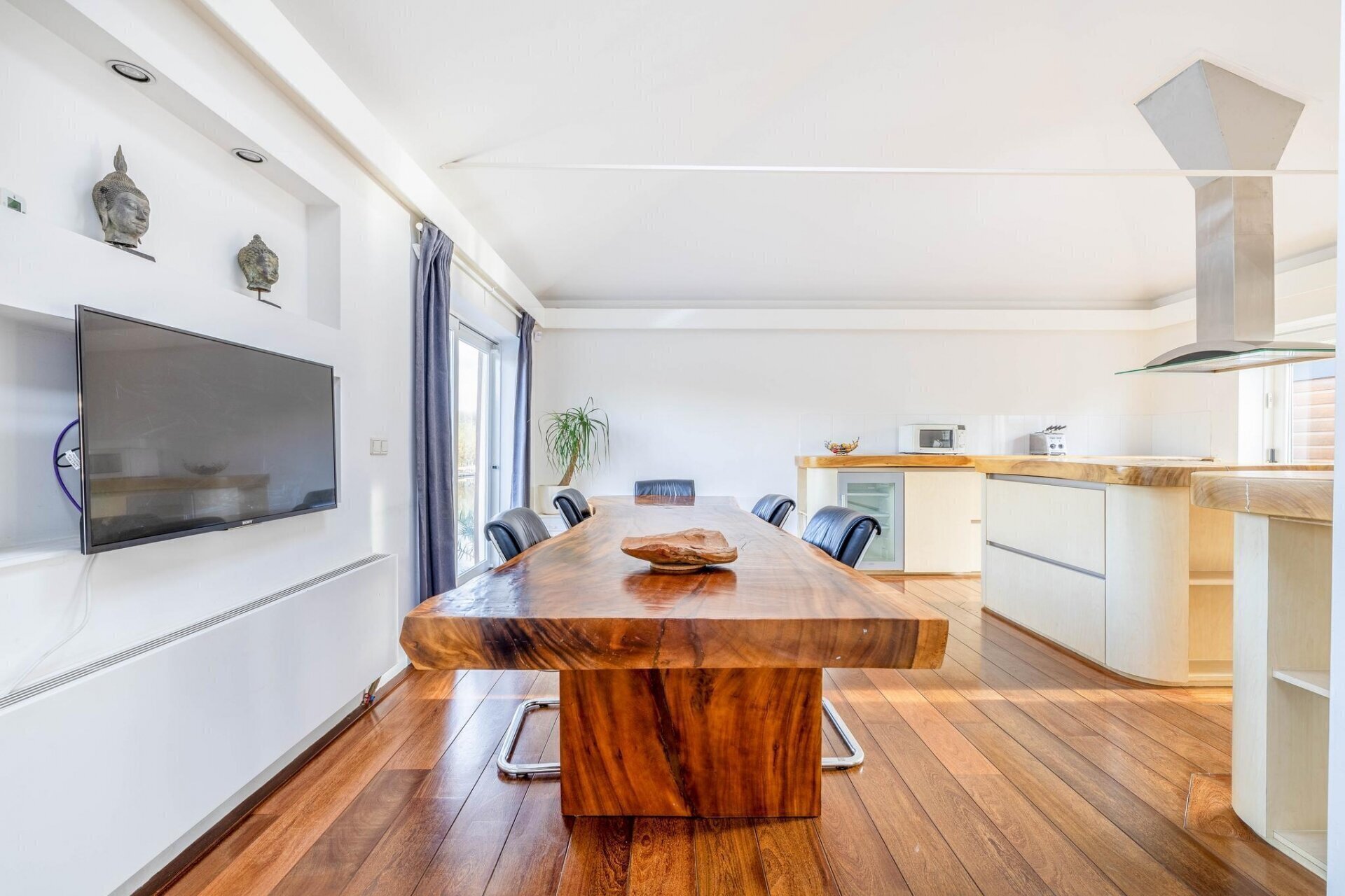 Rechts van de hal ligt de luxe woonkeuken, volledig uitgerust met hoogwaardige apparatuur en een 11 cm dik massief teakhouten werkblad. Vanuit de keuken stap je direct het zonnige terras op, perfect voor een ontbijt in de ochtendzon.