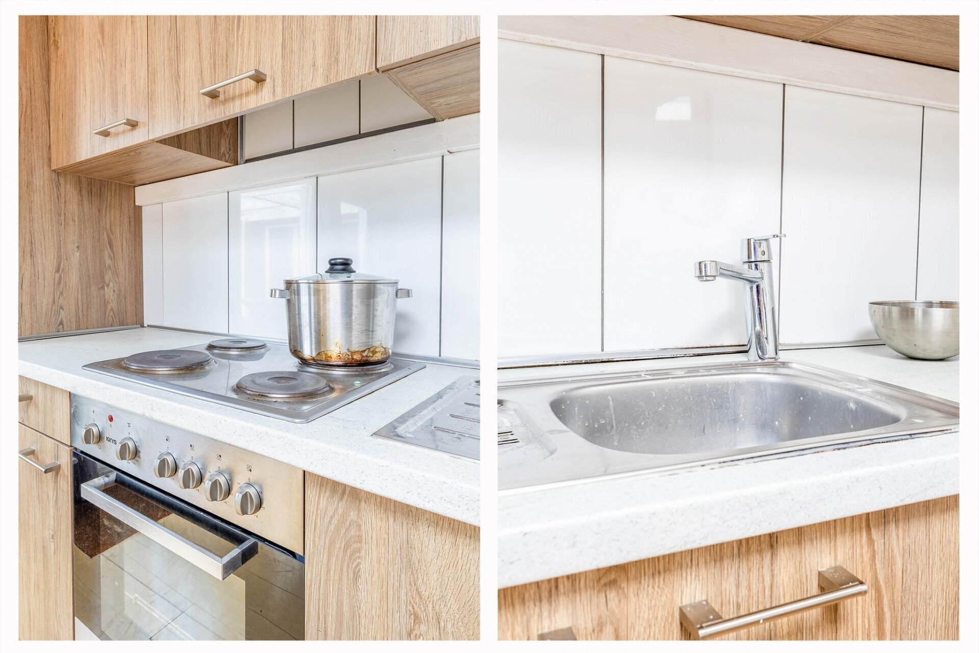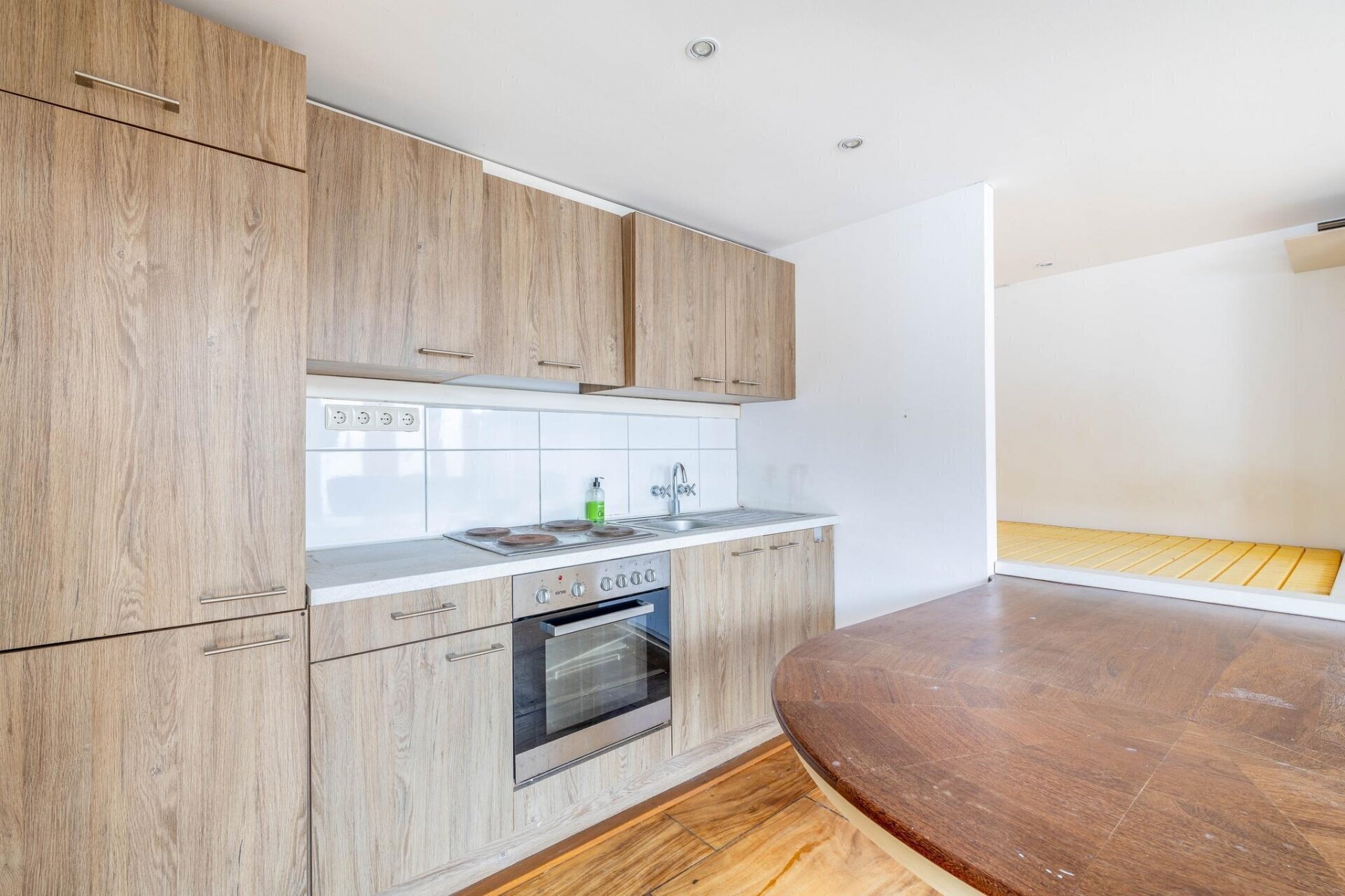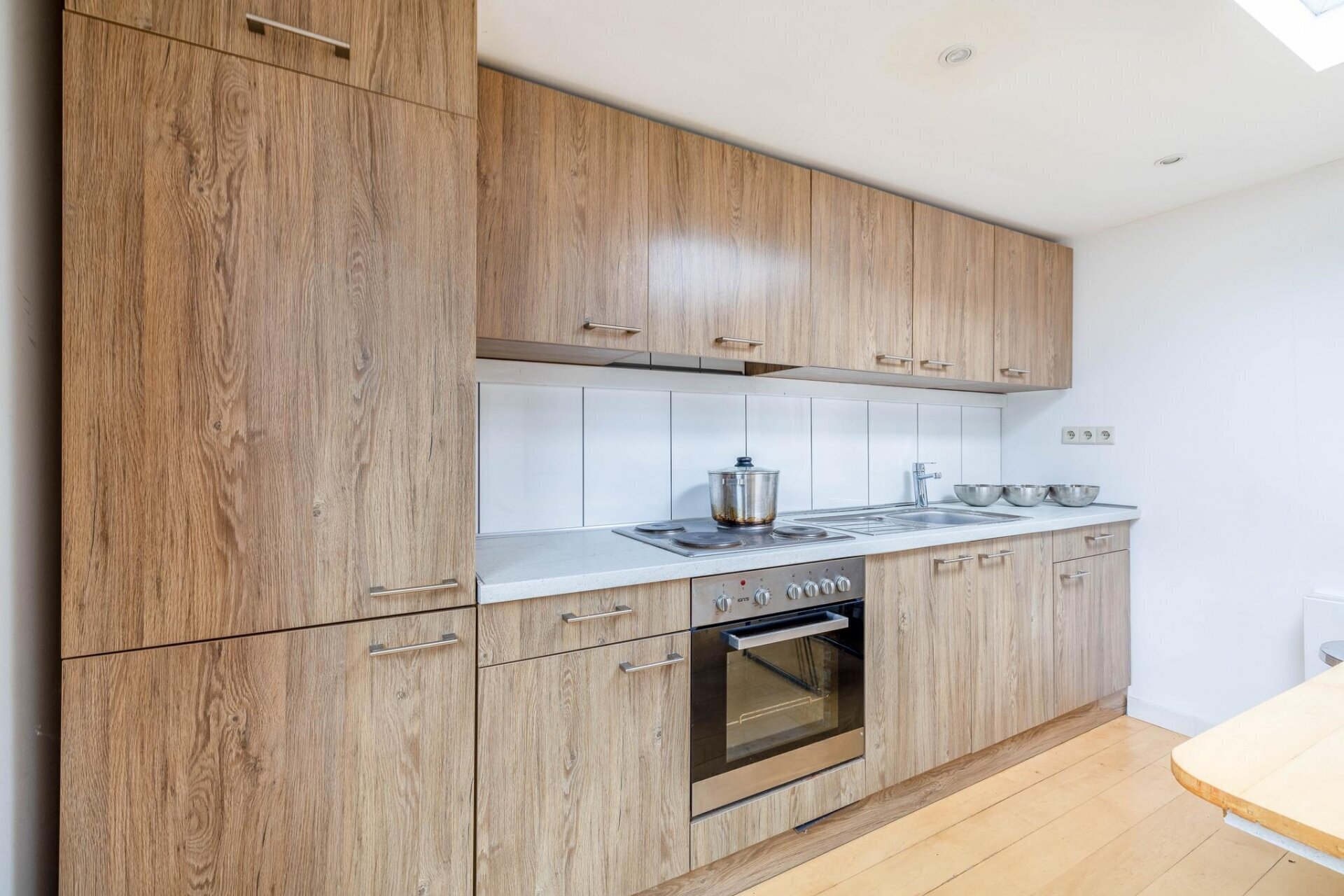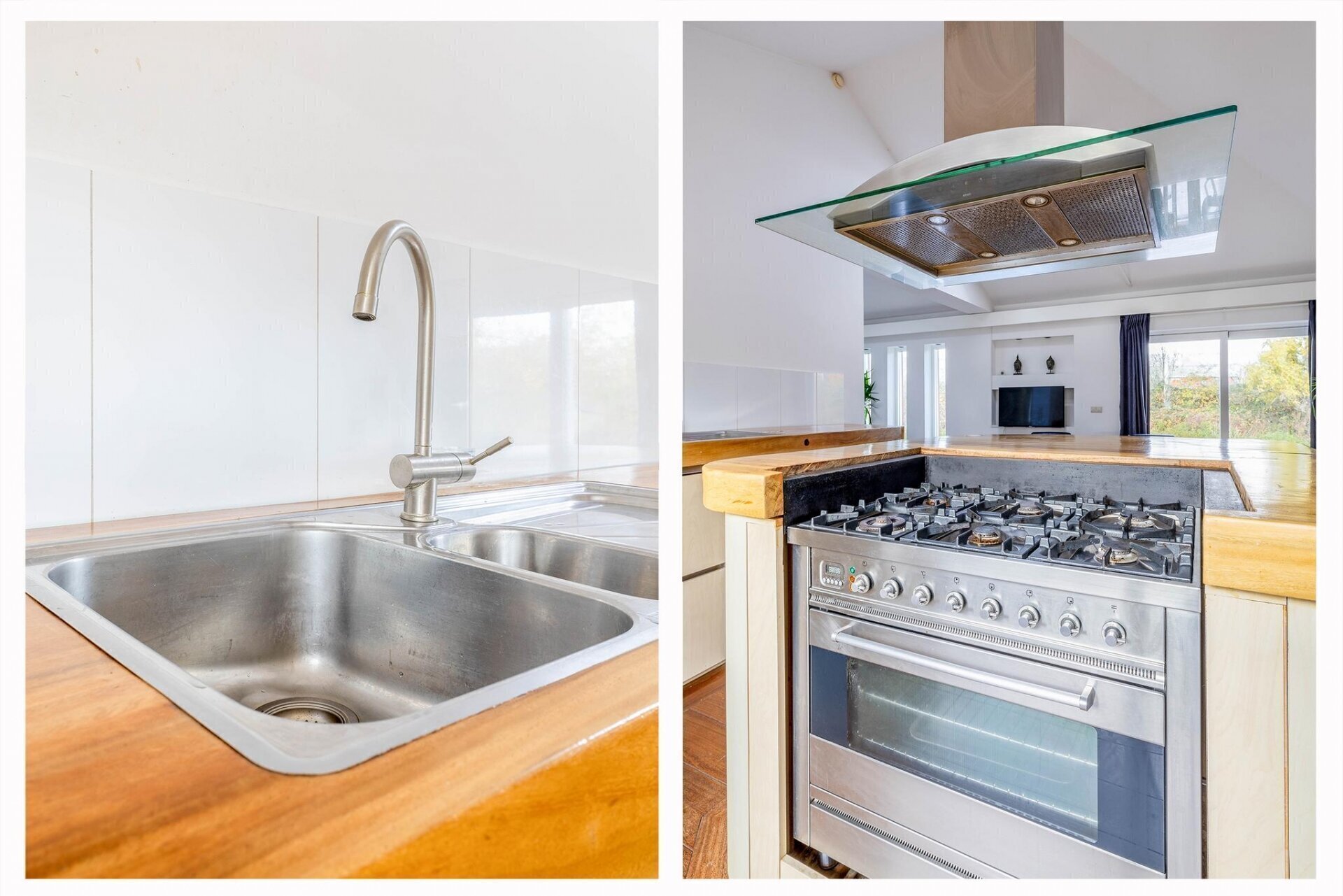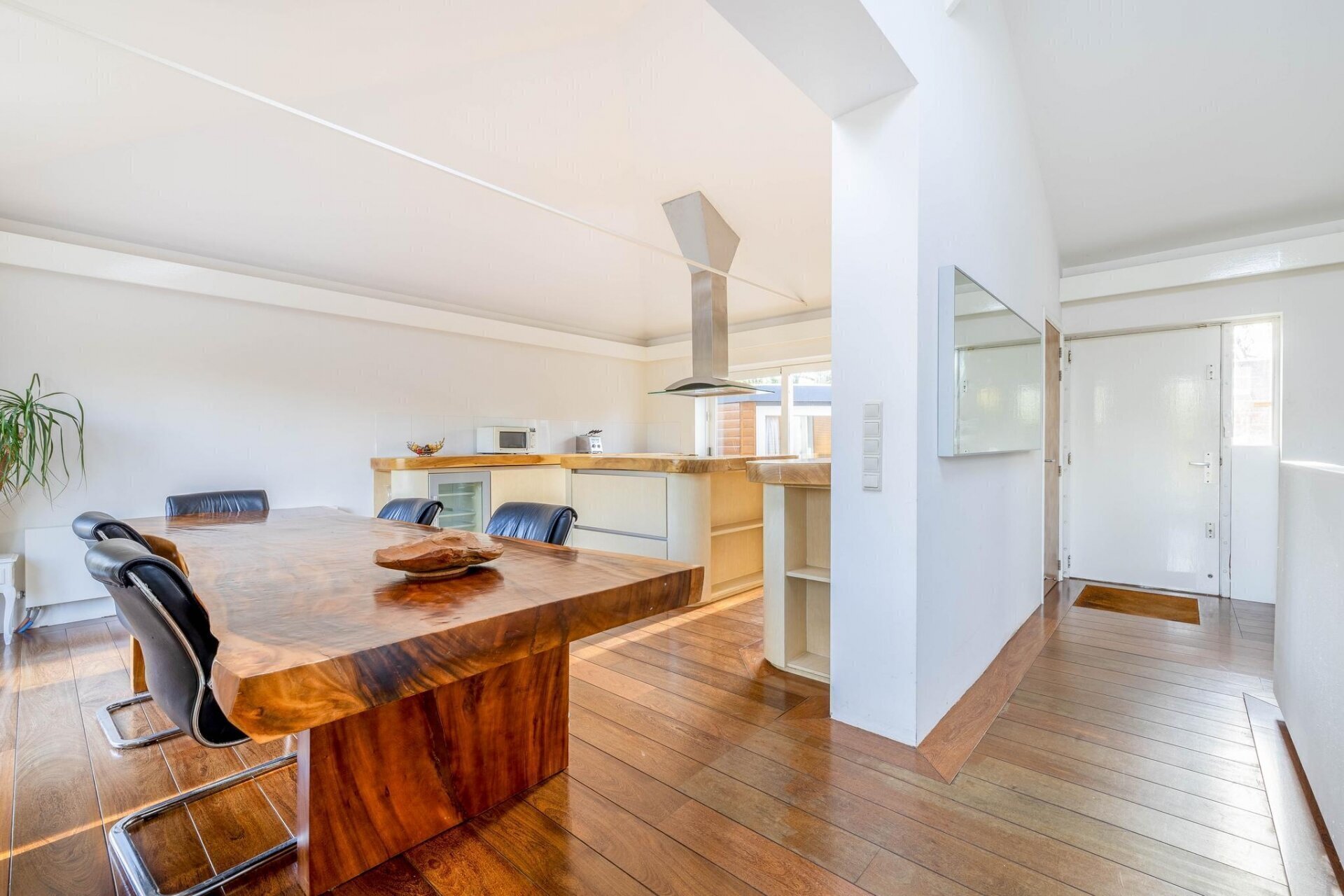 Rechts van de hal ligt de luxe woonkeuken, volledig uitgerust met hoogwaardige apparatuur en een 11 cm dik massief teakhouten werkblad. Vanuit de keuken stap je direct het zonnige terras op, perfect voor een ontbijt in de ochtendzon.