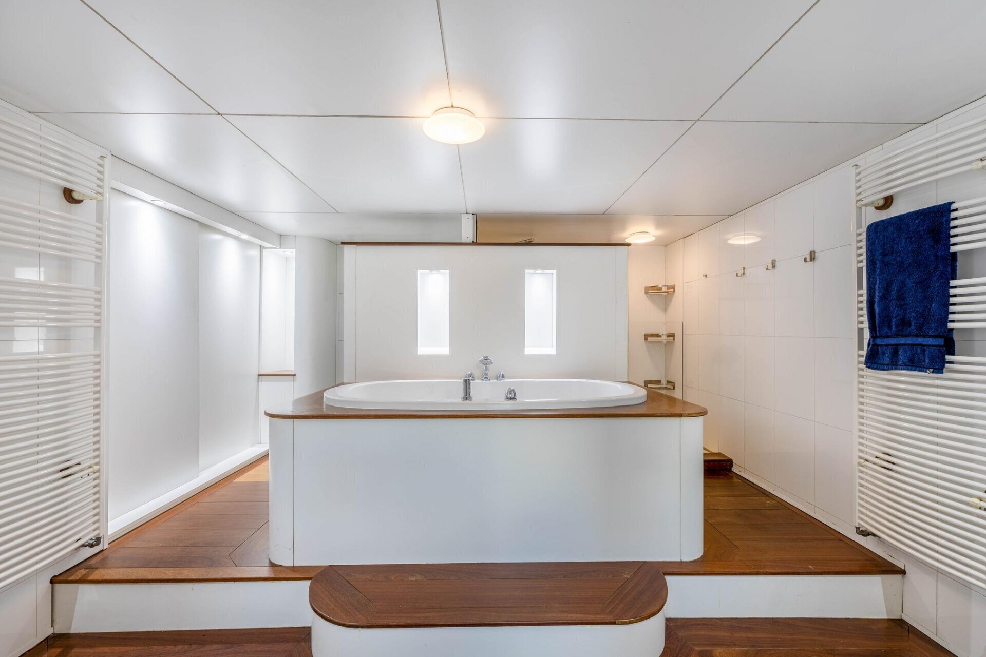 De trap vanuit de entreehal leidt naar het benedenverdieping, waar je een oase van rust vindt. Hier bevindt zich de royale hoofdslaapkamer met een ruime inloopkast en grote ramen die veel natuurlijk licht binnenlaten. De badkamer ademt een maritieme sfeer met tropisch hardhout, een inloopdouche, dubbele wastafels en een toilet.