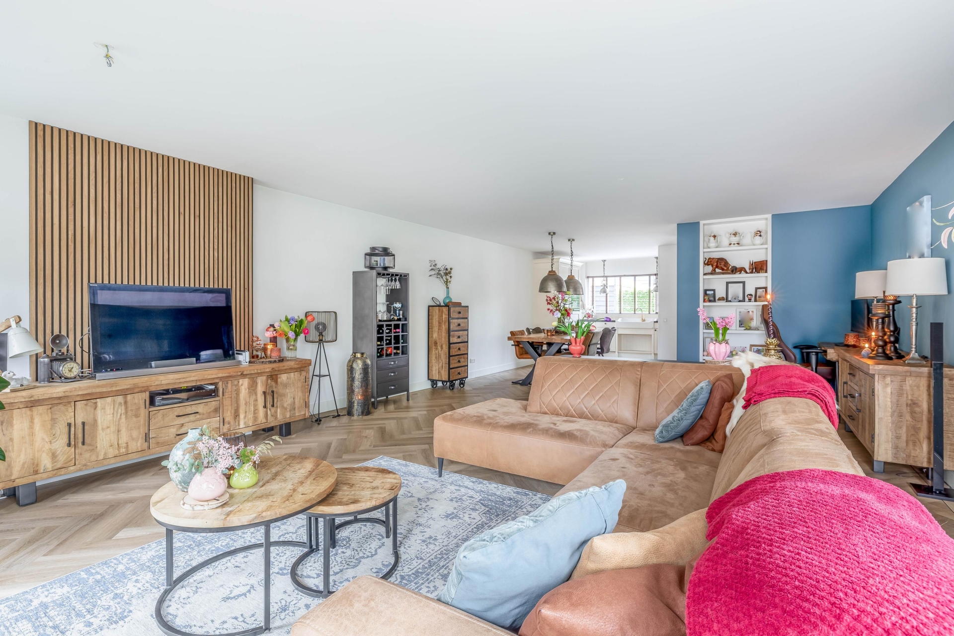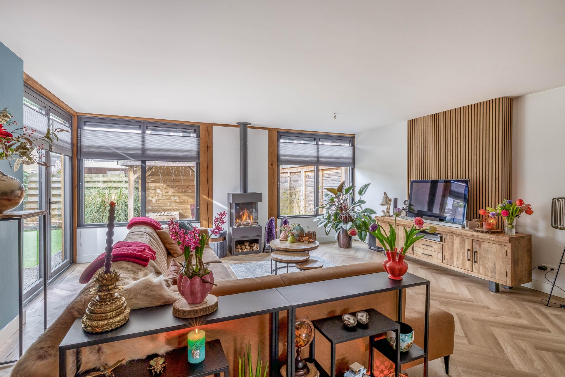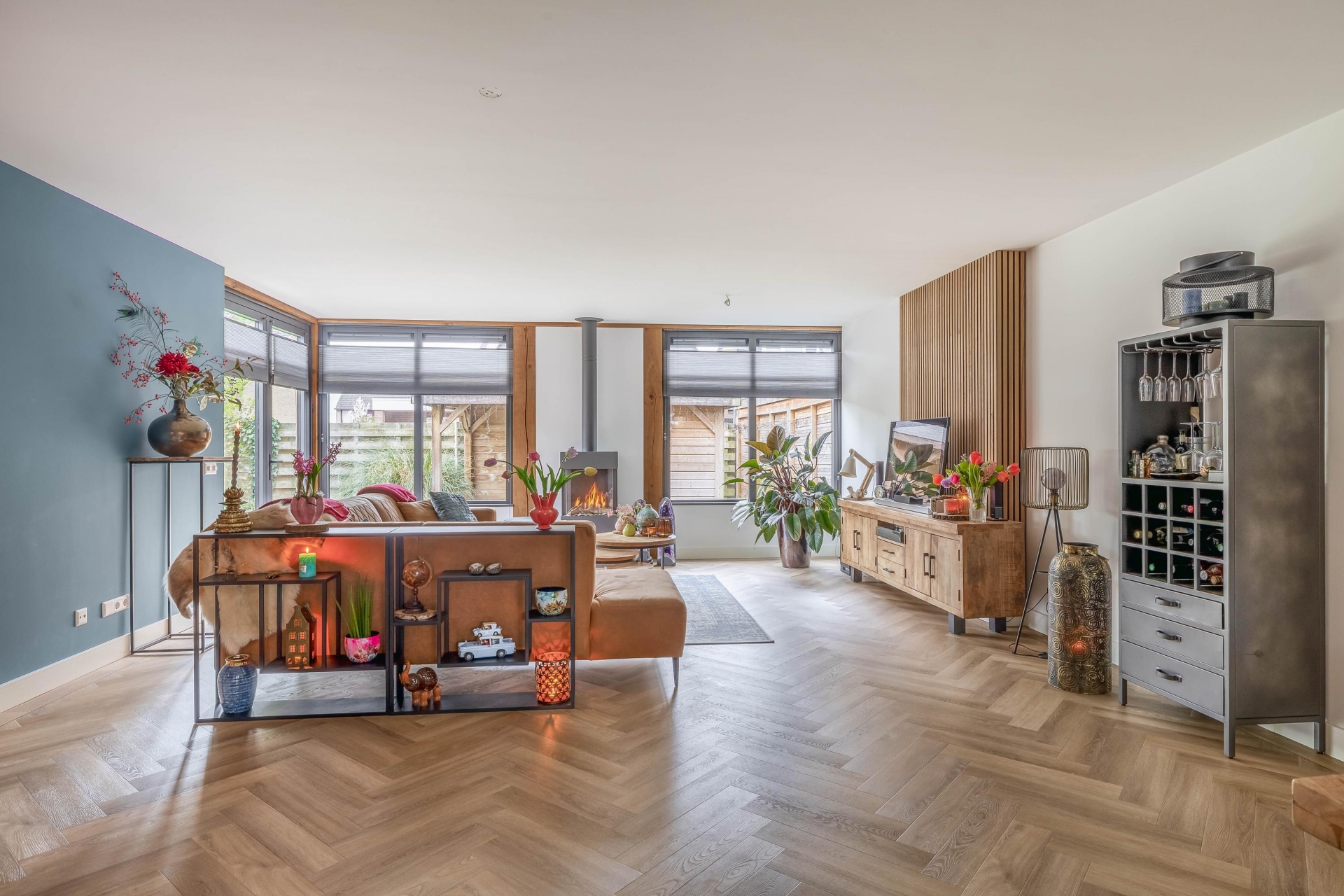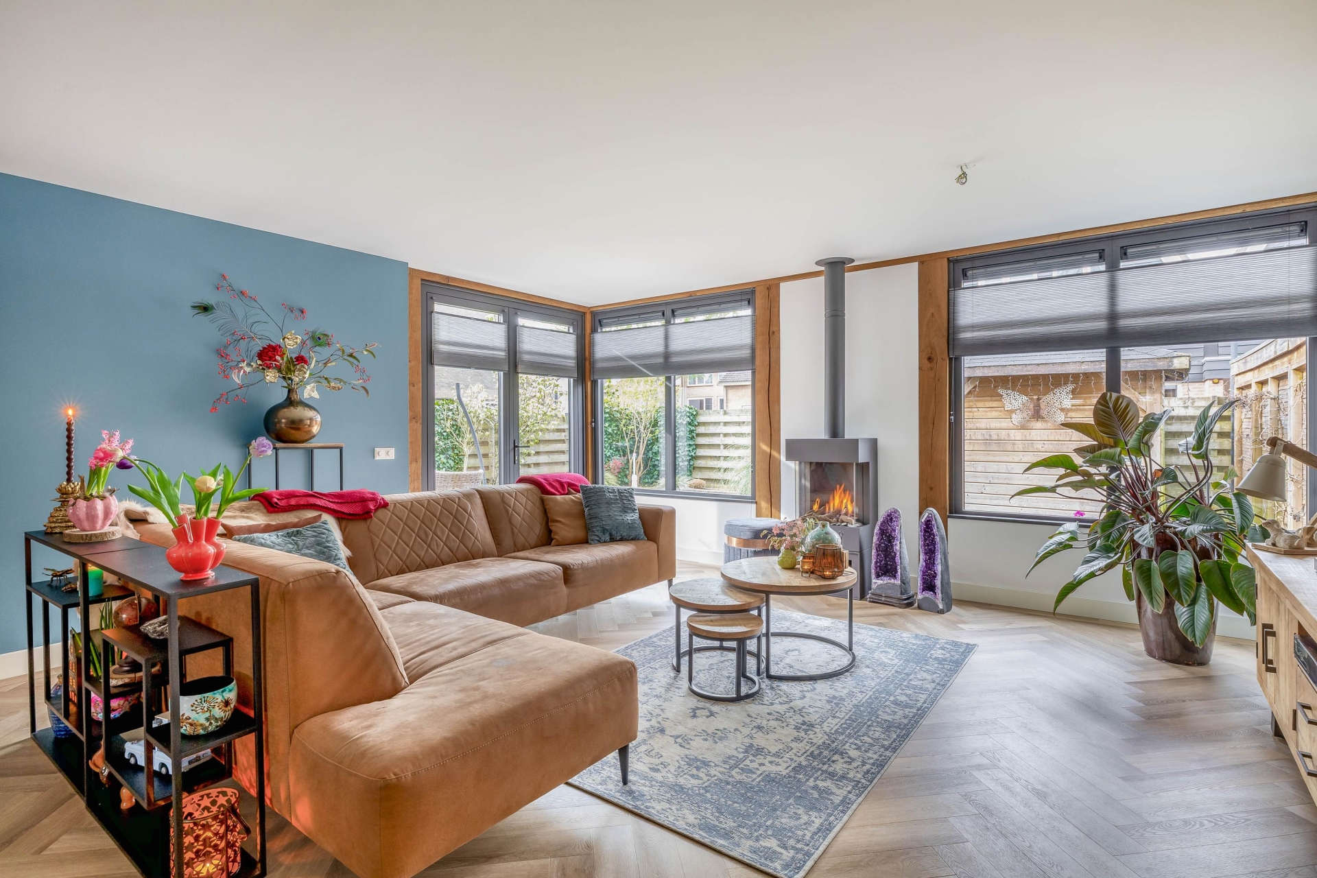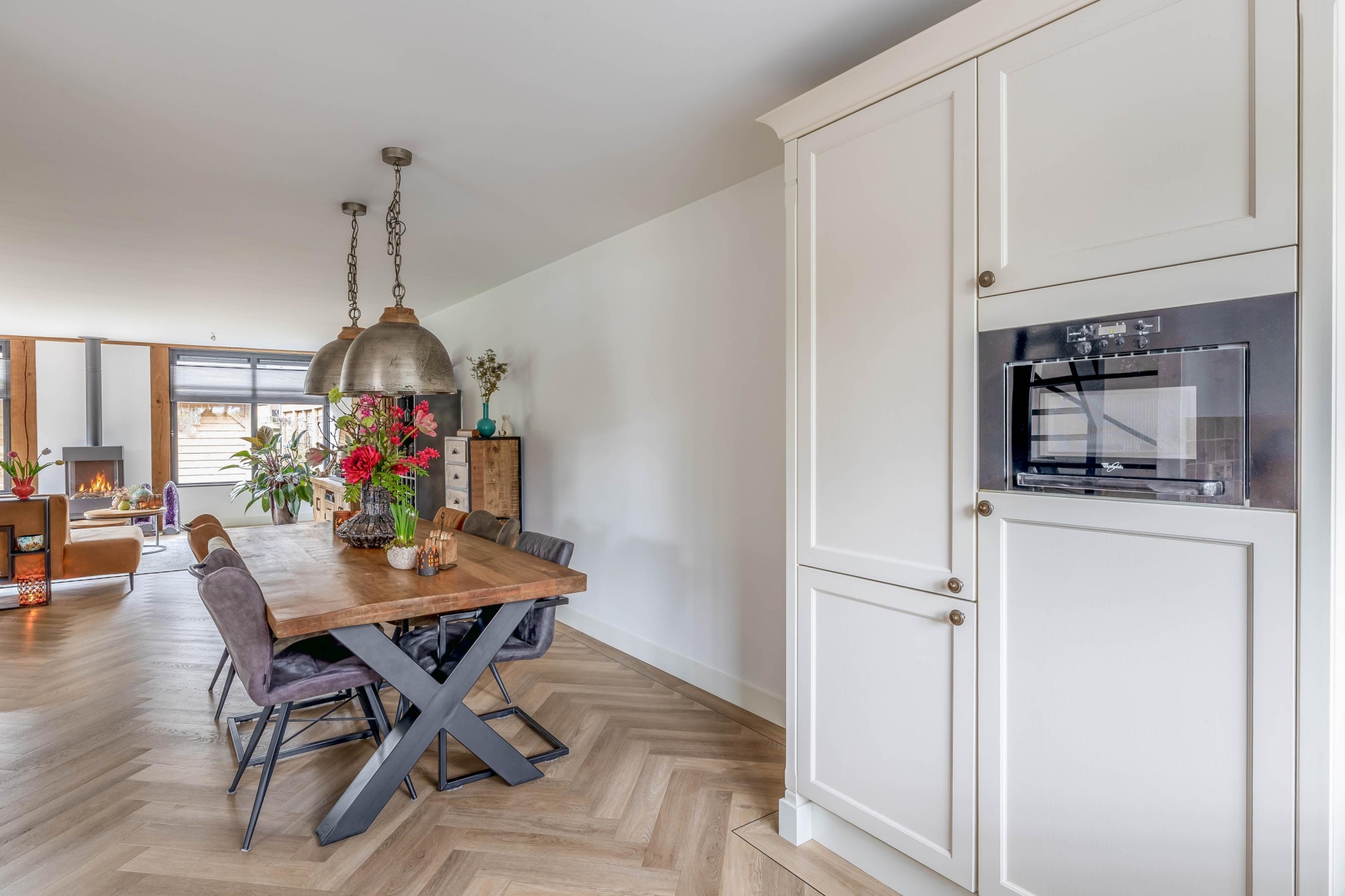 Zodra je binnenkomt valt direct op hoeveel ruimte en licht dit huis te bieden heeft. De woonkamer is aan de achterzijde uitgebouwd met een luxueuze uitbouw met aluminium kozijnen en prachtige, Franse eiken balken, wat zorgt voor een royale leefruimte met een prettige indeling. De grote raampartijen en de twee riante openslaande deuren naar de tuin laten het daglicht mooi naar binnen vallen en zorgen voor een fijne verbinding met buiten. De zithoek is ruim opgezet en sfeervol ingericht, met een moderne haard als centraal punt. Dit maakt het een heerlijke plek om te ontspannen, zowel overdag als in de avond. Aan de voorzijde van de woonkamer is voldoende ruimte voor een grote eettafel, waar je met gemak met familie of vrienden kunt zitten. De afwerking is verzorgd en warm, met een mooie vloer (met vloerverwarming) en rustige kleurstellingen die het geheel een eigentijdse uitstraling geven.