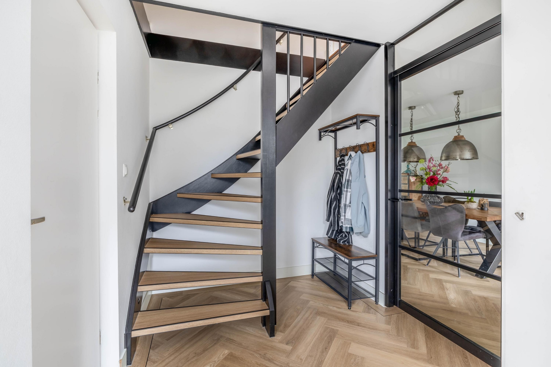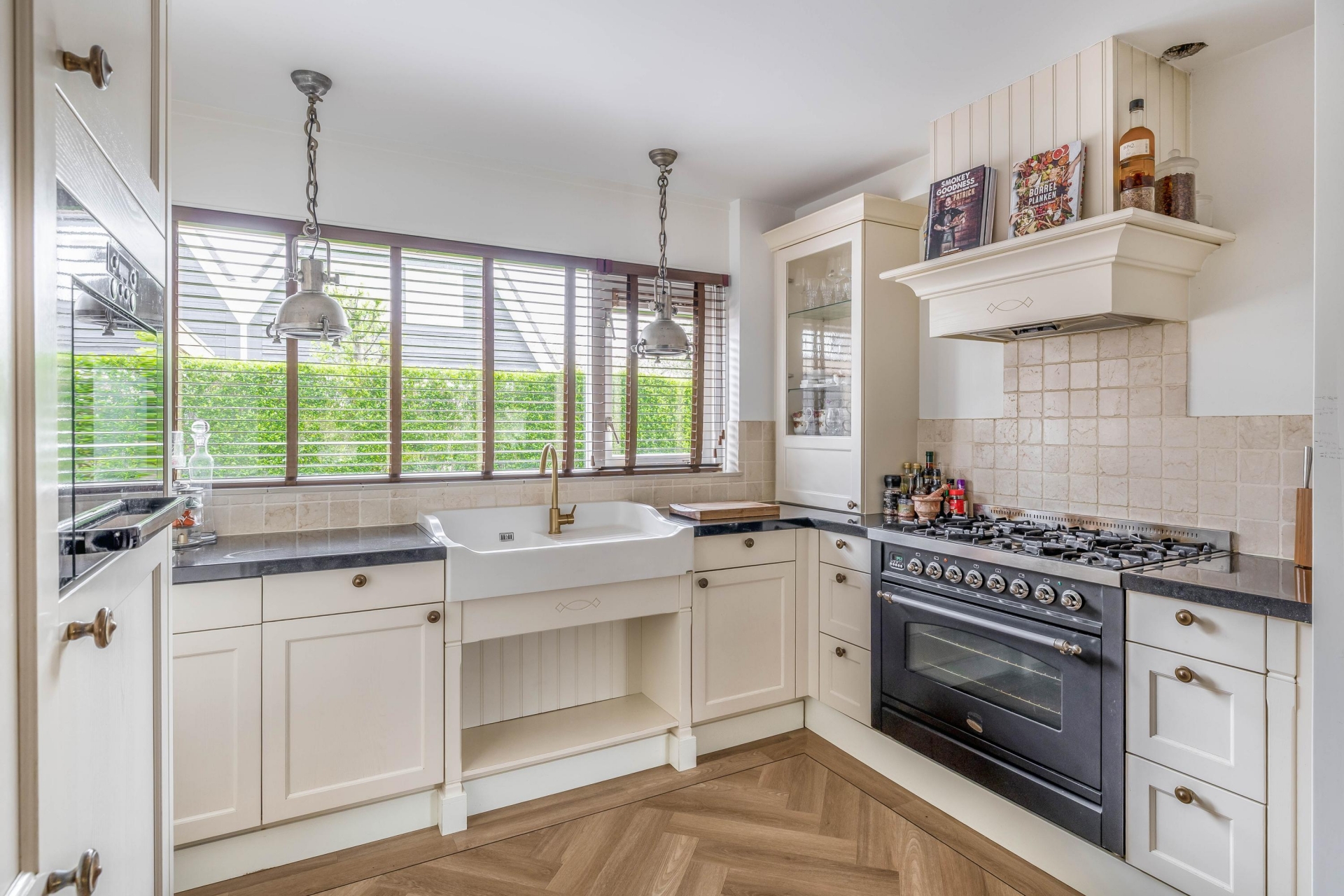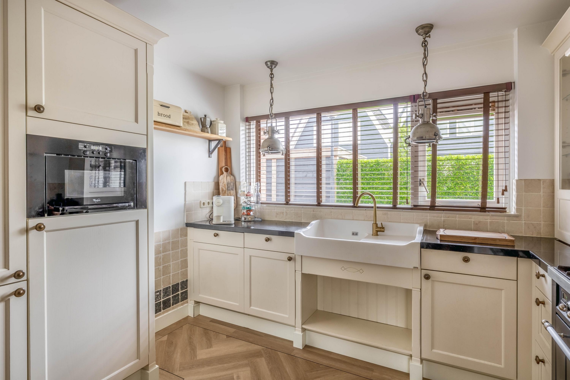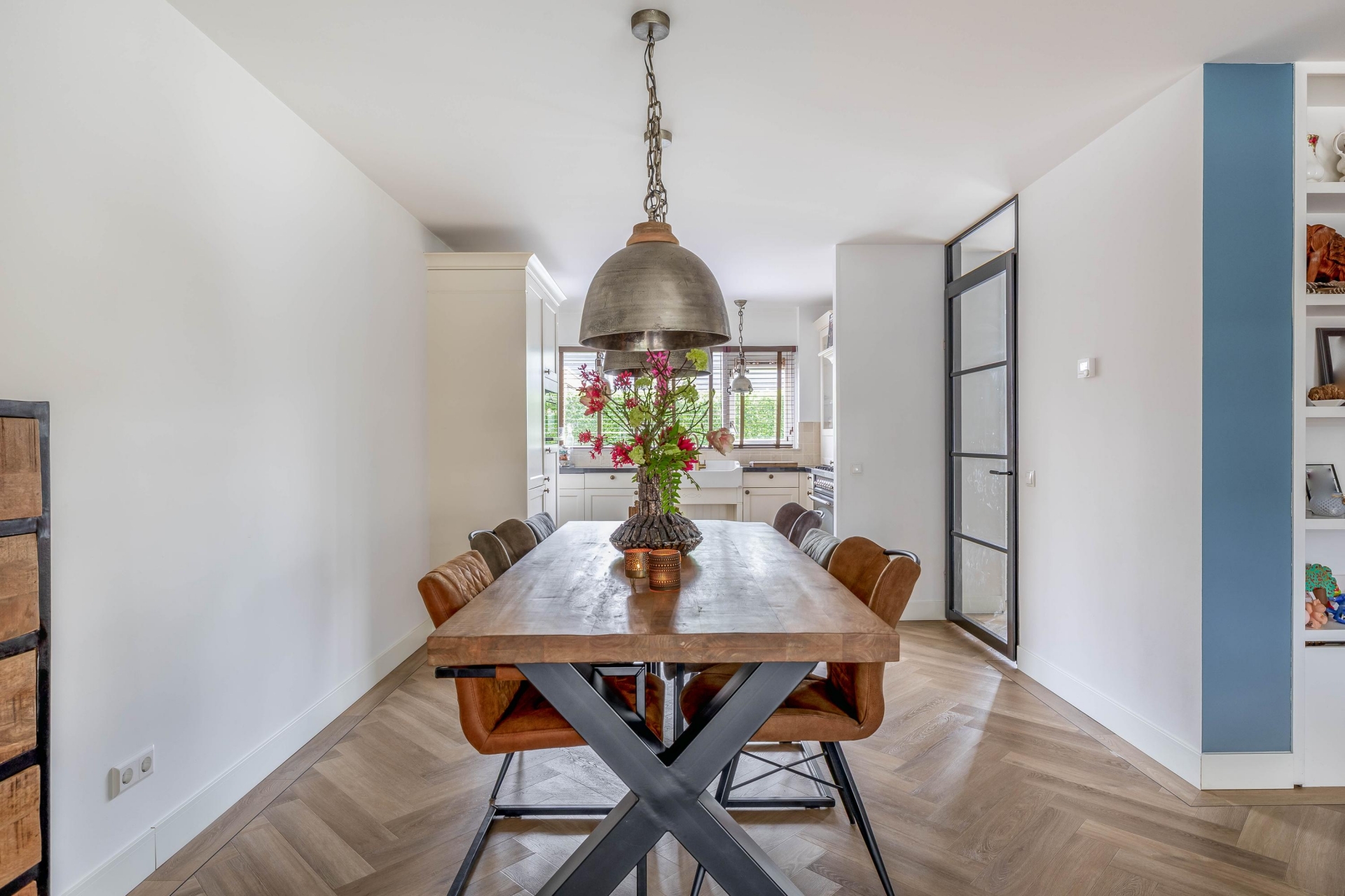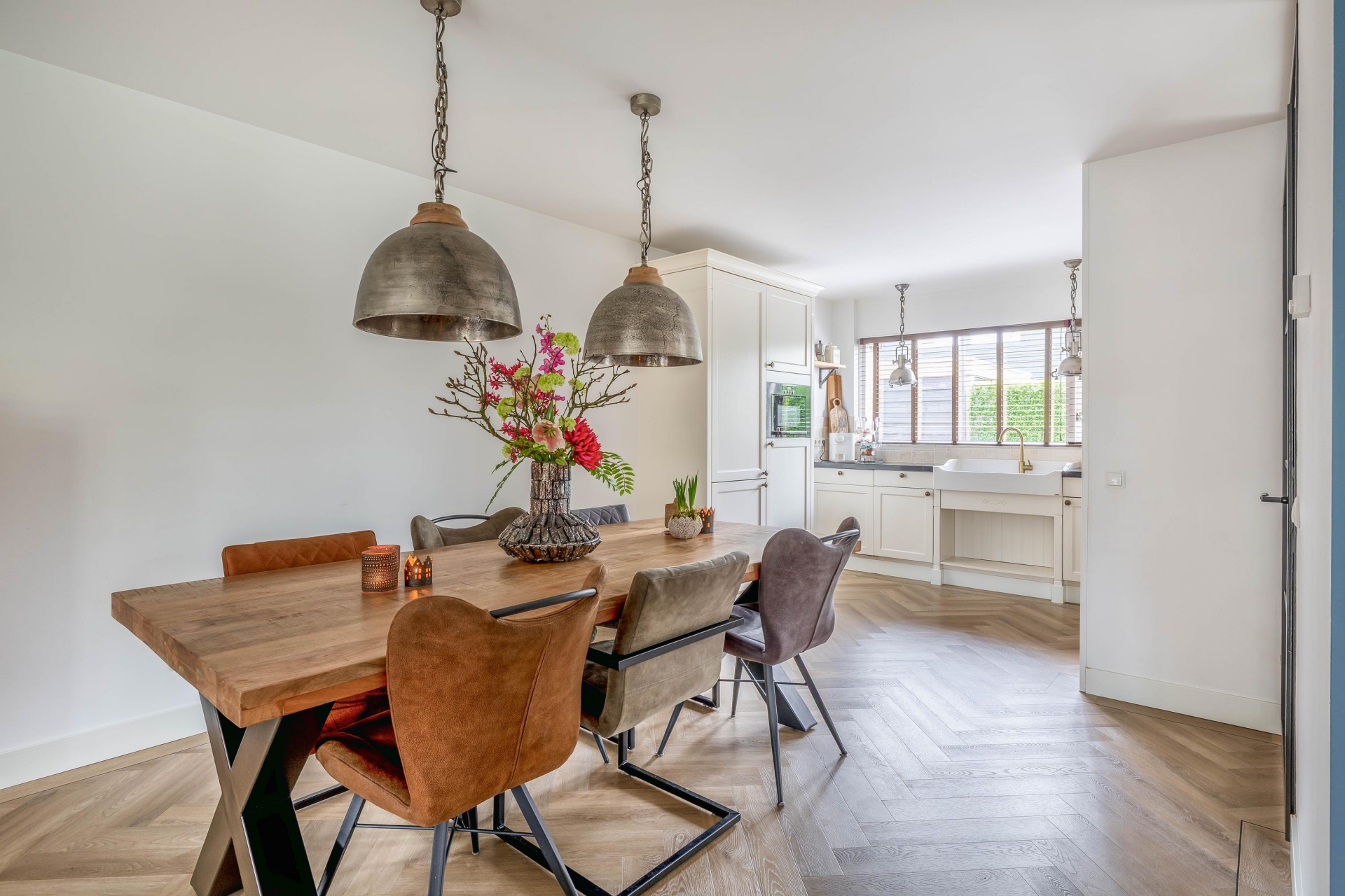 Zodra je binnenkomt valt direct op hoeveel ruimte en licht dit huis te bieden heeft. De woonkamer is aan de achterzijde uitgebouwd met een luxueuze uitbouw met aluminium kozijnen en prachtige, Franse eiken balken, wat zorgt voor een royale leefruimte met een prettige indeling. De grote raampartijen en de twee riante openslaande deuren naar de tuin laten het daglicht mooi naar binnen vallen en zorgen voor een fijne verbinding met buiten. De zithoek is ruim opgezet en sfeervol ingericht, met een moderne haard als centraal punt. Dit maakt het een heerlijke plek om te ontspannen, zowel overdag als in de avond. Aan de voorzijde van de woonkamer is voldoende ruimte voor een grote eettafel, waar je met gemak met familie of vrienden kunt zitten. De afwerking is verzorgd en warm, met een mooie vloer (met vloerverwarming) en rustige kleurstellingen die het geheel een eigentijdse uitstraling geven.