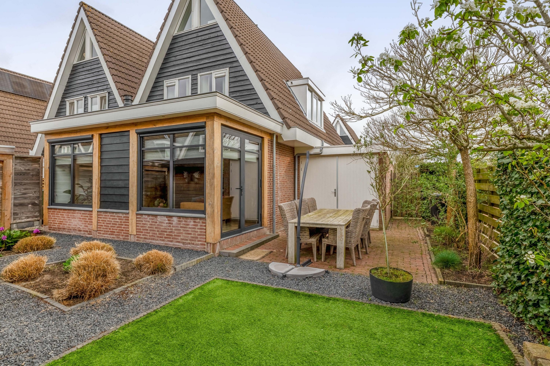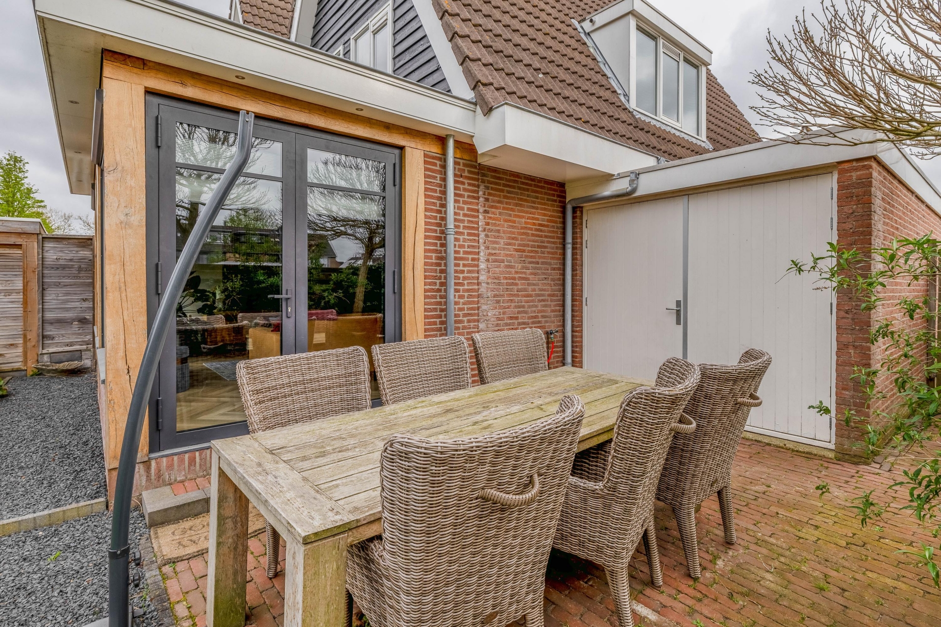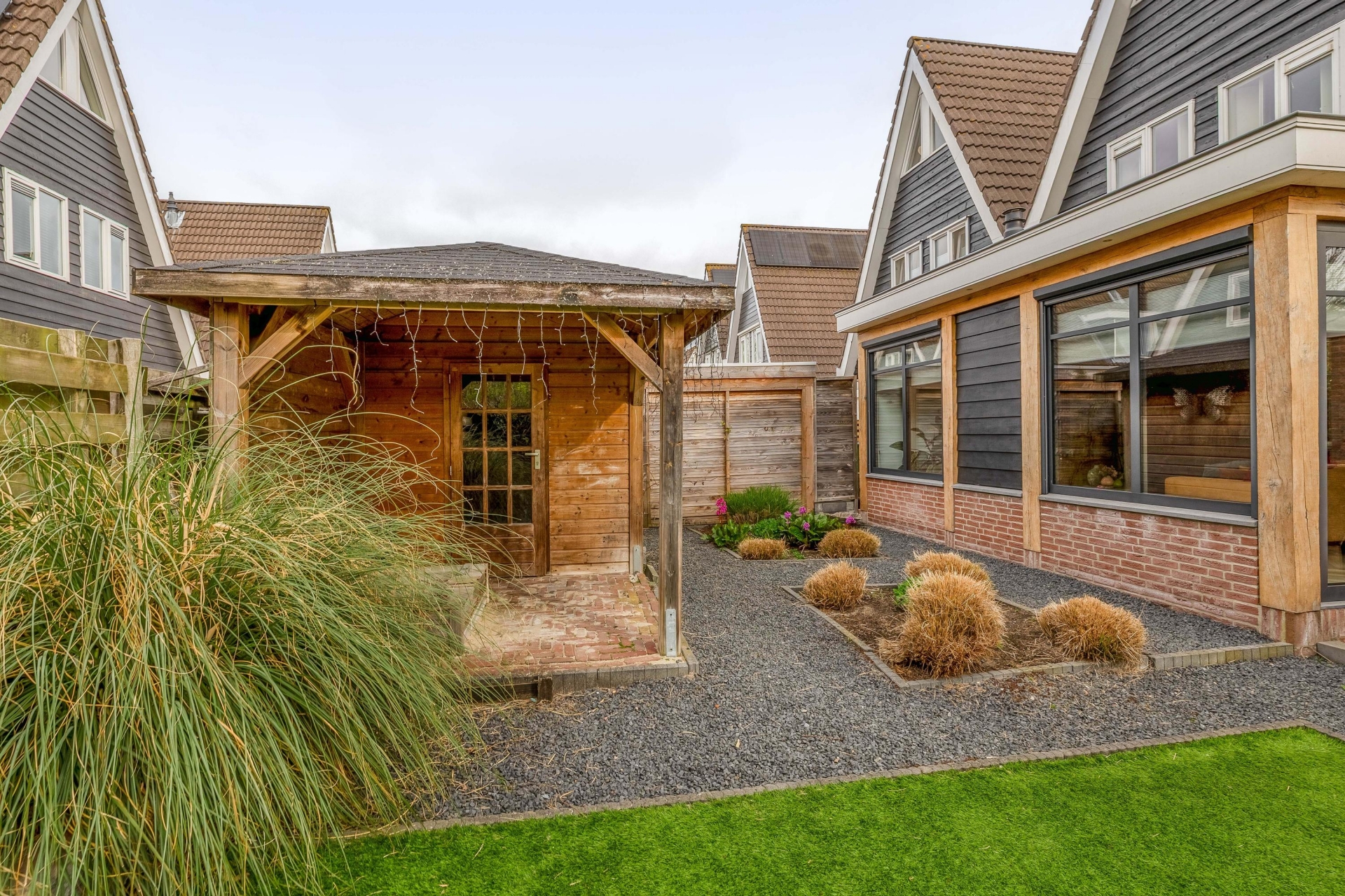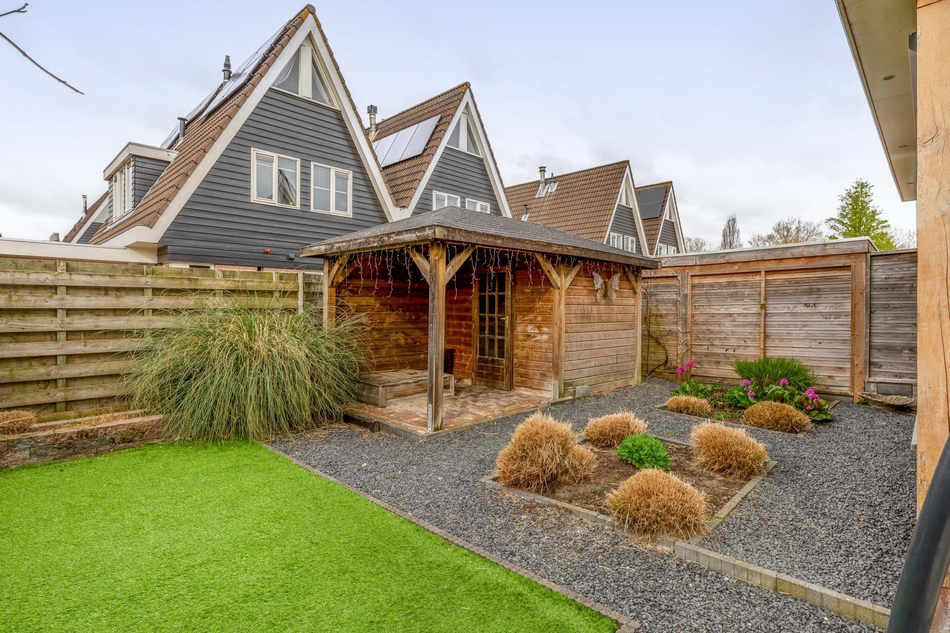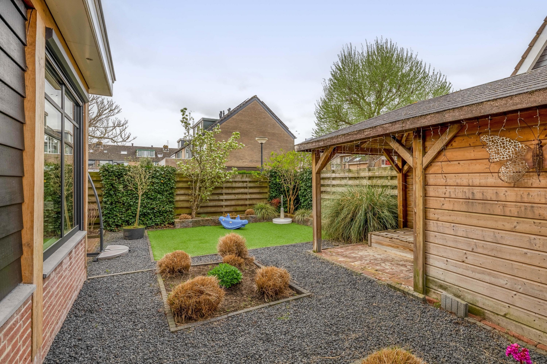 Een echte eyecatcher is de sfeervolle overkapping achterin de tuin. Hier zit je beschut en kun je al vroeg in het voorjaar en tot laat in het najaar buiten zitten. Of je nu wilt ontspannen met een kop koffie of gezellig wilt borrelen met vrienden, dit is zo’n plek waar je graag tijd doorbrengt.