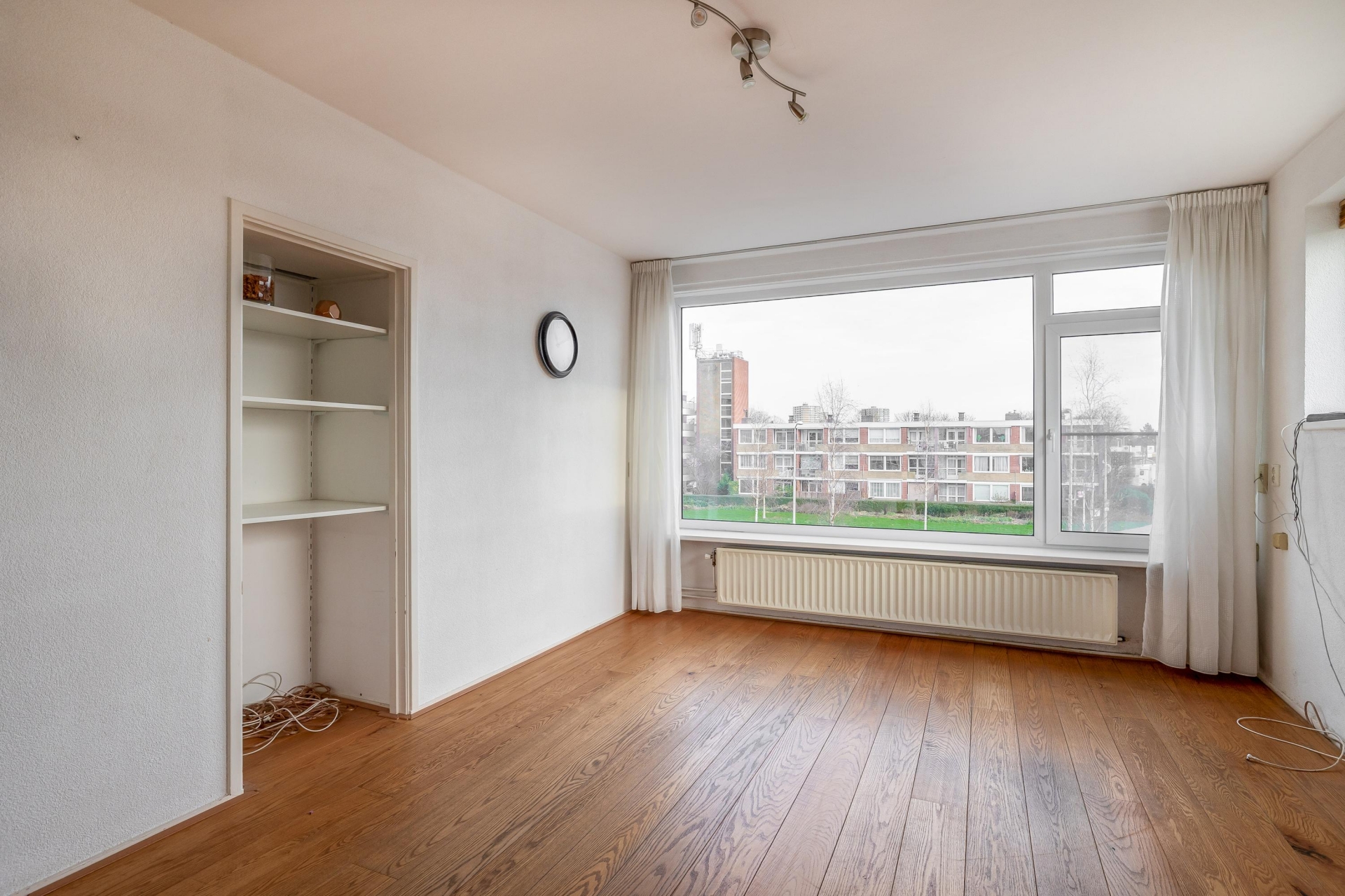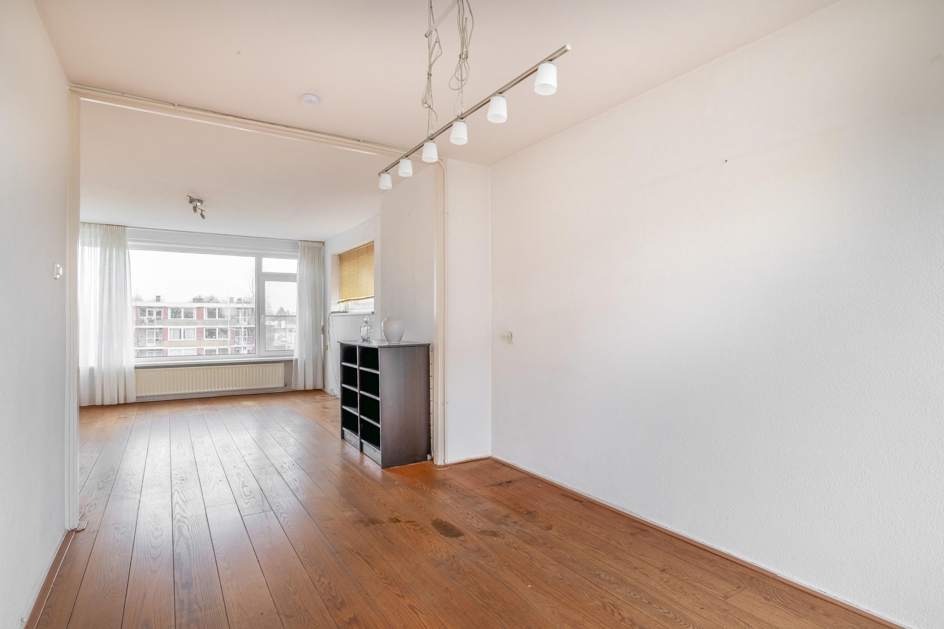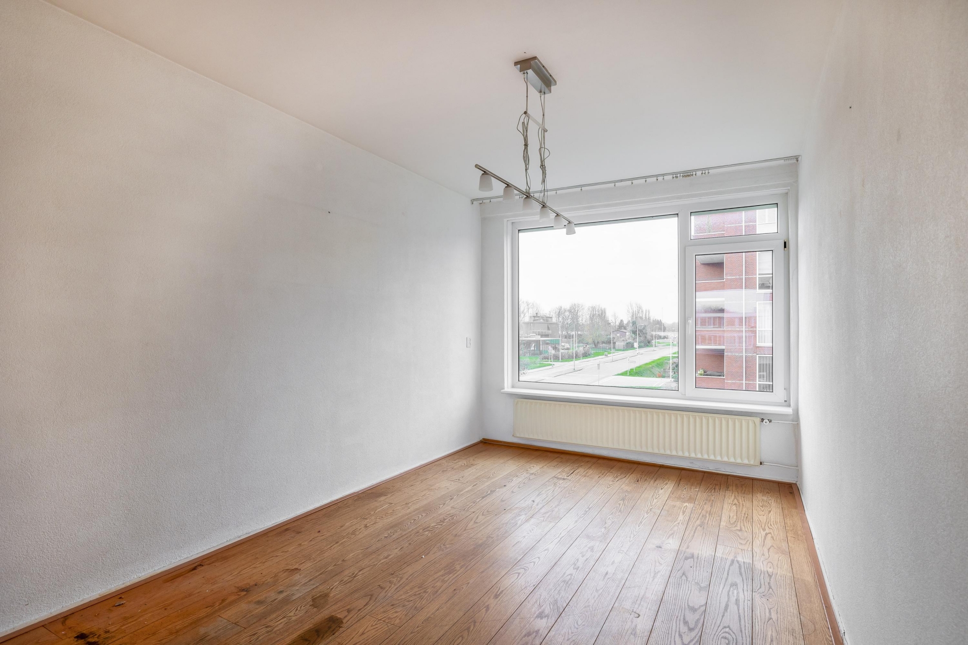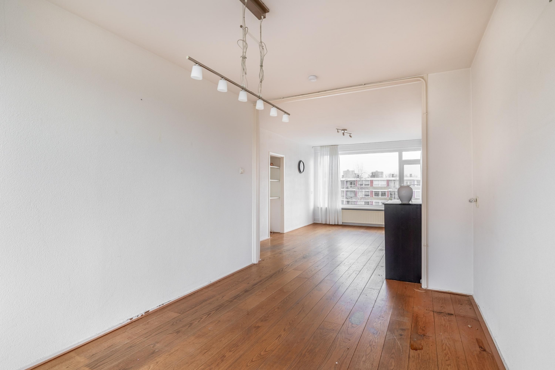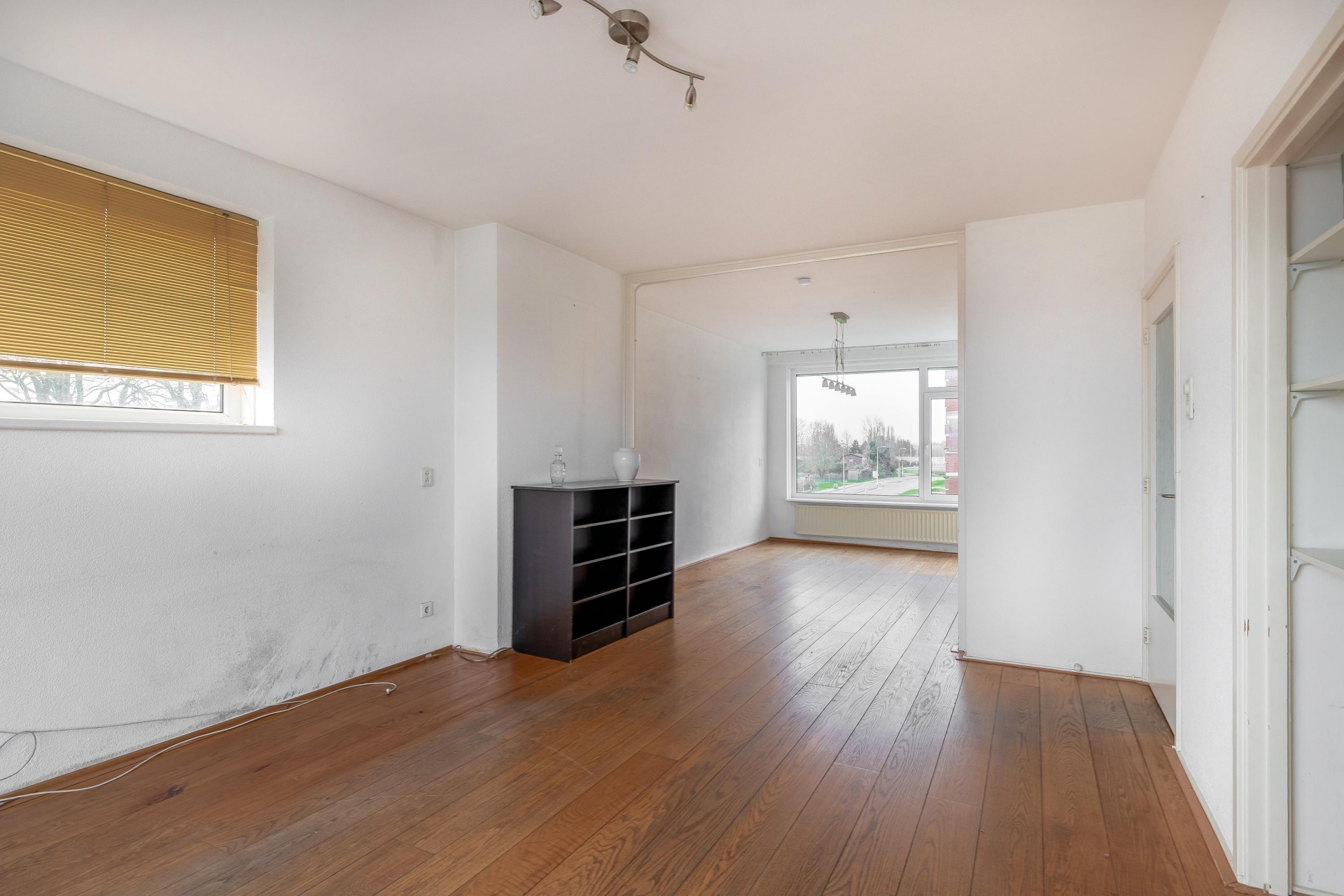 De woonkamer is ruim en dankzij de hoekligging valt er veel daglicht naar binnen. Hoewel de afwerking wat verouderd is, zijn de basis en indeling goed. De ruimte is flexibel in te delen, met genoeg plek voor een gezellige zithoek en een eettafel. Door de grote ramen heb je vrij uitzicht op de omgeving en een prettig gevoel van ruimte.