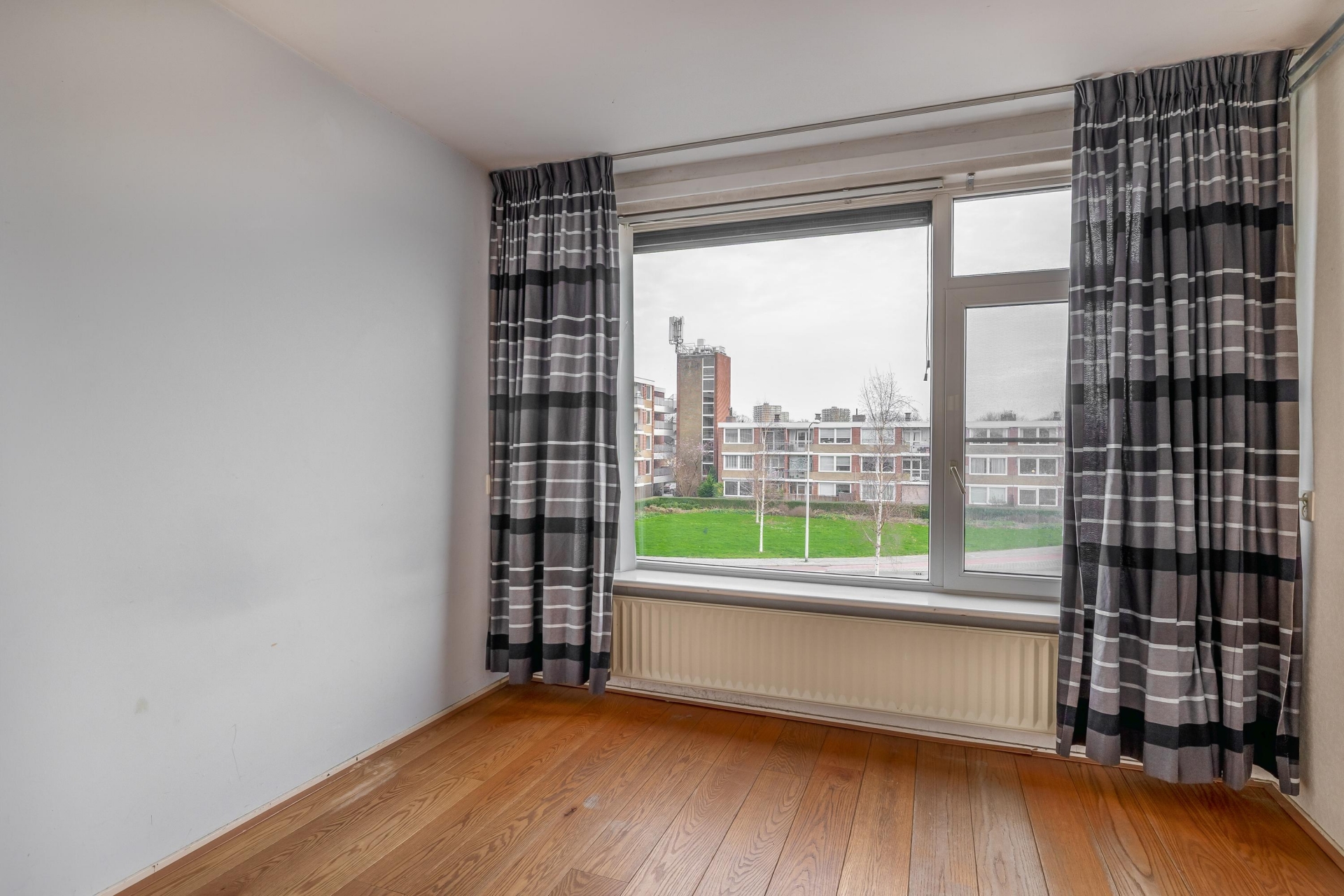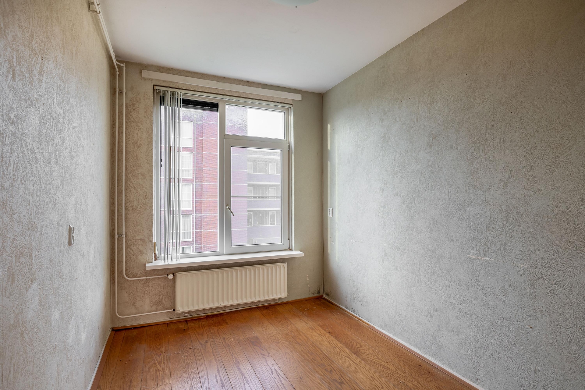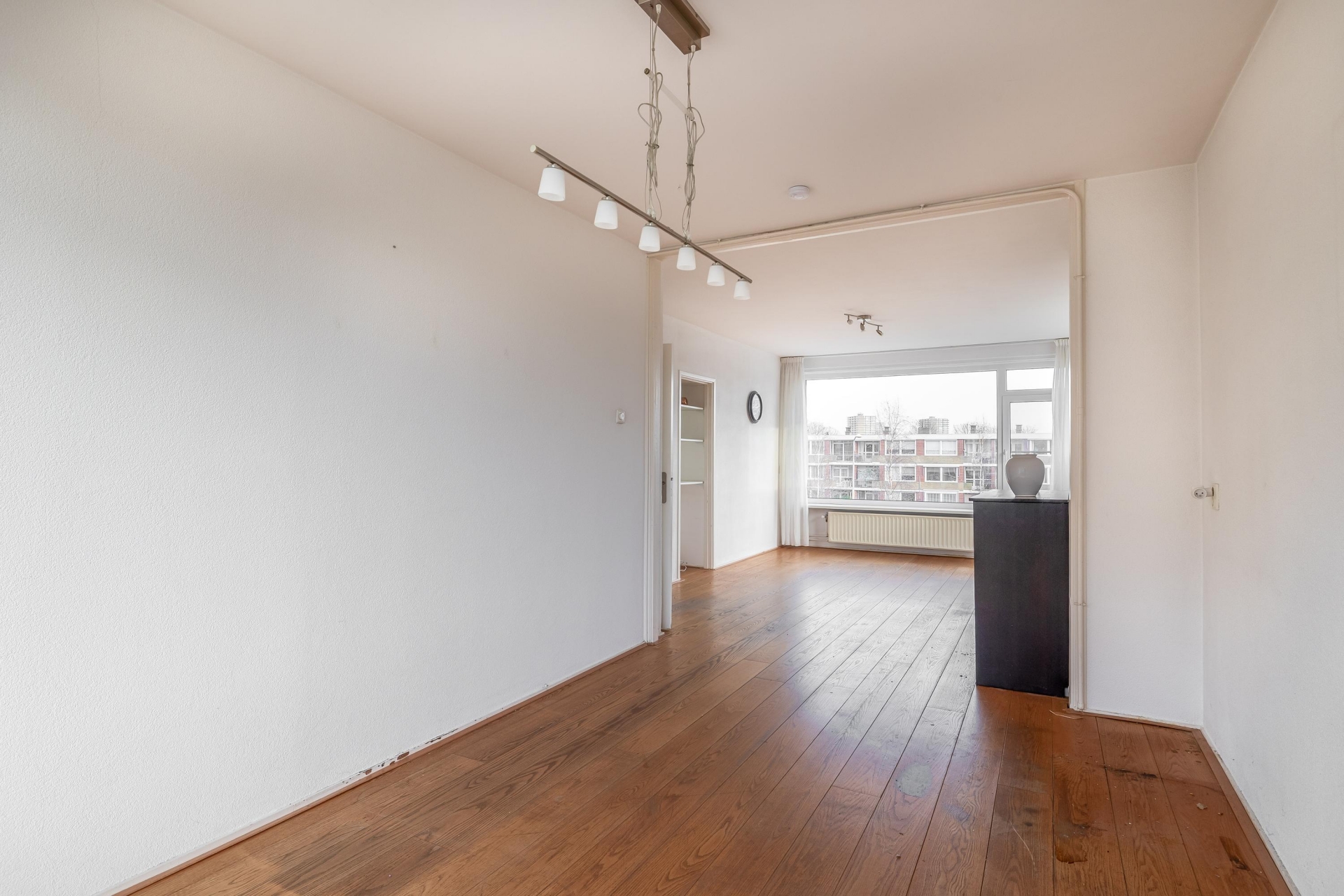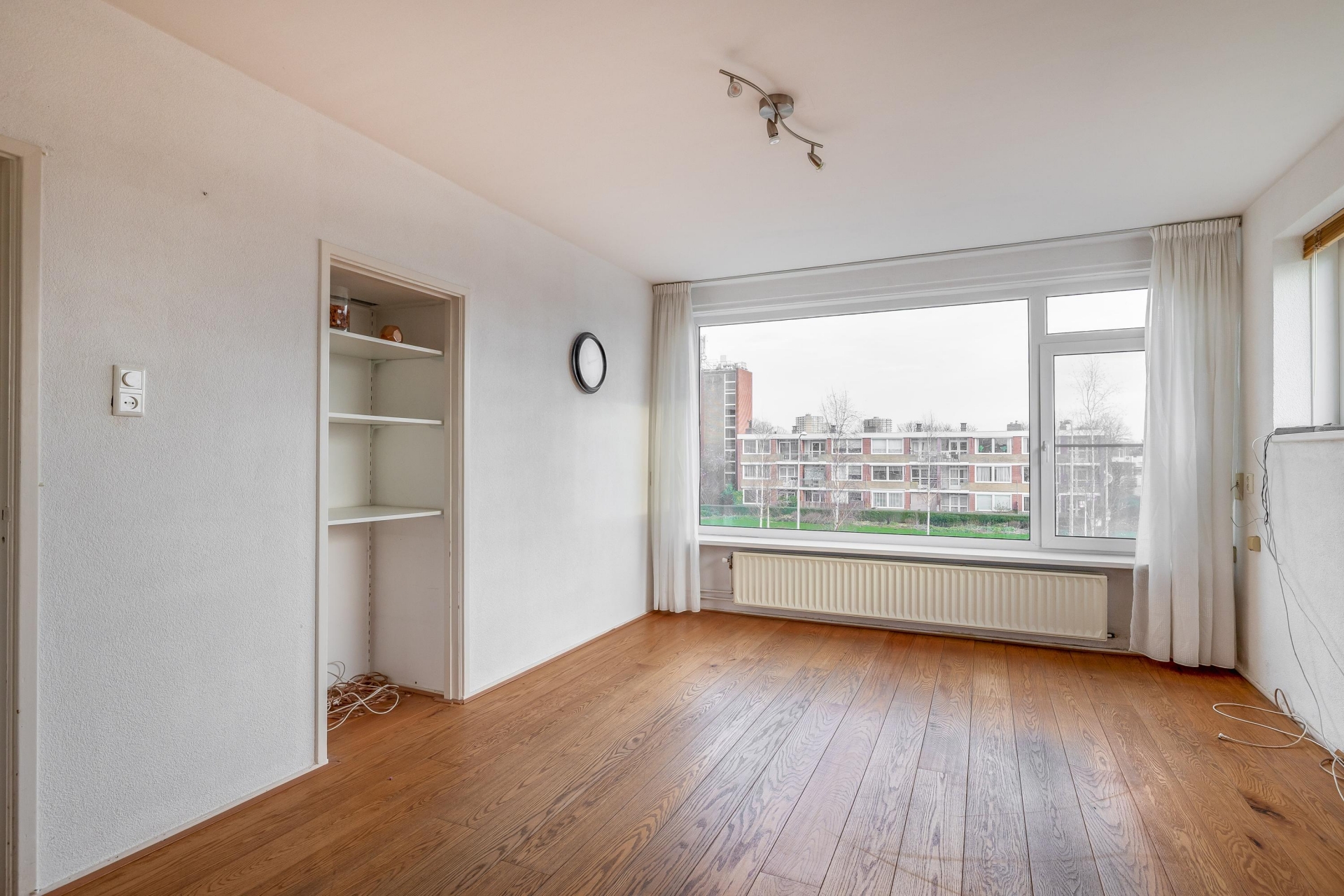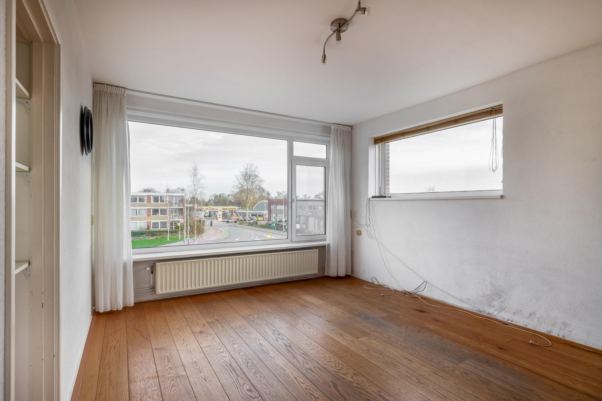 De woonkamer is ruim en dankzij de hoekligging valt er veel daglicht naar binnen. Hoewel de afwerking wat verouderd is, zijn de basis en indeling goed. De ruimte is flexibel in te delen, met genoeg plek voor een gezellige zithoek en een eettafel. Door de grote ramen heb je vrij uitzicht op de omgeving en een prettig gevoel van ruimte.
