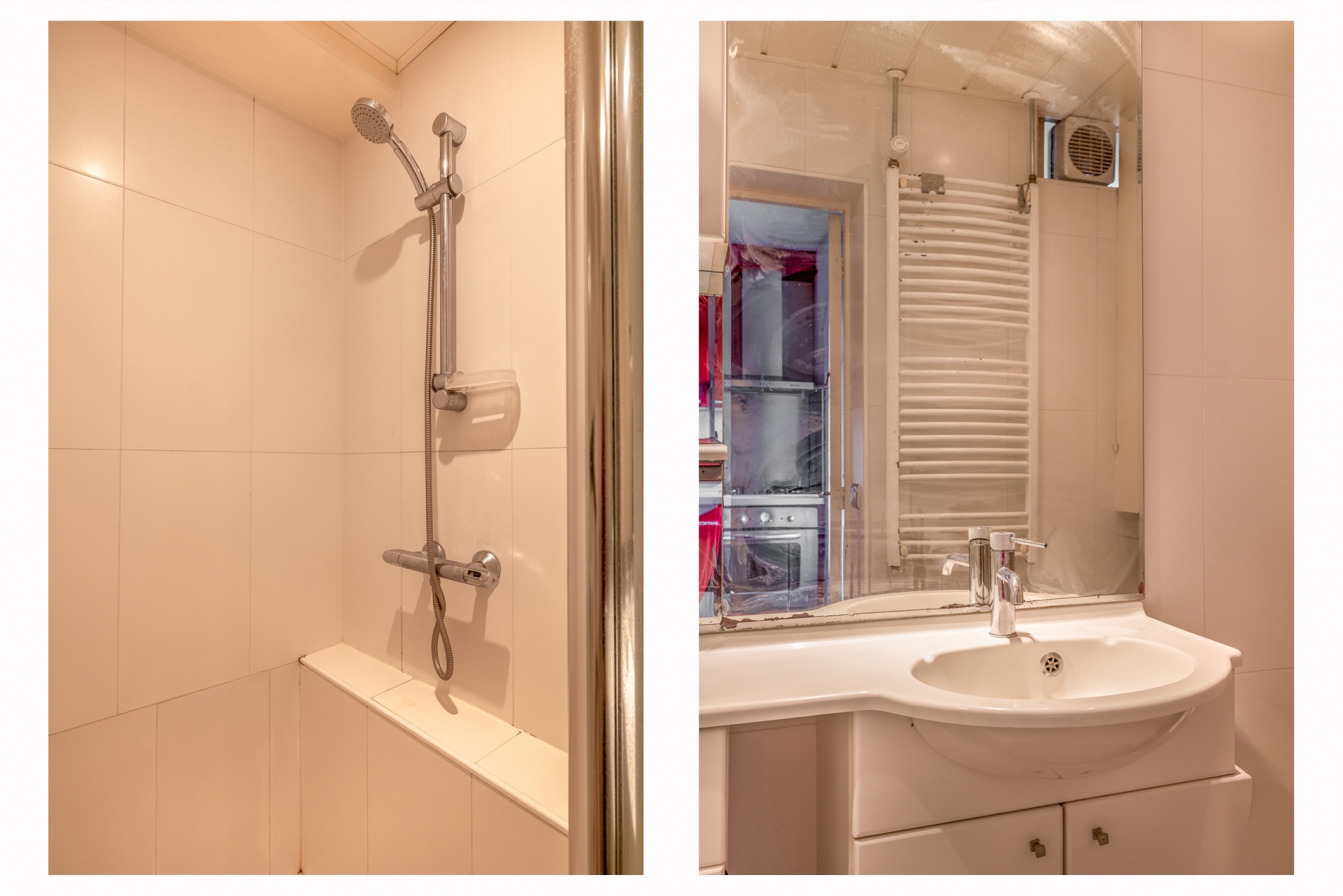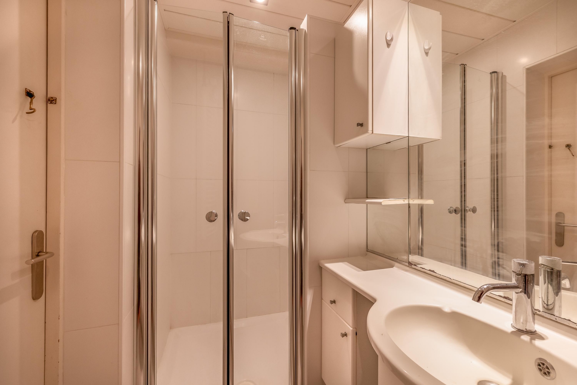 De badkamer is compact, maar praktisch ingericht met een douche en wastafel. Ook het toilet is separaat en bereikbaar via de hal. Beide ruimtes zijn bruikbaar zoals ze zijn, maar kunnen met relatief beperkte investering worden gemoderniseerd.