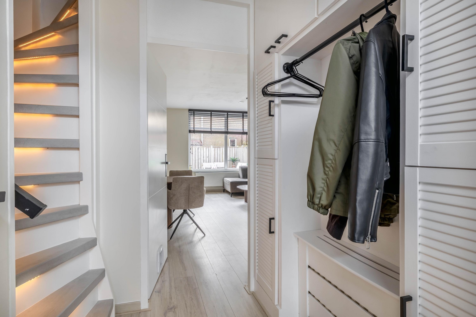 De woonkamer heeft een praktische indeling met ruimte voor een comfortabele zithoek en een ruime eettafel. De moderne vloer en lichte afwerking maken het geheel rustig en eigentijds. Vanuit de woonkamer heb je direct zicht op de achtertuin, waardoor binnen en buiten mooi met elkaar verbonden zijn.