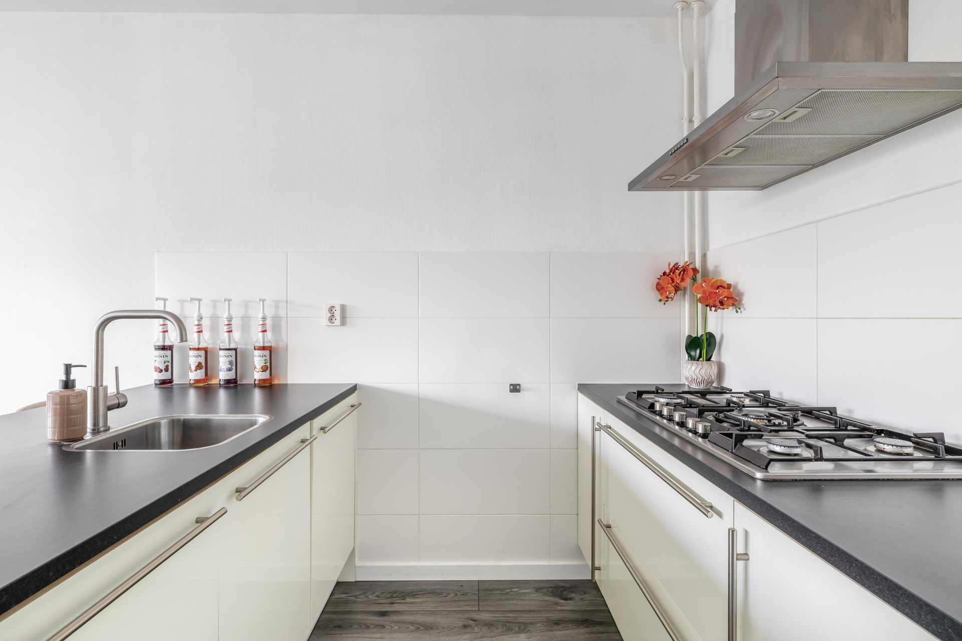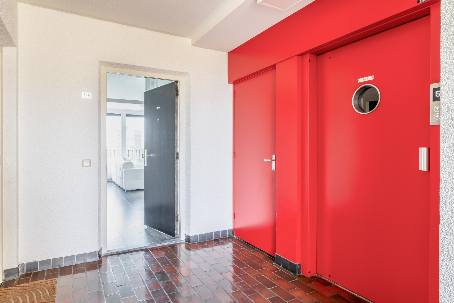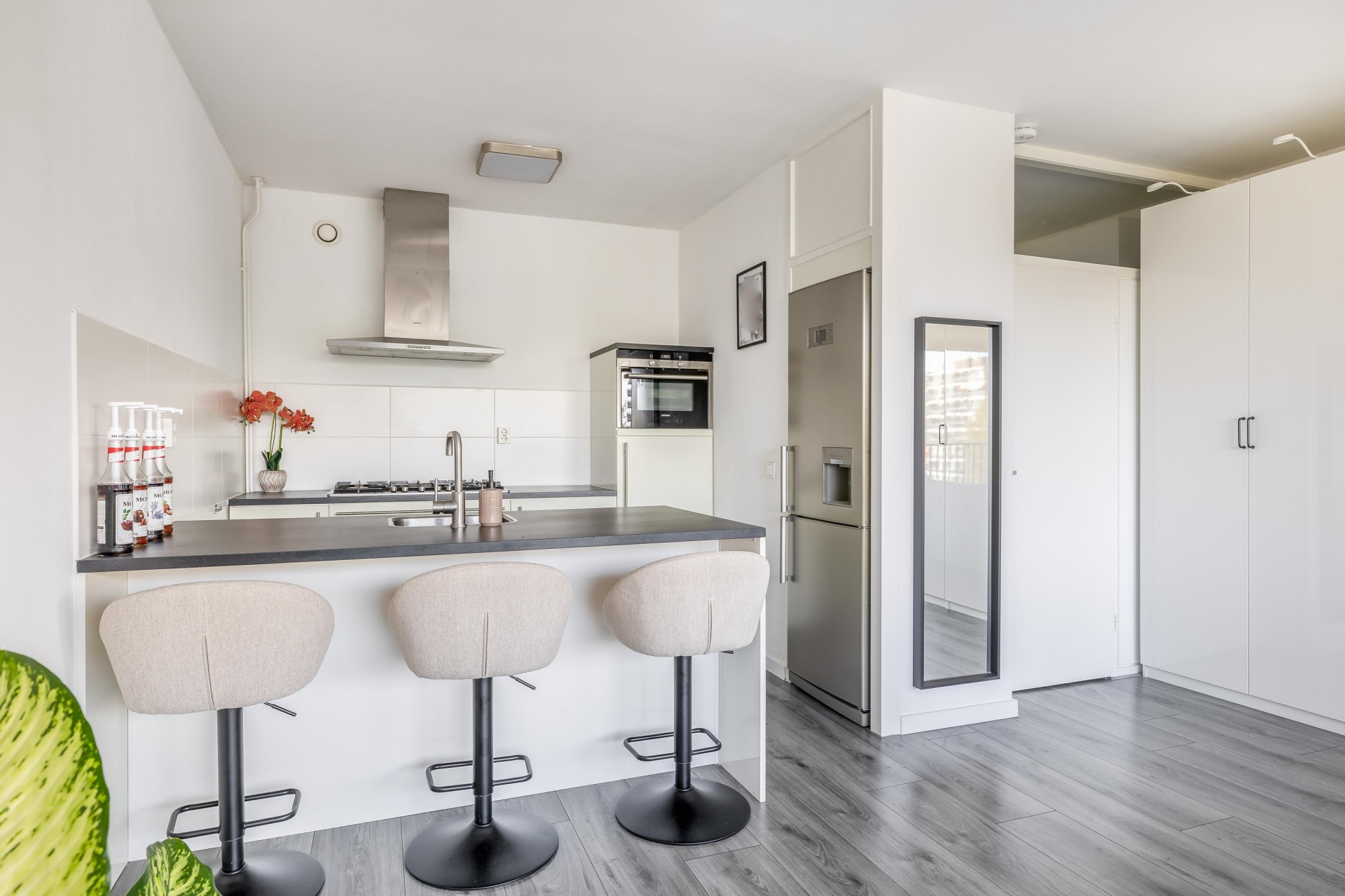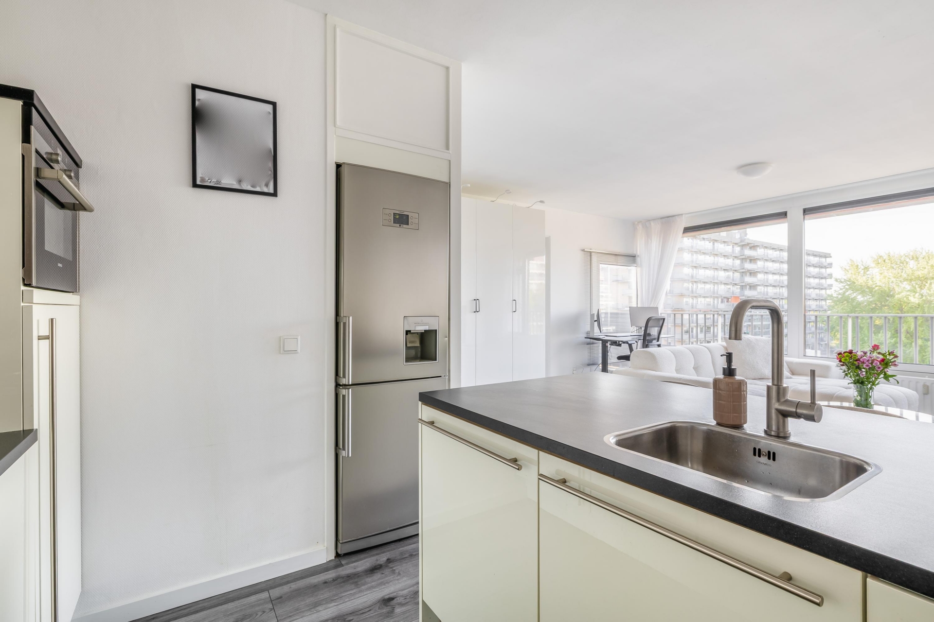 Centrale entree met bellentableau, brievenbussen en videofoon. Afgesloten hal met trappenhuis en lift naar de 5e etage; entree van het appartement via hal, voorzien van laminaat vloer, videofoon, 2 vaste kasten en de meterkast; modern toilet (2017) met fonteintje; zeer lichte woonkamer, voorzien van laminaatvloer; moderne open keuken (2017), voorzien van spoeleiland met barblad en diverse inbouwapparatuur, te weten: spoelbak, vaatwasser, koel-/vriescombinatie, 5-pits gaskookplaat met wokbrander, RVS-afzuigschouw en combi oven-/magnetron; slaapkamer, voorzien van laminaatvloer en deur naar zonnig balkon op het zuiden; moderne badkamer (2017), voorzien van ligbad-/ douchecombinatie, wastafelmeubel en opstelplaats voor wasmachine en droger, eigen berging in de onderbouw.