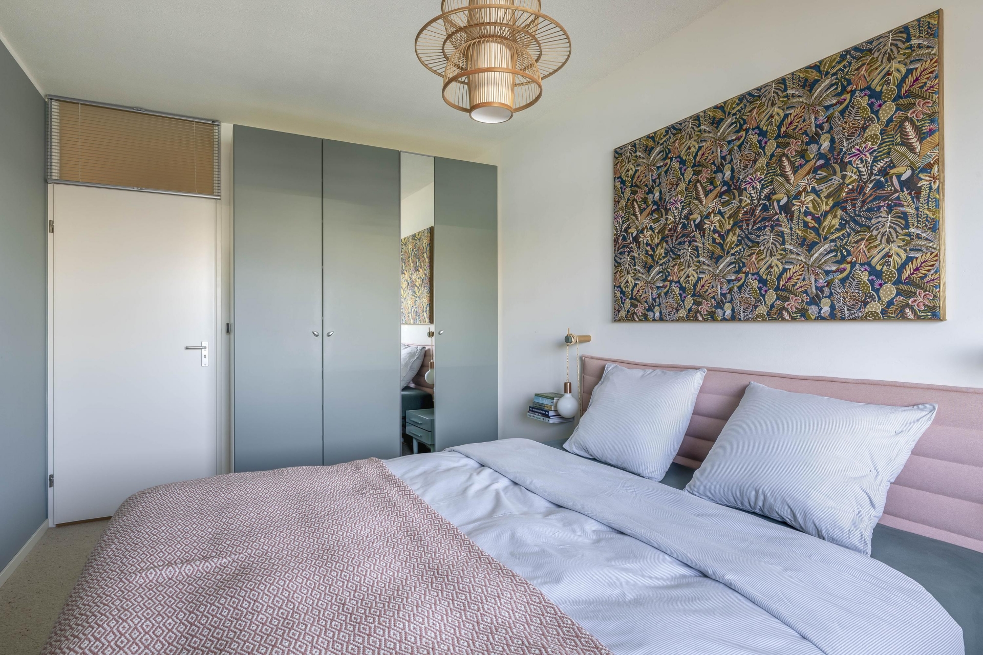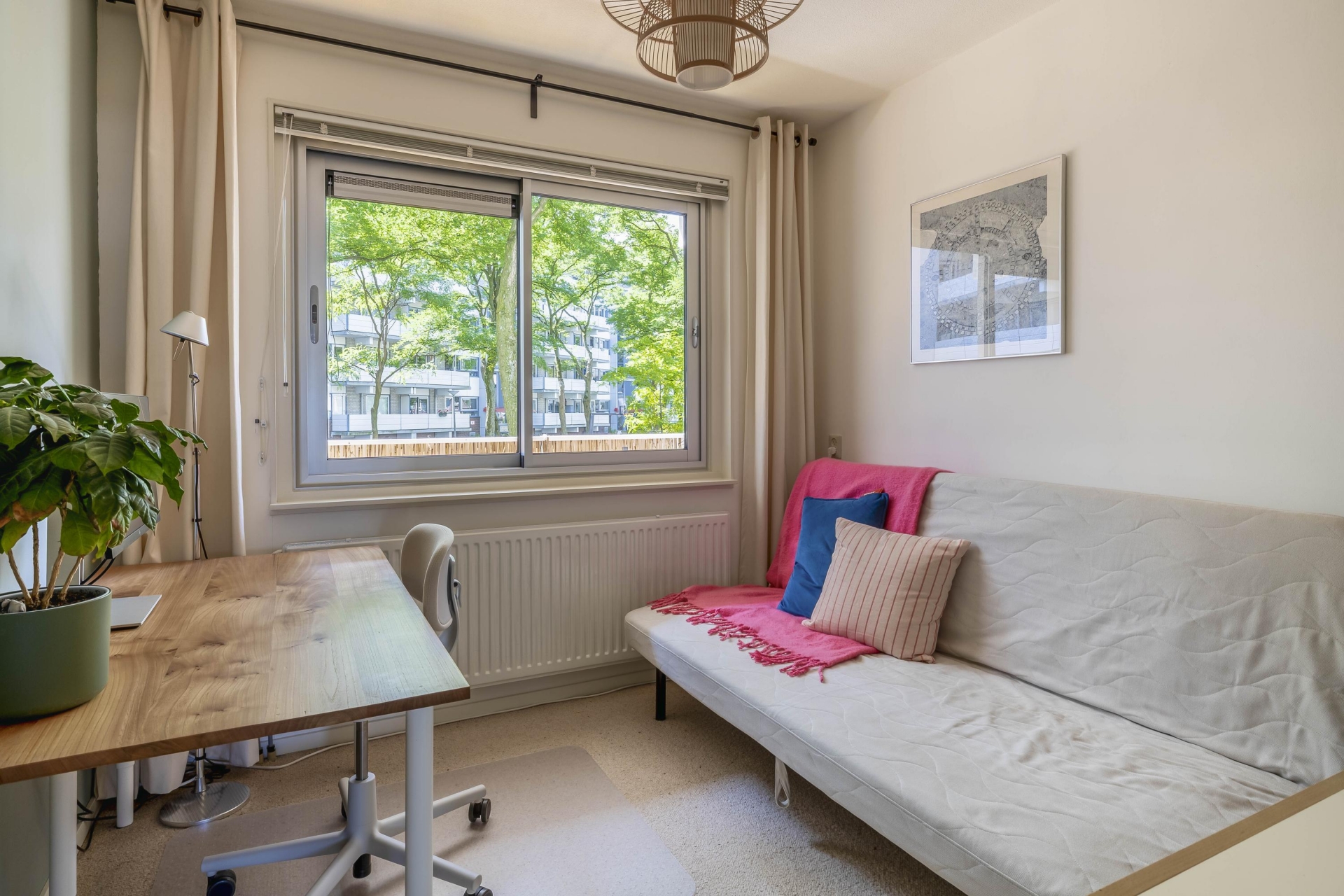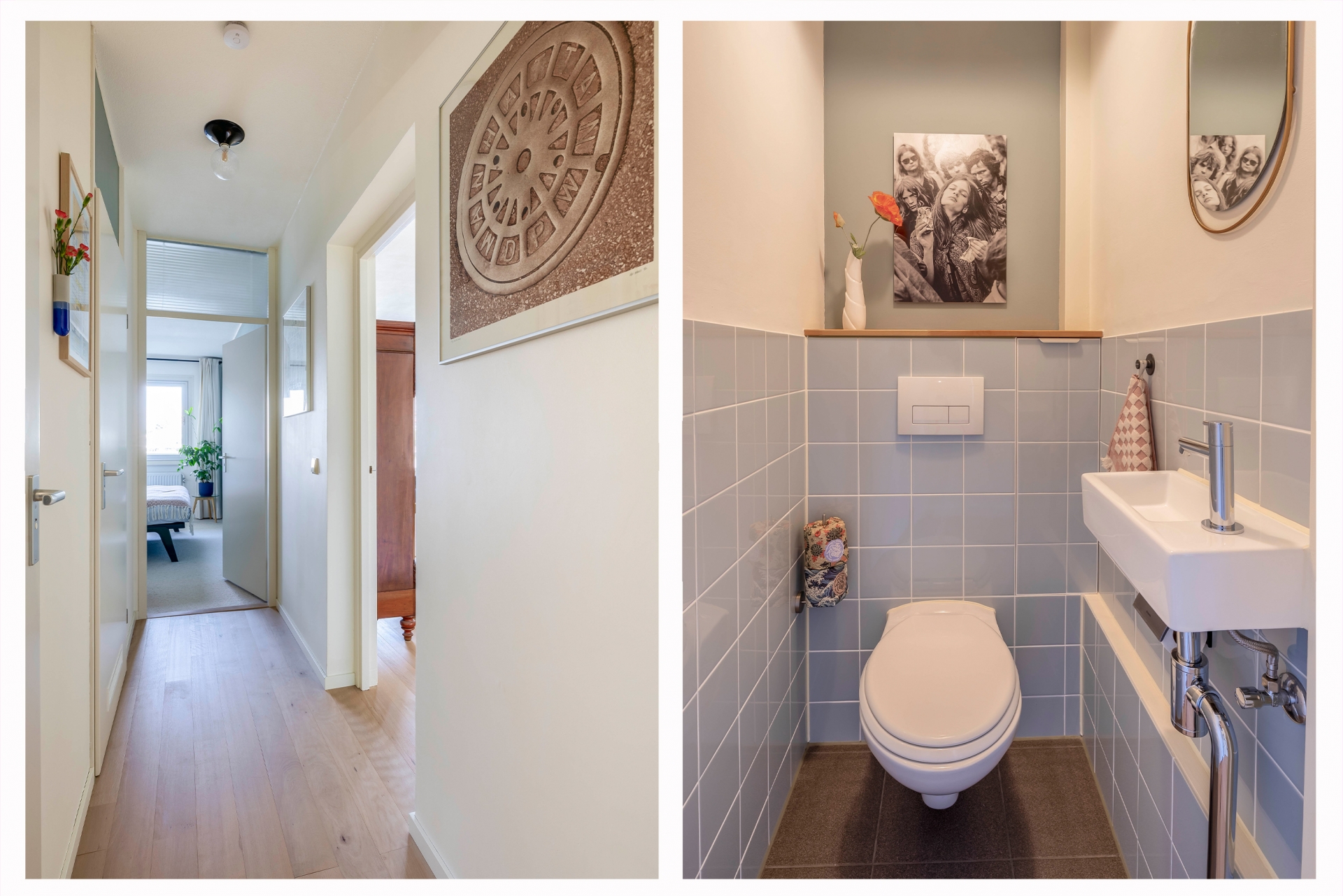 De grootste slaapkamer ligt aan de Maaszijde en biedt voldoende ruimte voor een tweepersoonsbed en een kast. De tweede kamer is veelzijdig te gebruiken als werkruimte, logeerkamer, kinderkamer of walk-in-closet. De badkamer is netjes afgewerkt en voorzien van een douche, wastafel en handdoekradiator. Daarnaast is er een separaat toilet aanwezig – een pluspunt voor een appartement van dit formaat. De vloer is afgewerkt met lamelparket en de wanden zijn licht gehouden, wat bijdraagt aan de frisse en instapklare uitstraling.