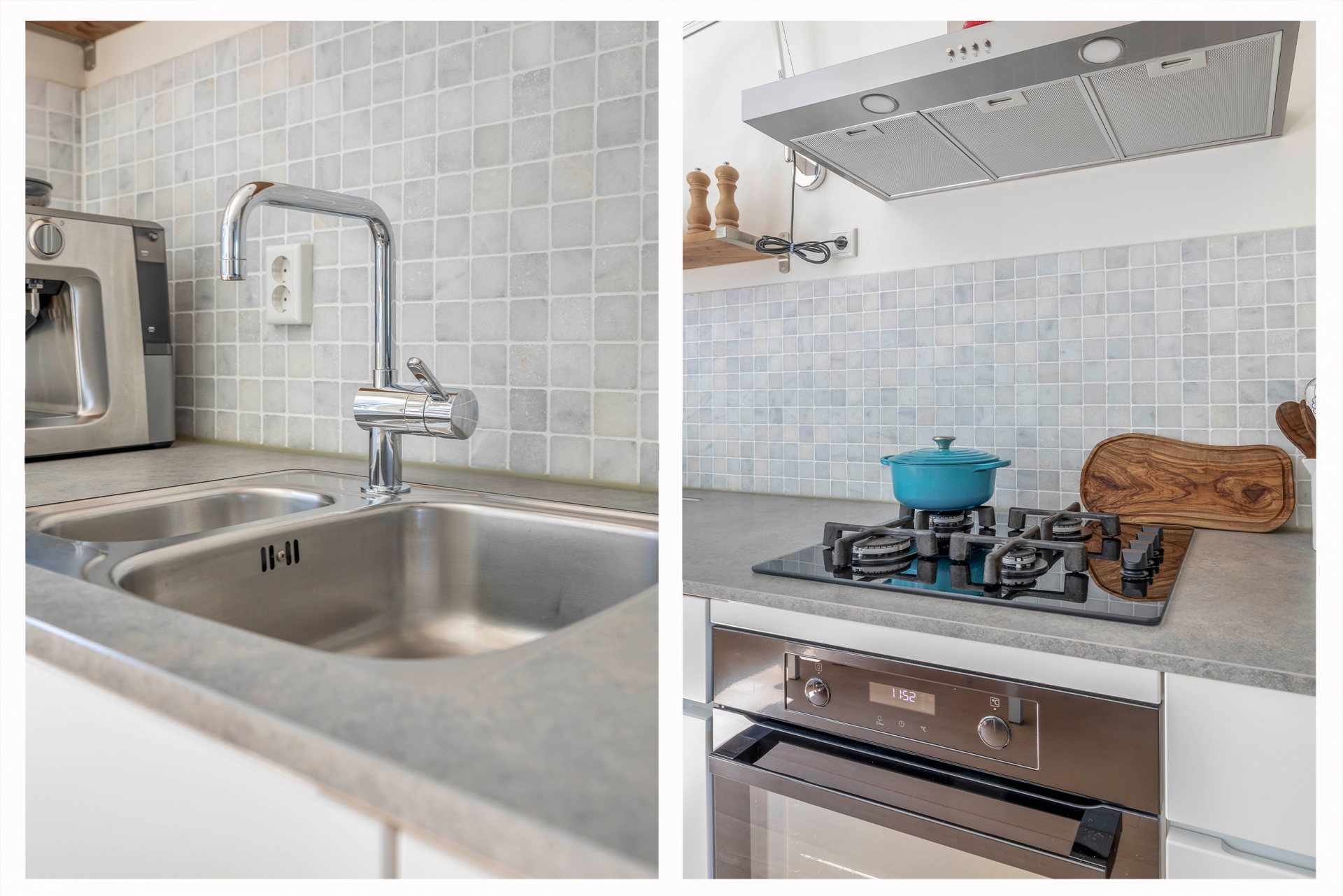 De woonkamer is gesitueerd aan de waterzijde van het appartement en beschikt over grote raampartijen die zorgen voor een mooie lichtinval en een prachtig vrij uitzicht. De open keuken sluit direct aan op de woonkamer en is voorzien van diverse inbouwapparatuur, waaronder een oven, kookplaat, afzuigkap, vaatwasser en koelkast. De indeling is praktisch en biedt voldoende opberg- en werkruimte. De moderne, neutrale uitstraling maakt het eenvoudig om je eigen stijl toe te voegen. Zowel de woonkamer als de keuken bieden toegang tot de balkons.