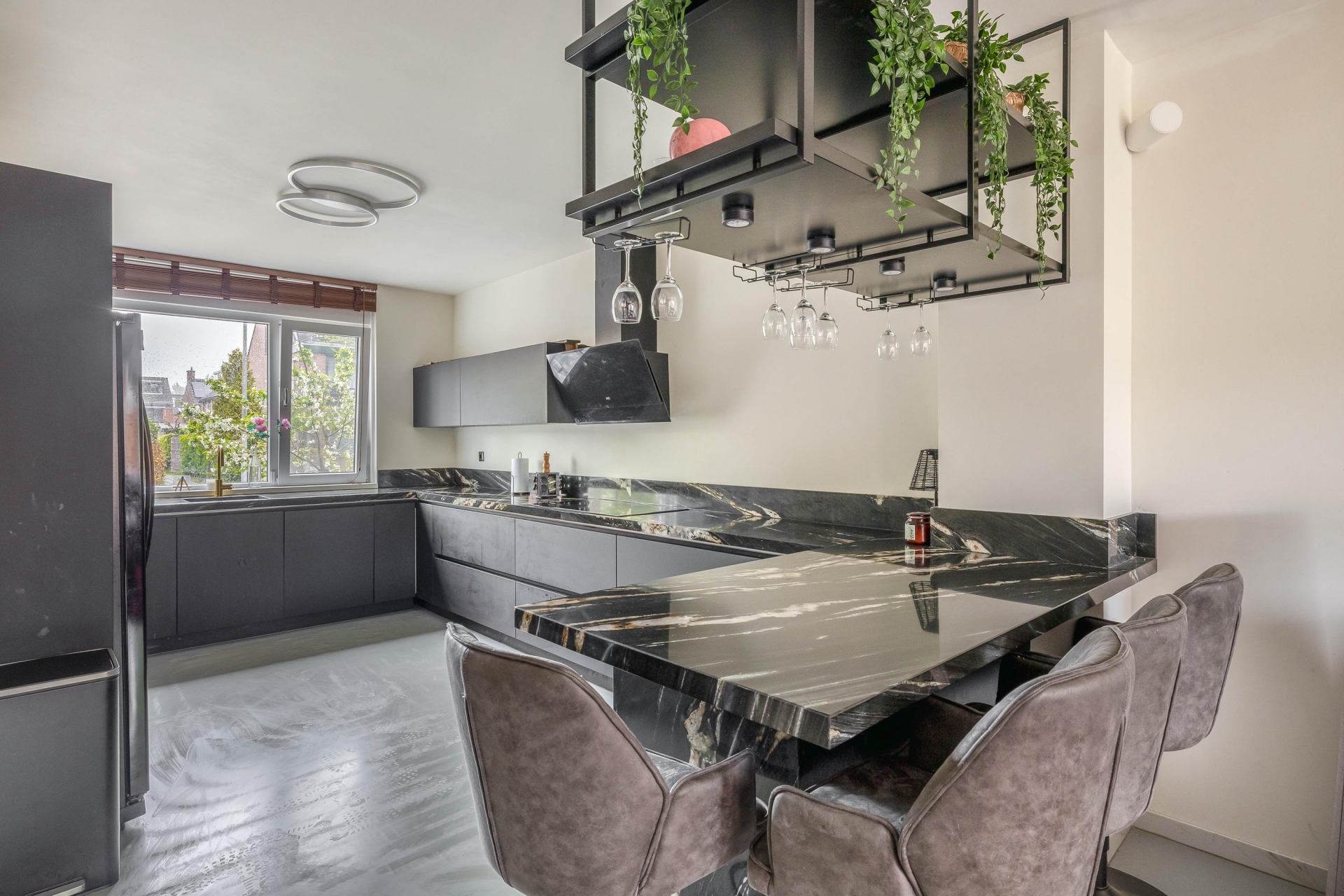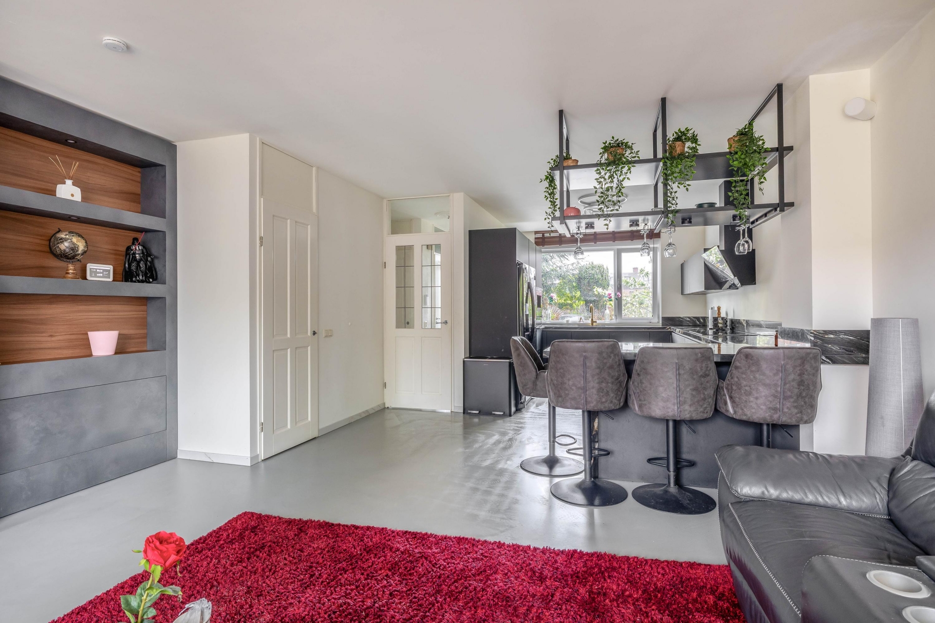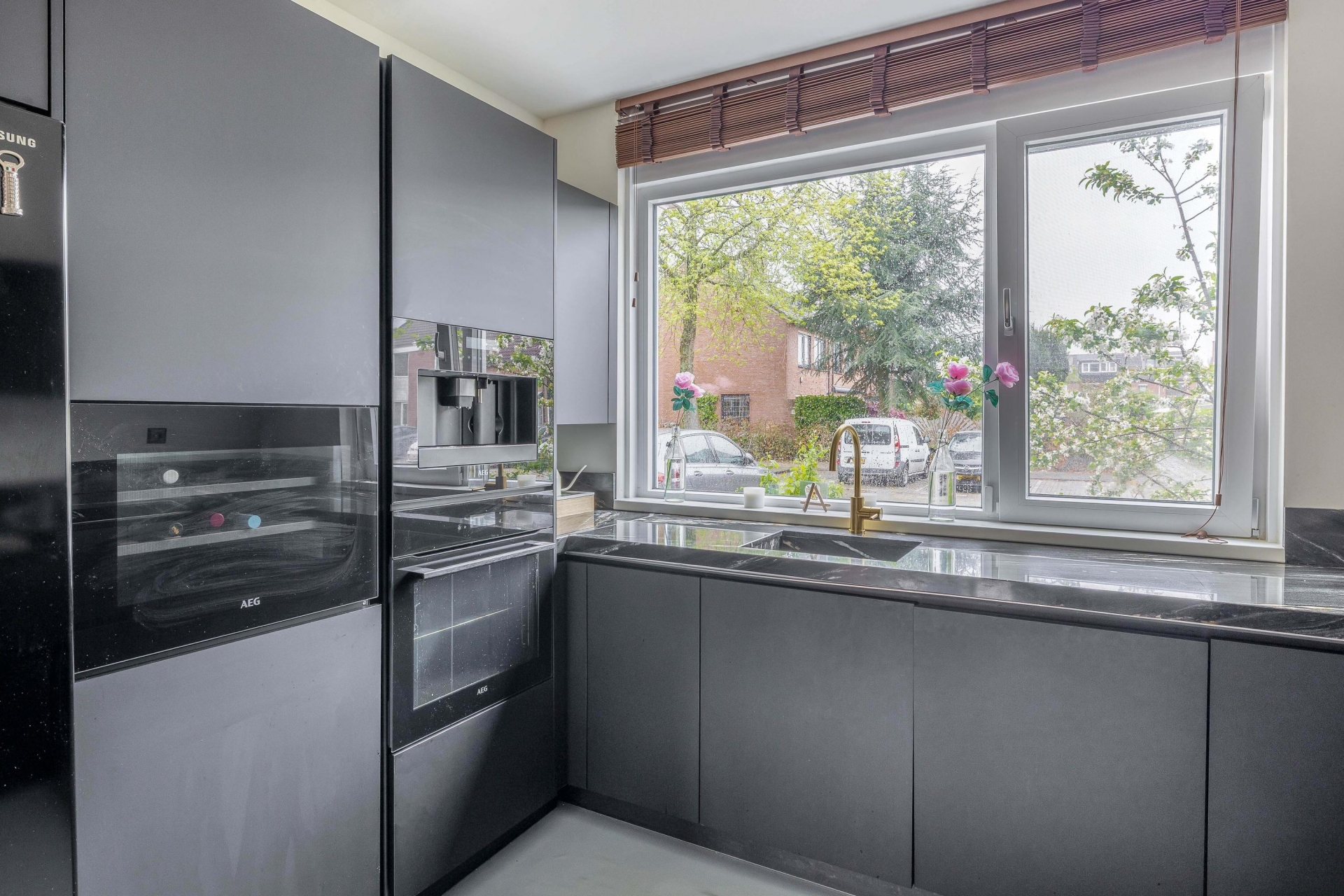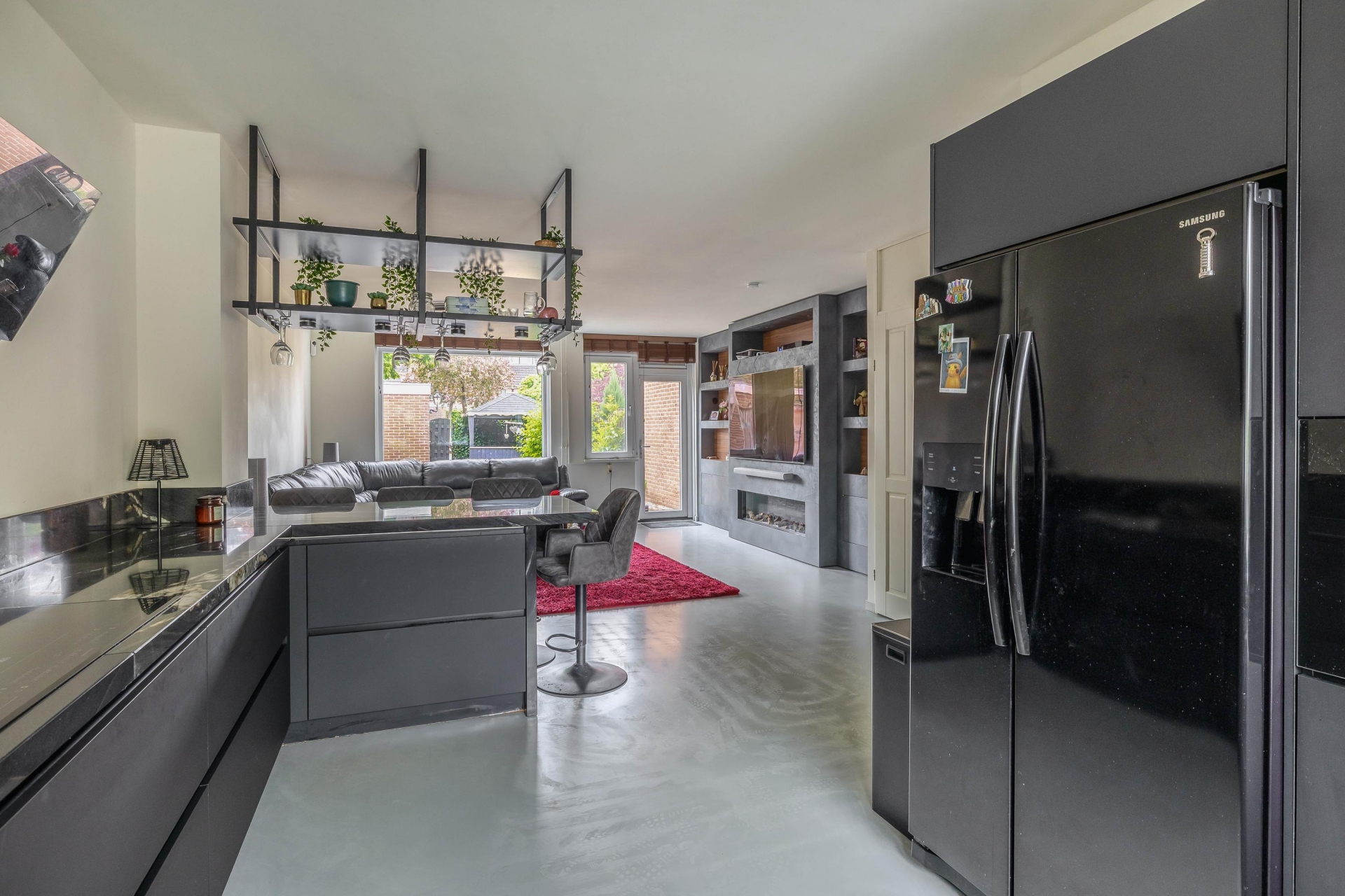 De begane grond is een echte eyecatcher: een open leefruimte waarin de moderne keuken en gezellige zithoek naadloos in elkaar overlopen. De stijlvolle zwarte keuken is niet alleen een plaatje om te zien, maar ook praktisch ingericht met volop kastruimte, moderne apparatuur, een royaal marmeren werkblad en gezellig barretje. Ideaal voor wie graag kookt of samenkomt met vrienden en familie. De lichte woonkamer is voorzien van een op maat gemaakte cinewall met ingebouwde sierhaard – een sfeervol middelpunt van de ruimte waar je heerlijk kunt ontspannen.