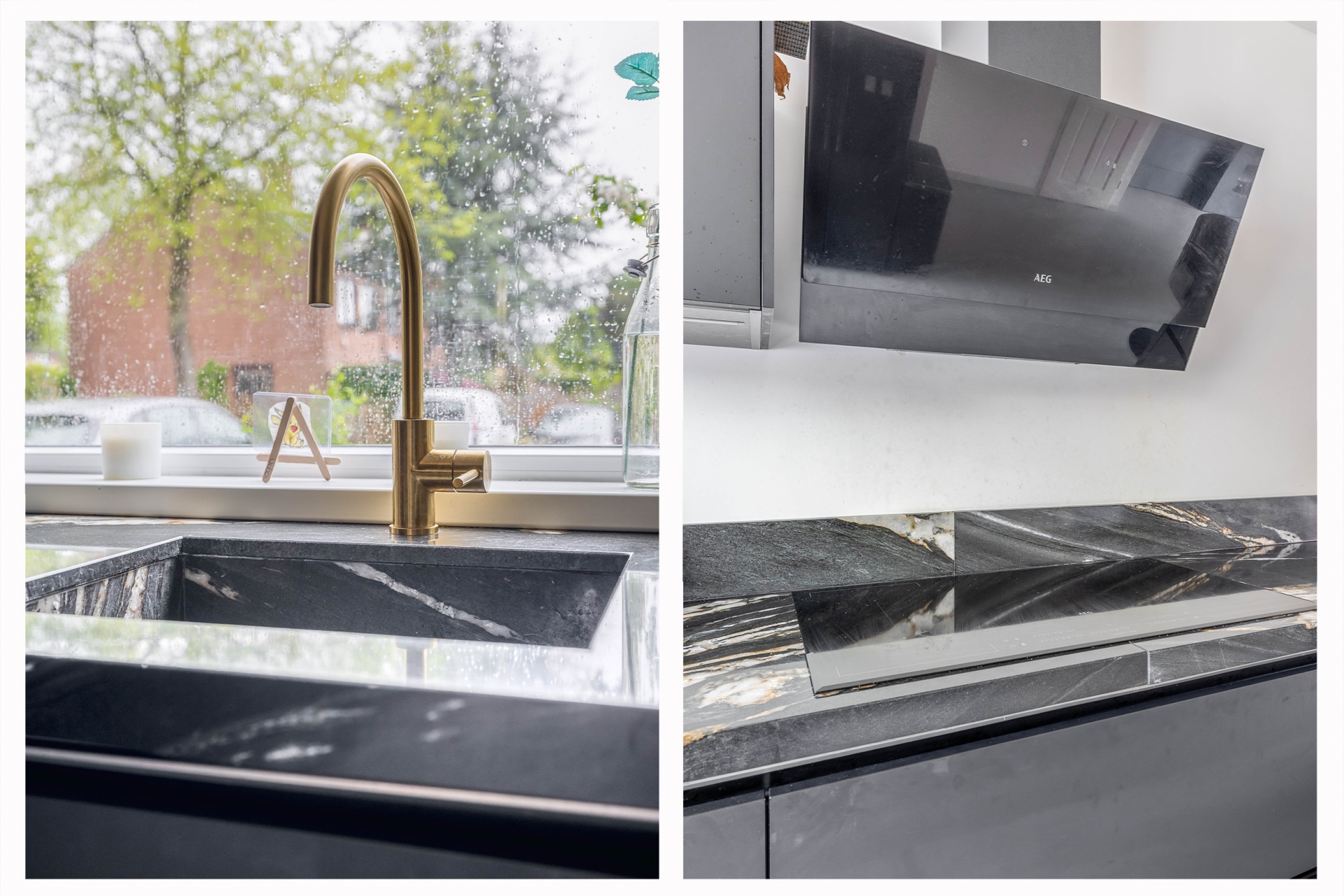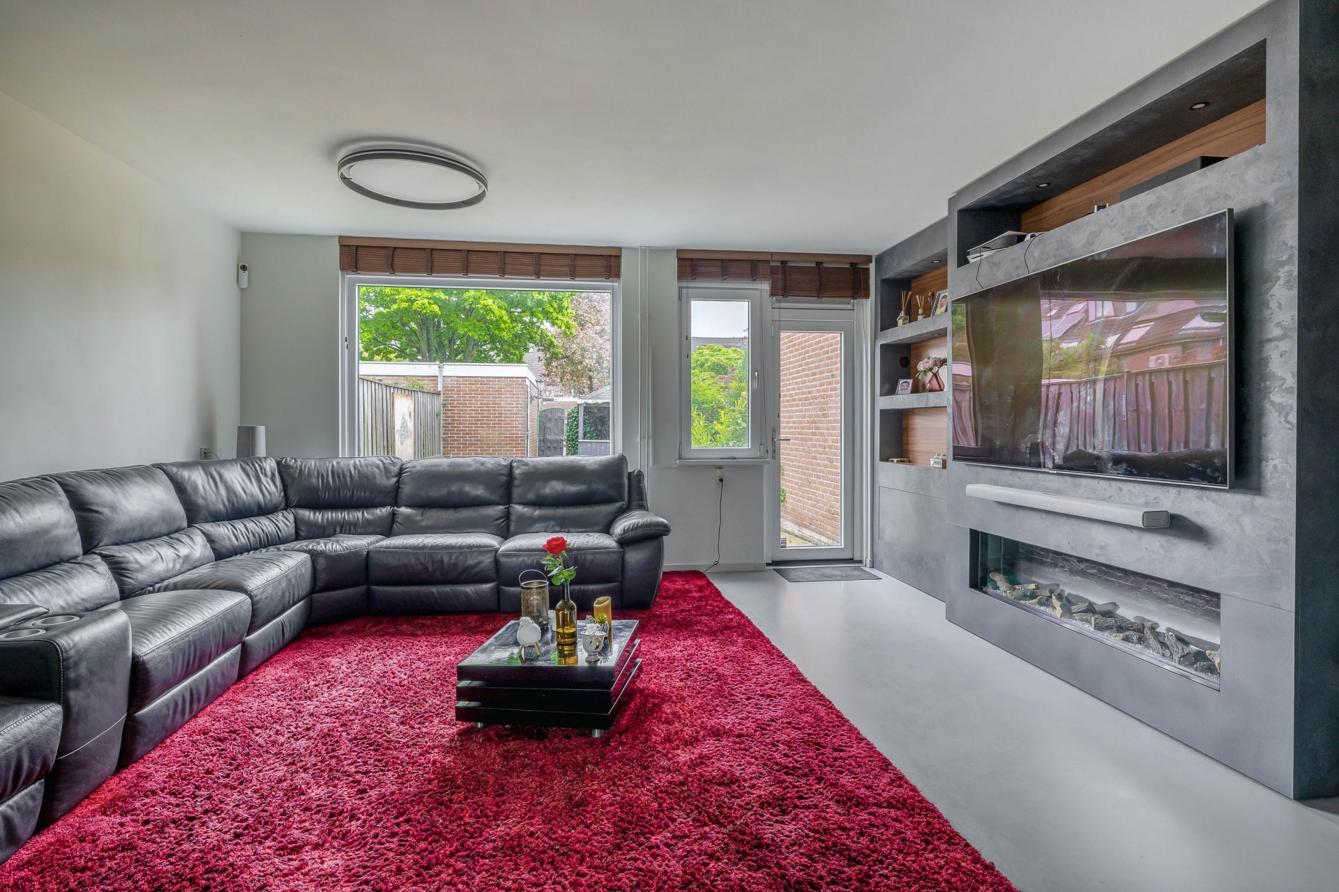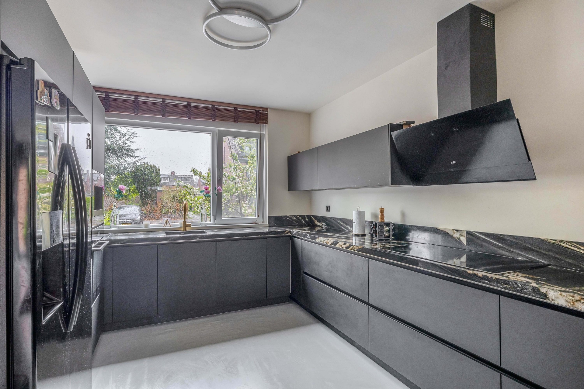 De begane grond is een echte eyecatcher: een open leefruimte waarin de moderne keuken en gezellige zithoek naadloos in elkaar overlopen. De stijlvolle zwarte keuken is niet alleen een plaatje om te zien, maar ook praktisch ingericht met volop kastruimte, moderne apparatuur, een royaal marmeren werkblad en gezellig barretje. Ideaal voor wie graag kookt of samenkomt met vrienden en familie. De lichte woonkamer is voorzien van een op maat gemaakte cinewall met ingebouwde sierhaard – een sfeervol middelpunt van de ruimte waar je heerlijk kunt ontspannen.