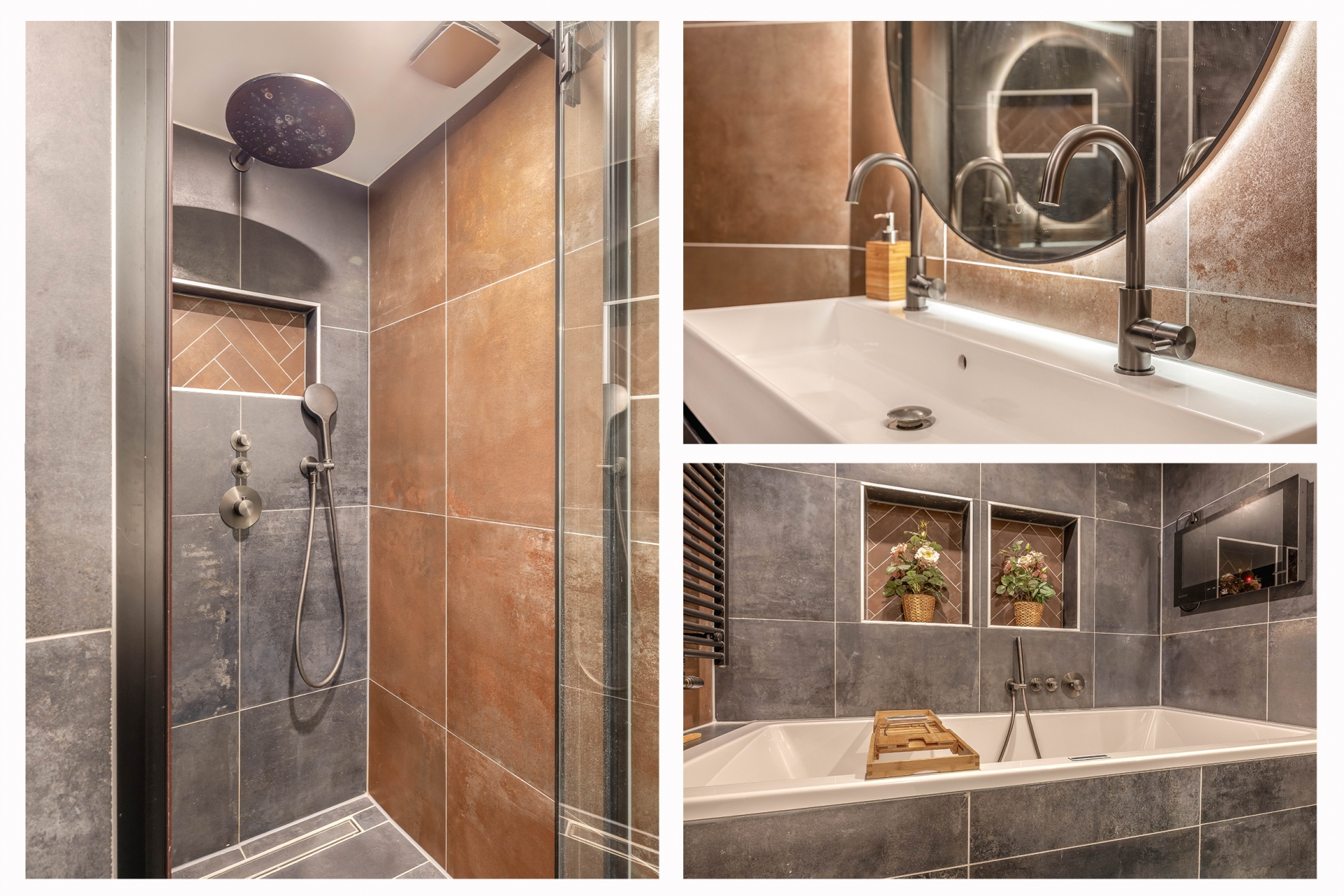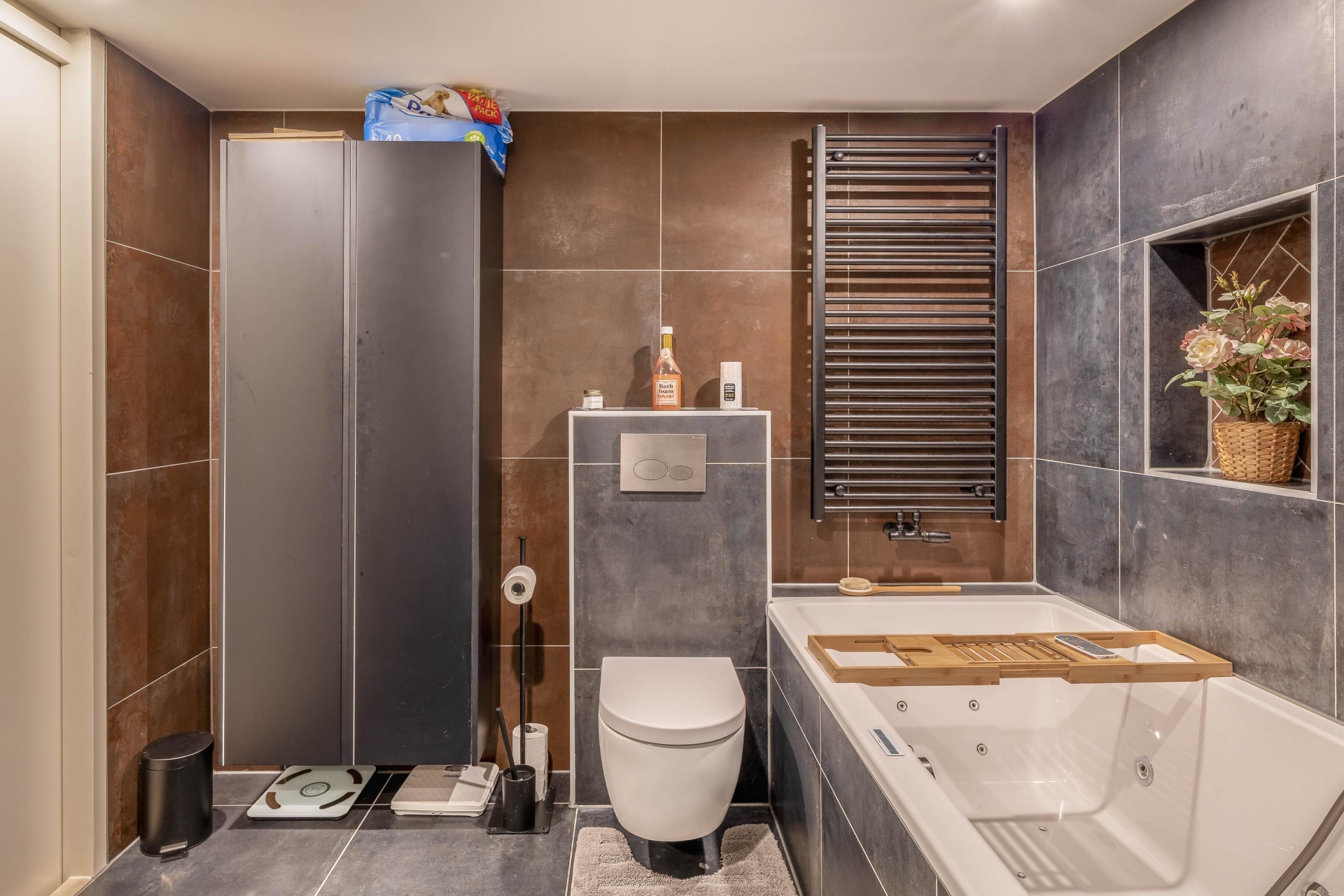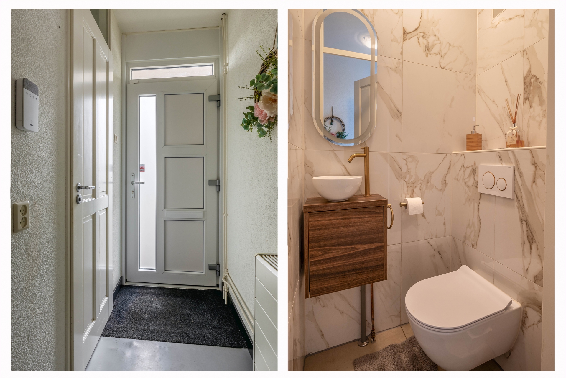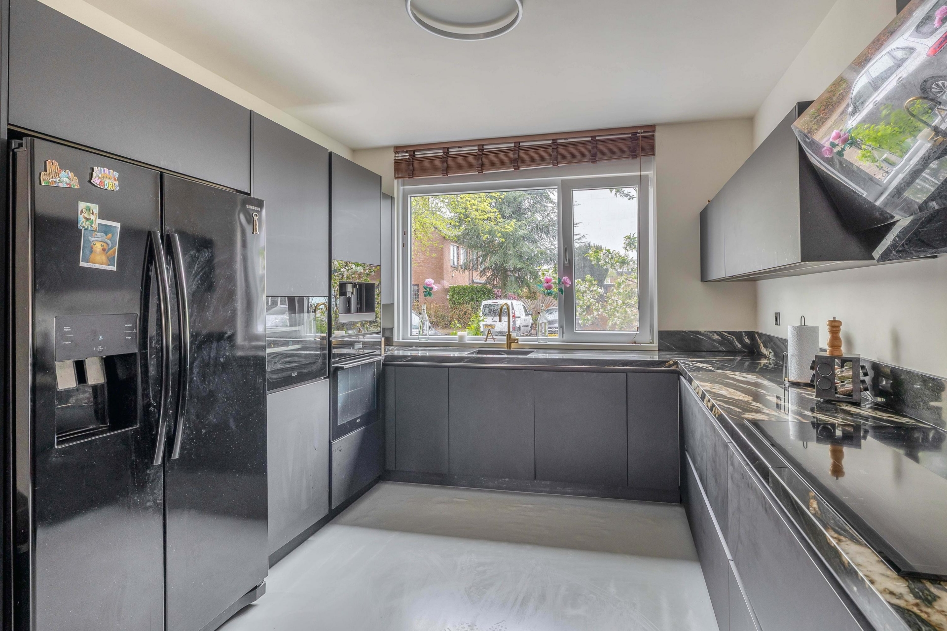 De begane grond is een echte eyecatcher: een open leefruimte waarin de moderne keuken en gezellige zithoek naadloos in elkaar overlopen. De stijlvolle zwarte keuken is niet alleen een plaatje om te zien, maar ook praktisch ingericht met volop kastruimte, moderne apparatuur, een royaal marmeren werkblad en gezellig barretje. Ideaal voor wie graag kookt of samenkomt met vrienden en familie. De lichte woonkamer is voorzien van een op maat gemaakte cinewall met ingebouwde sierhaard – een sfeervol middelpunt van de ruimte waar je heerlijk kunt ontspannen.