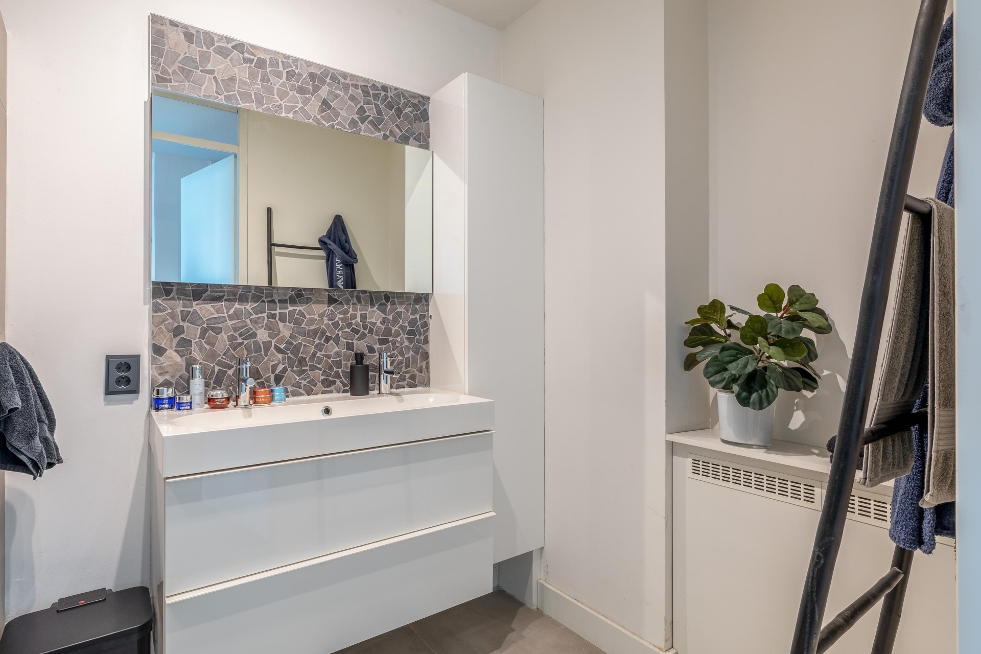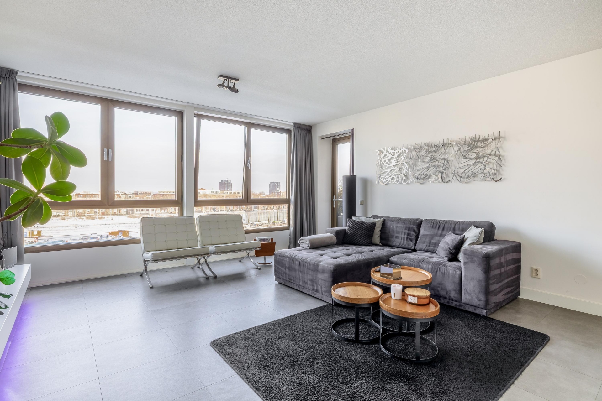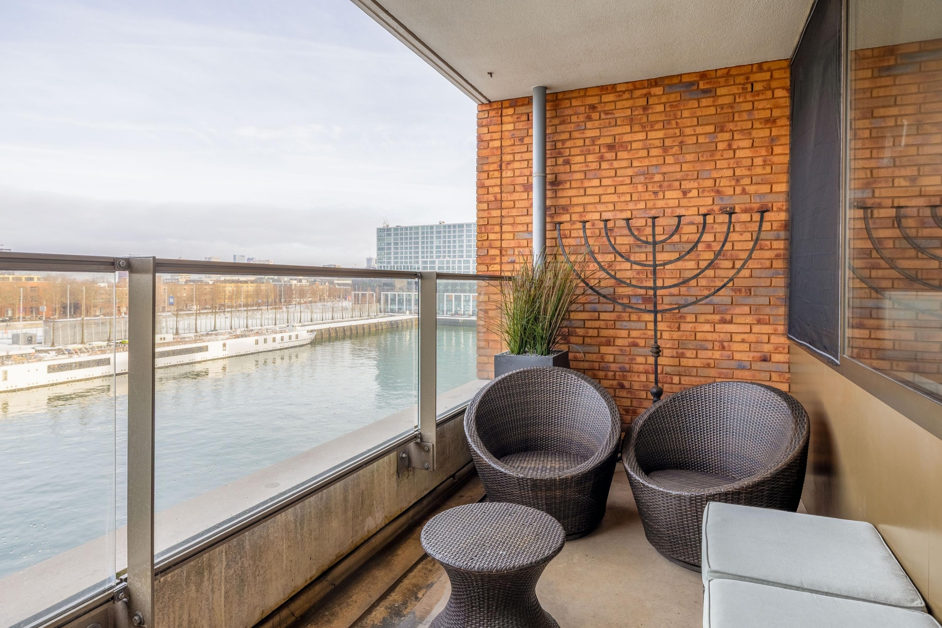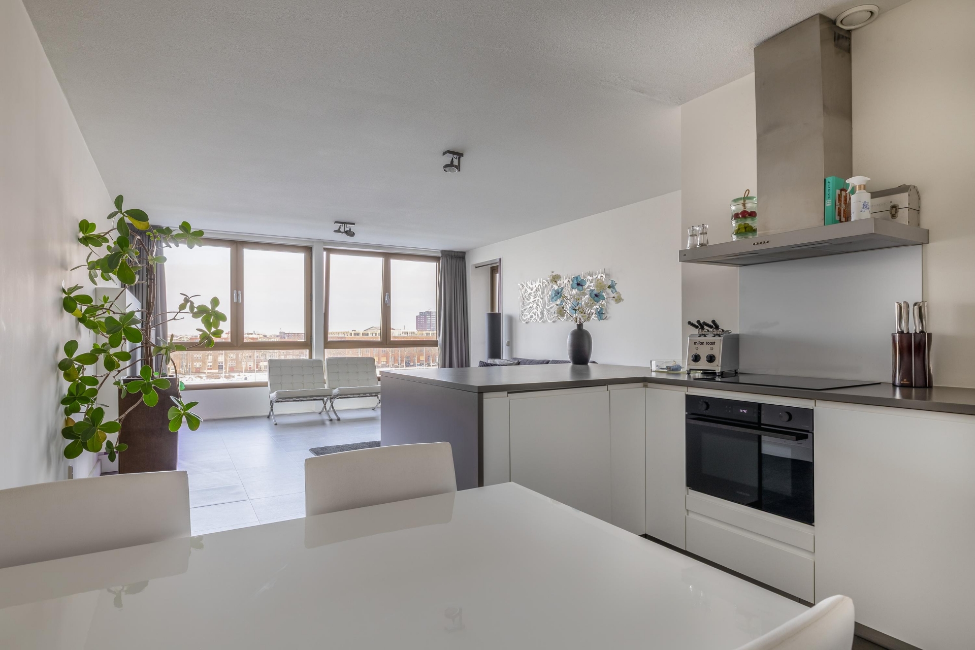 De woning is van top tot teen verzorgd. De ruime woonkamer is licht en sfeervol en biedt door de grote raampartijen een prachtig panoramisch uitzicht over het water. Hier kan je elke dag kunt genieten van de skyline, voorbijvarende schepen en een zeldzaam gevoel van ruimte. En dat midden in de stad.