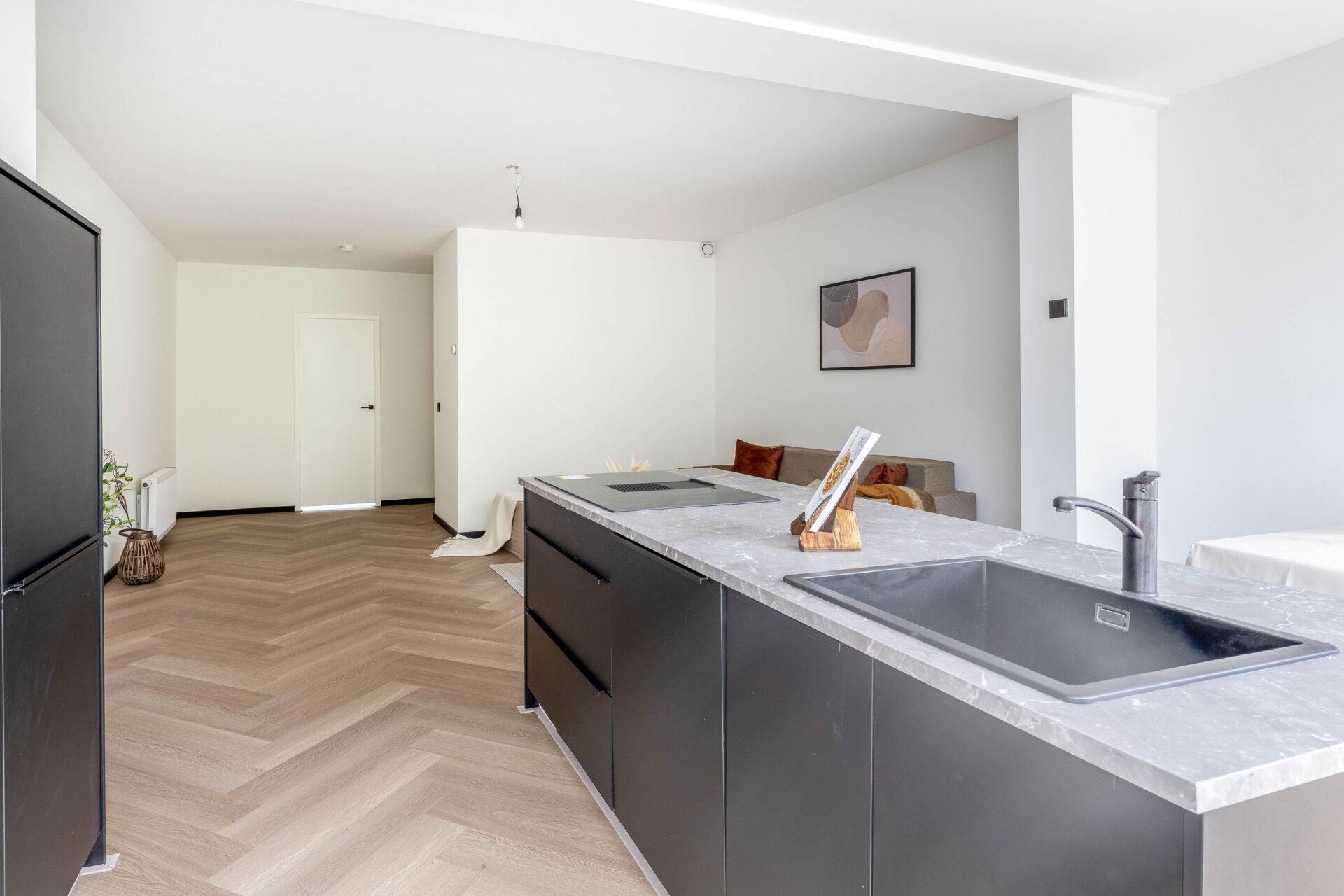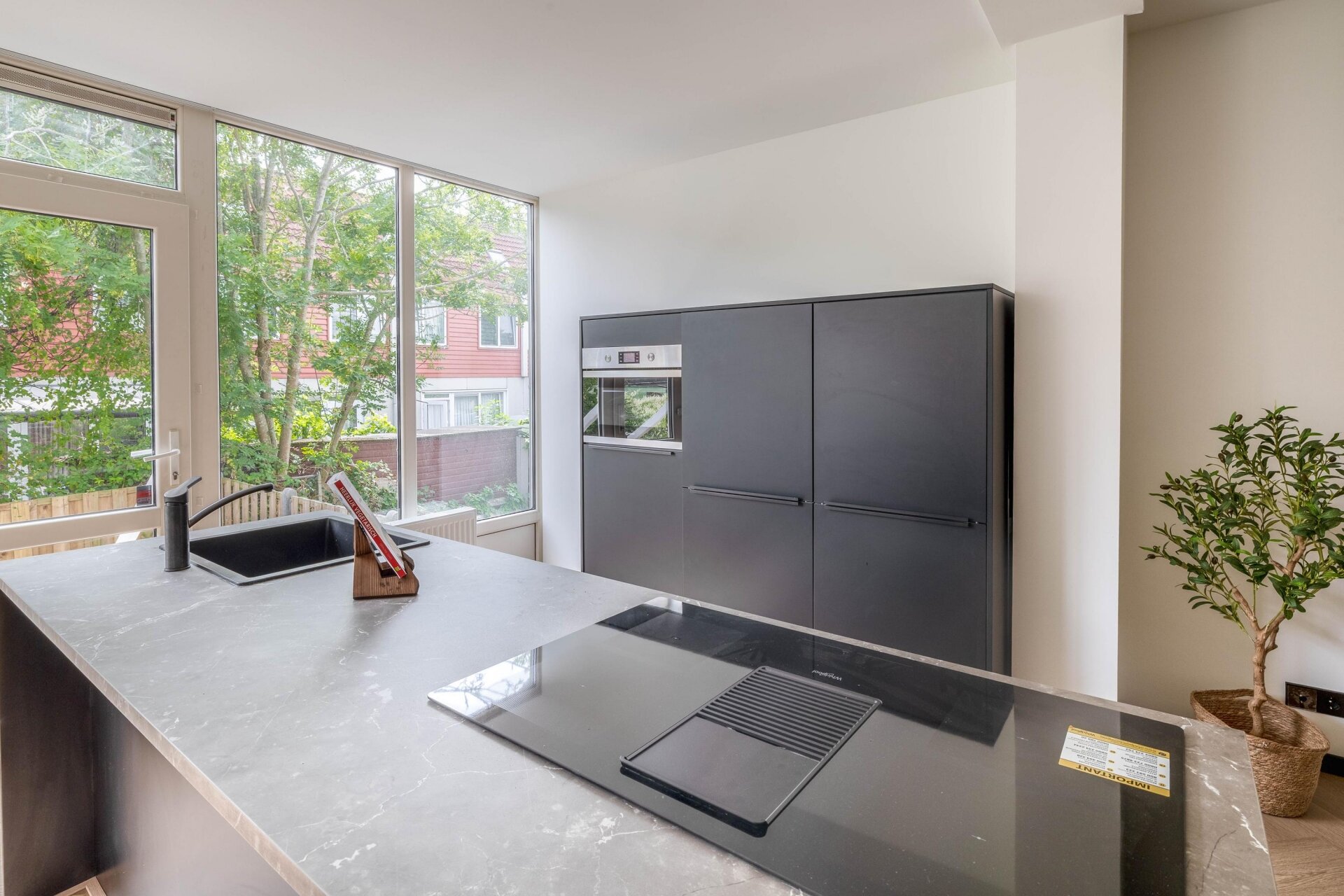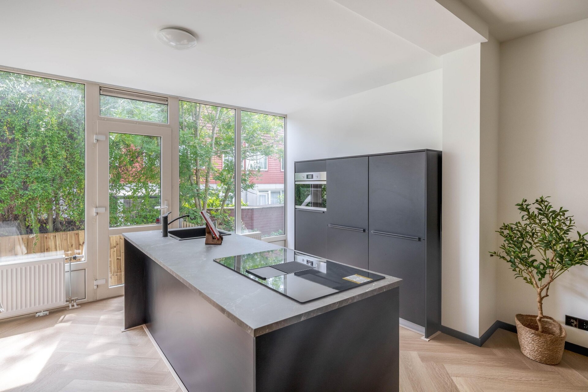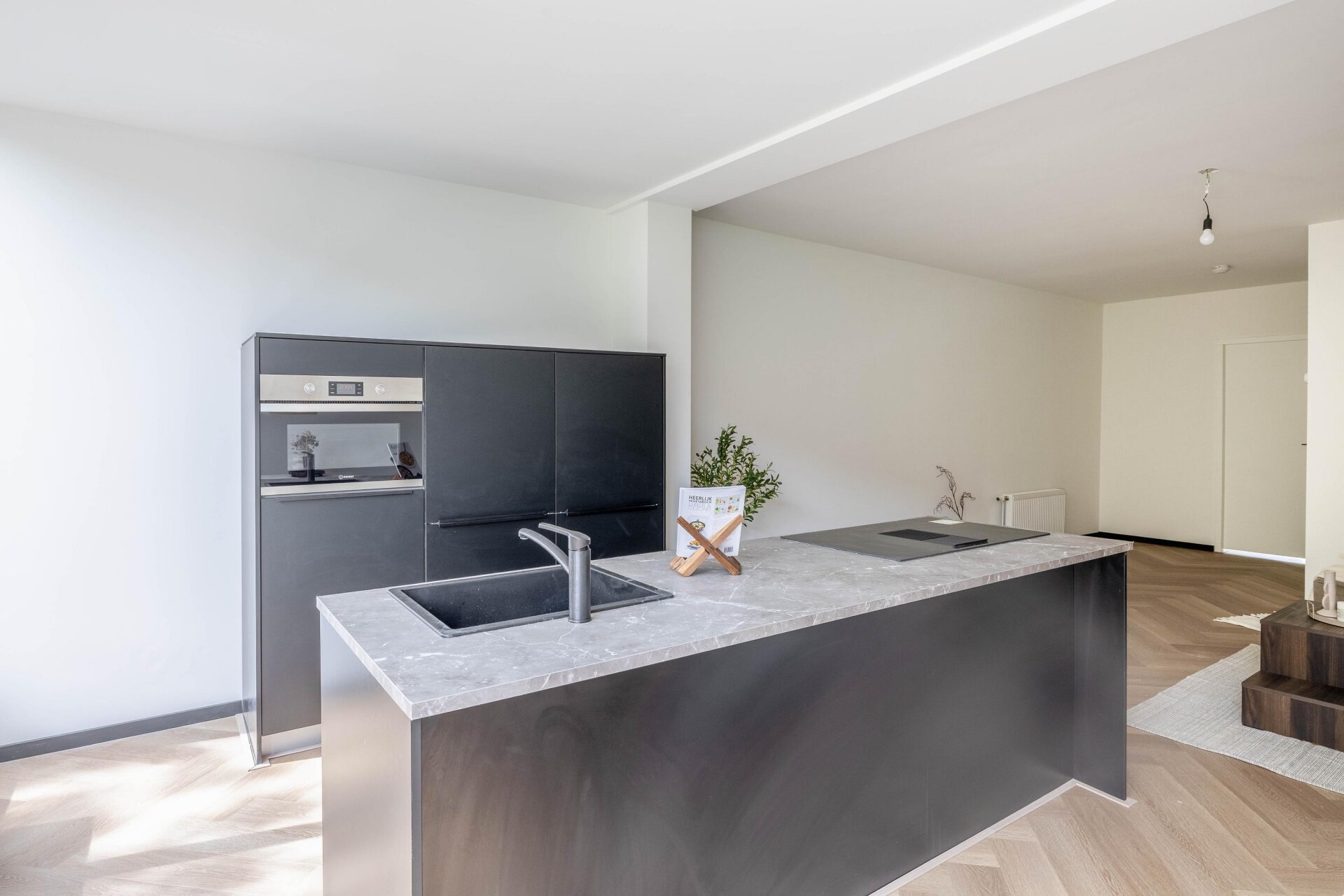 De open keuken is een absolute blikvanger. Voorzien van een kook-/watereiland, inductiekookplaat met geïntegreerde afzuiging, combi-oven, koelkast en veel kastruimte. Een perfecte plek om te koken, te borrelen of uitgebreid te tafelen met vrienden of familie.
