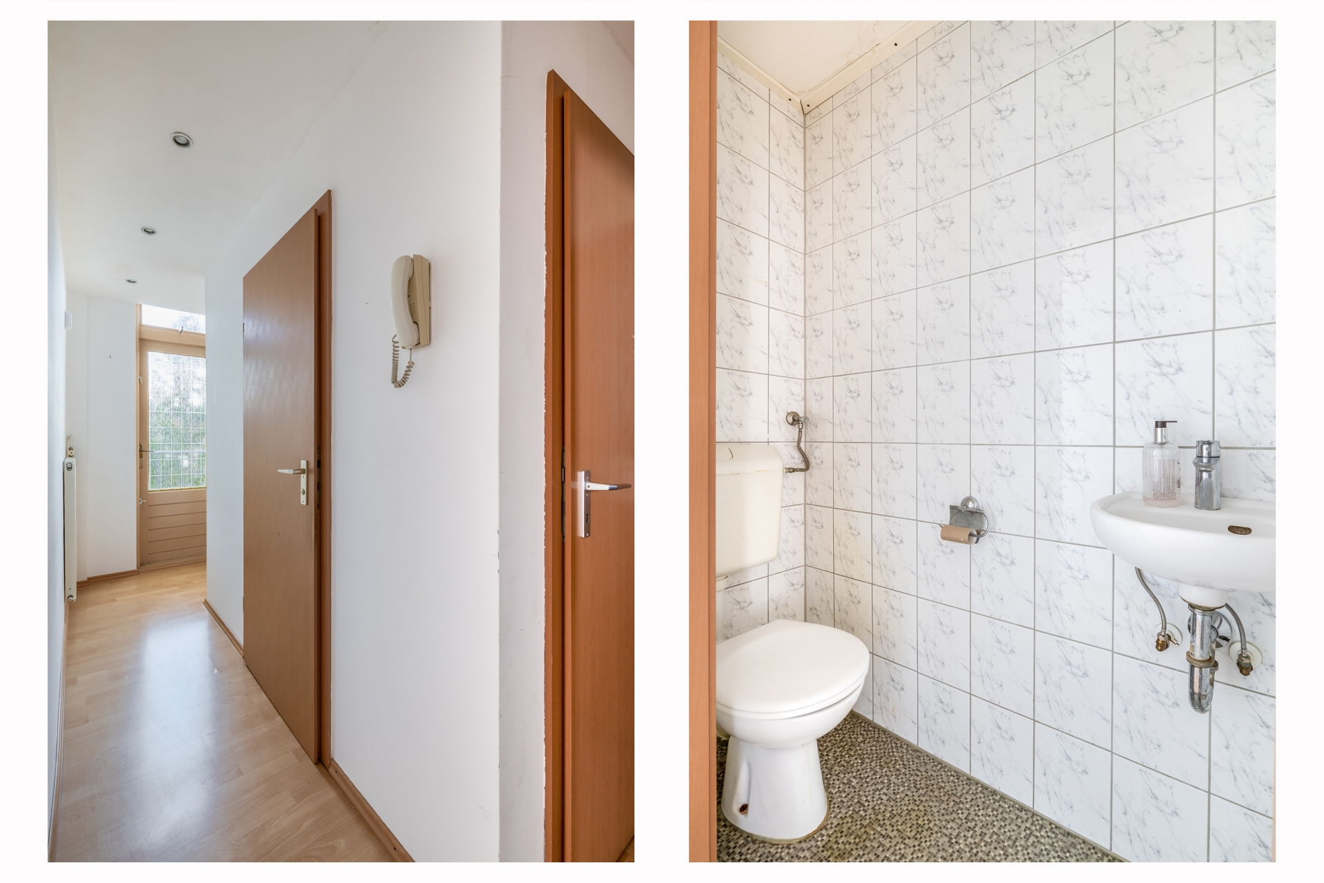 De woonkamer valt direct op door de grote ramen die zorgen voor veel daglicht en een prachtig uitzicht op het water en groen. Dankzij de ruime indeling is er plek voor een royale zithoek én een eethoek. De laminaatvloer en de trapopgang zijn verzorgd afgewerkt, waardoor het geheel een warme en moderne uitstraling krijgt.