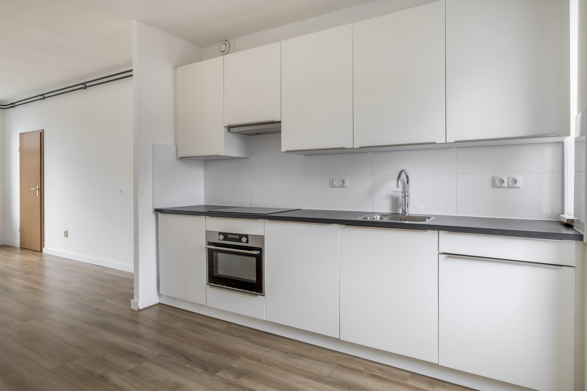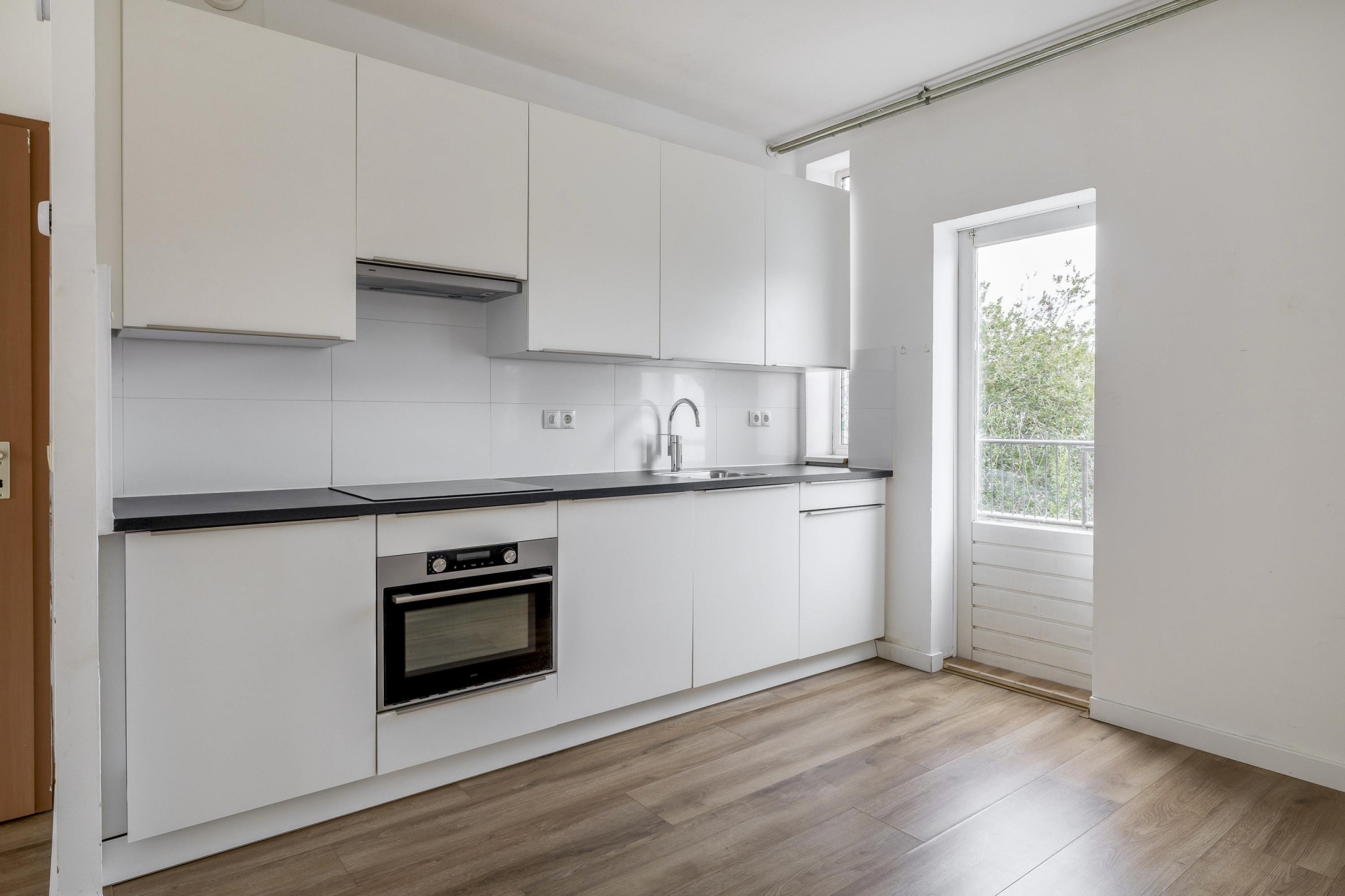 Aan de achterzijde ligt de keuken, met toegang tot het balkon. De keuken is functioneel ingericht en biedt ruimte voor een kleine eettafel of extra opbergkasten. Door de gunstige ligging komt ook hier veel licht naar binnen. Het balkon aan de achterzijde is een fijne plek voor een kop koffie in de ochtendzon.