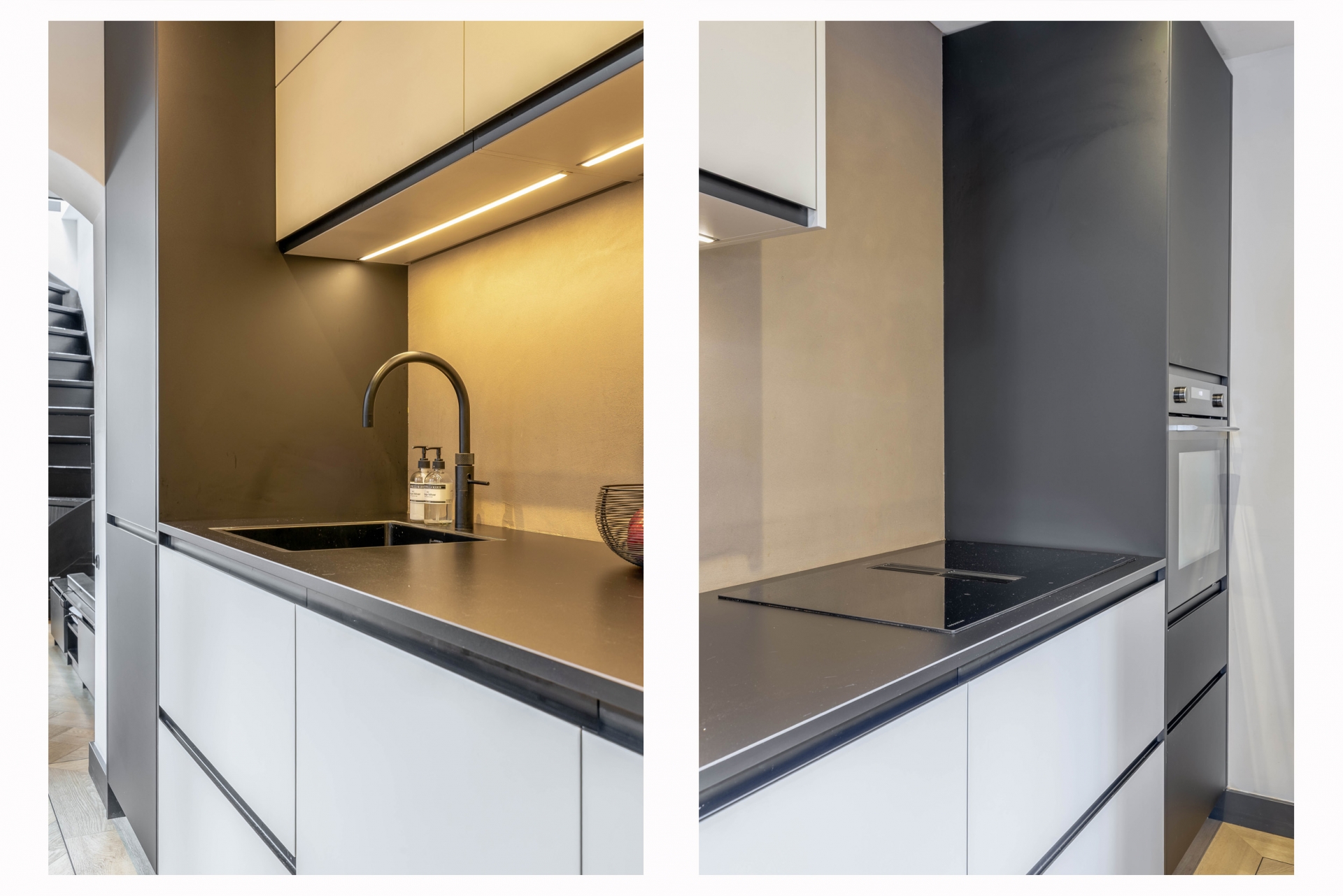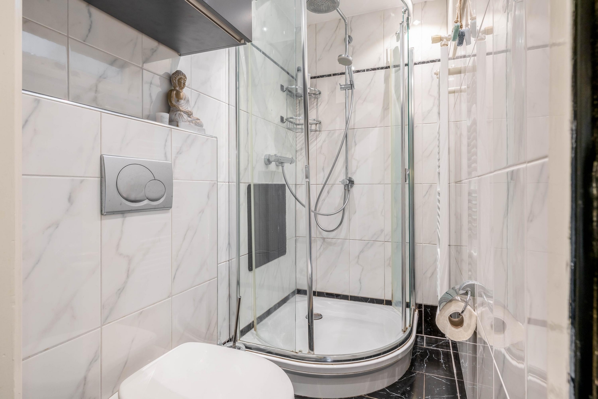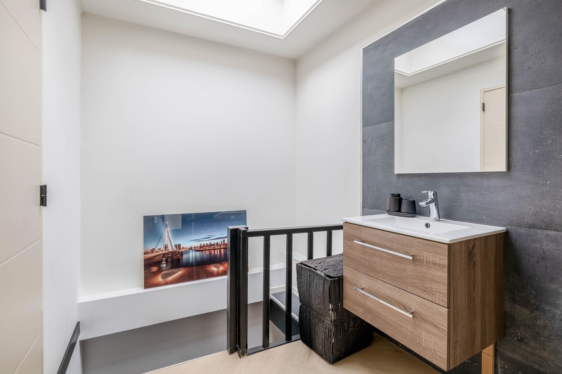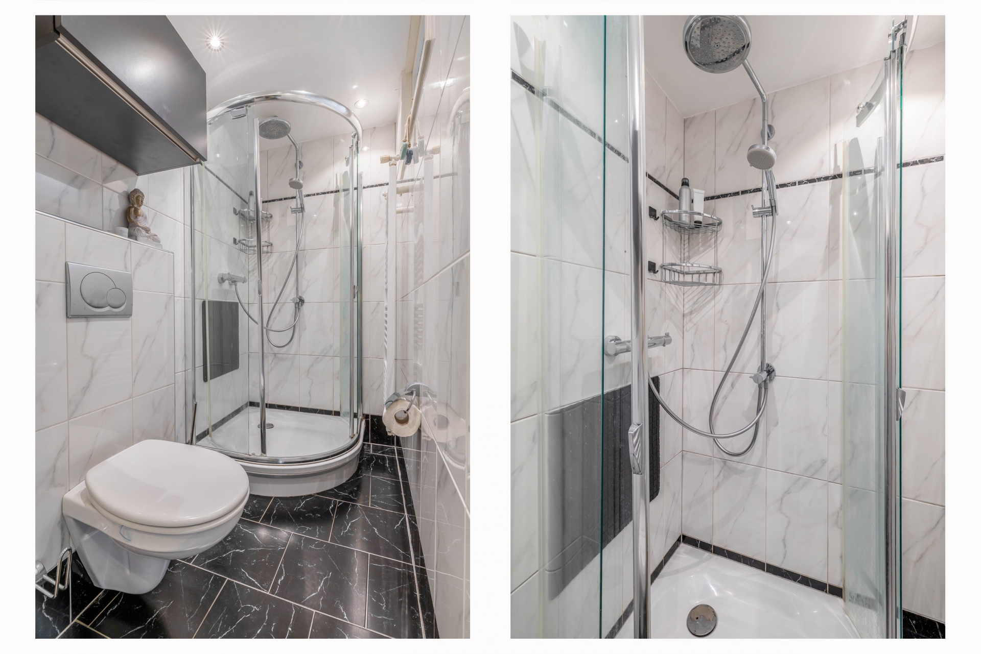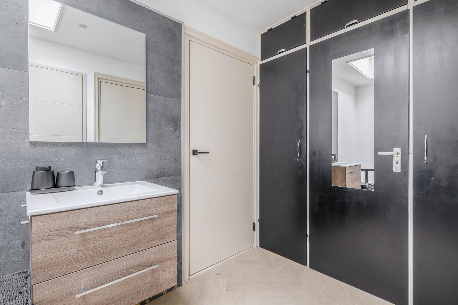 De keuken is een echte eyecatcher in het huis. Strak vormgegeven, met moderne fronten en een donker werkblad dat zorgt voor een stijlvol contrast. Hier is niet alleen gekeken naar uitstraling, maar ook naar gebruiksgemak. Dankzij het vernieuwde leidingwerk en de slimme indeling heb je alles binnen handbereik. Daarnaast de betegelde badkamer met toilet en douchecabine.