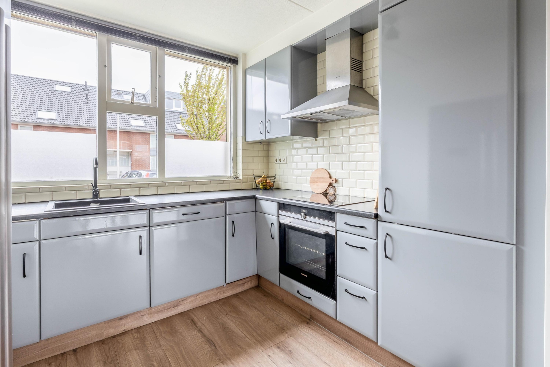 Aan de voorzijde bevindt zich de keuken, opgesteld in een praktische opstelling. Vanuit de keuken kijk je uit over de straat, wat zorgt voor een levendig en open gevoel. Er is voldoende werk- en bergruimte aanwezig, waardoor koken hier comfortabel is. De indeling van de begane grond is logisch en zorgt ervoor dat elke vierkante meter goed wordt benut.