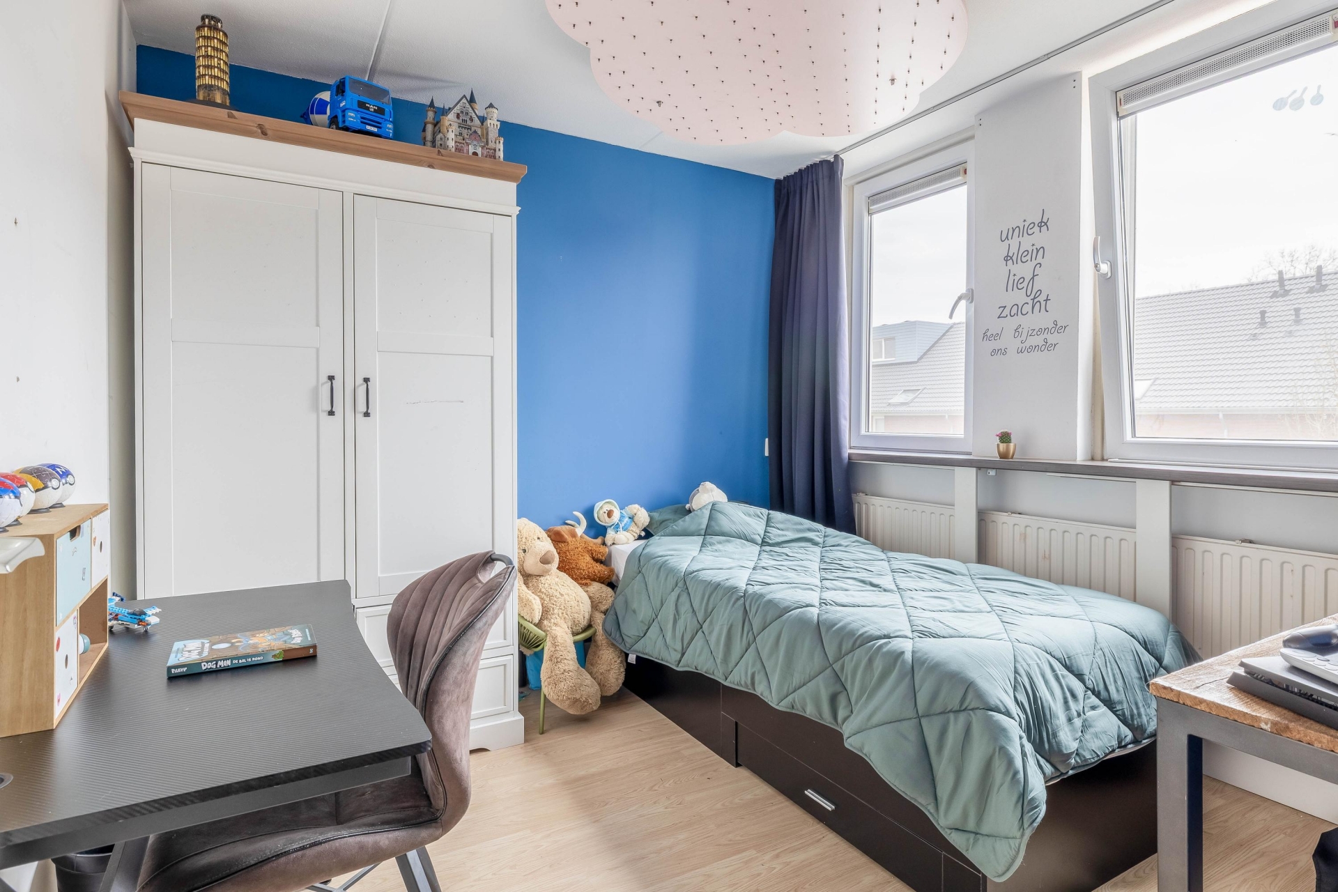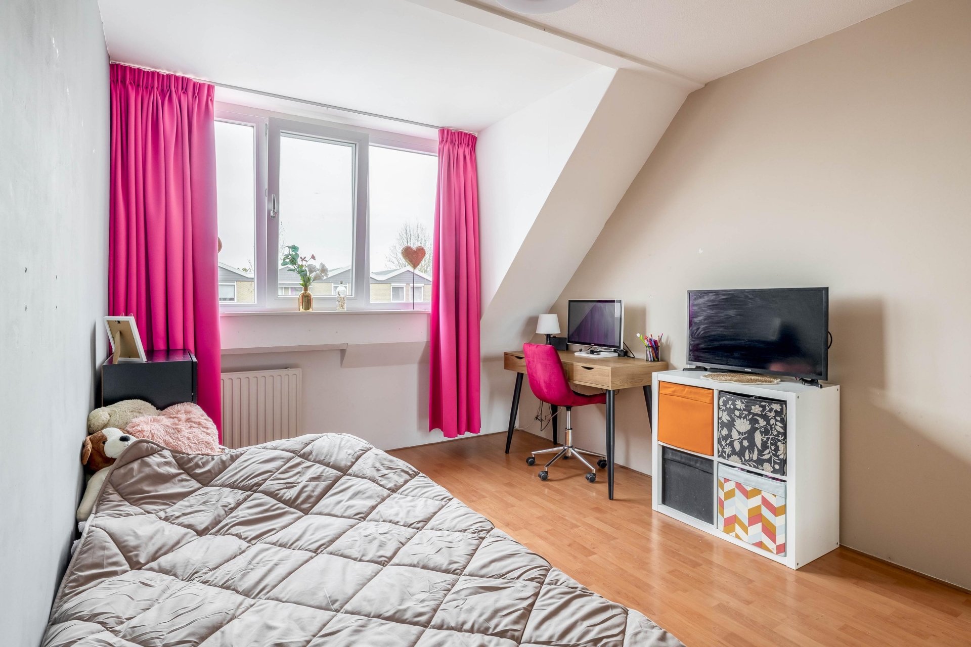 De tweede verdieping is een echte aanvulling op het huis. Hier vind je een ruime zolderkamer die uitstekend te gebruiken is als vierde slaapkamer, werkruimte of hobbykamer. Dankzij de slimme indeling en de bergruimte achter de knieschotten is dit een volwaardige en goed bruikbare verdieping.
