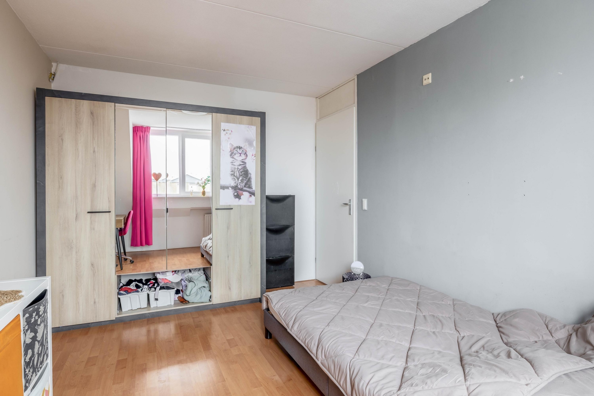 Op de eerste verdieping vind je drie slaapkamers van goed formaat. De grootste slaapkamer ligt aan de achterzijde. Aan de voorzijde bevindt zich nog een ruime slaapkamer en daarnaast een derde kamer die perfect geschikt is als kinder-, werk- of logeerkamer.