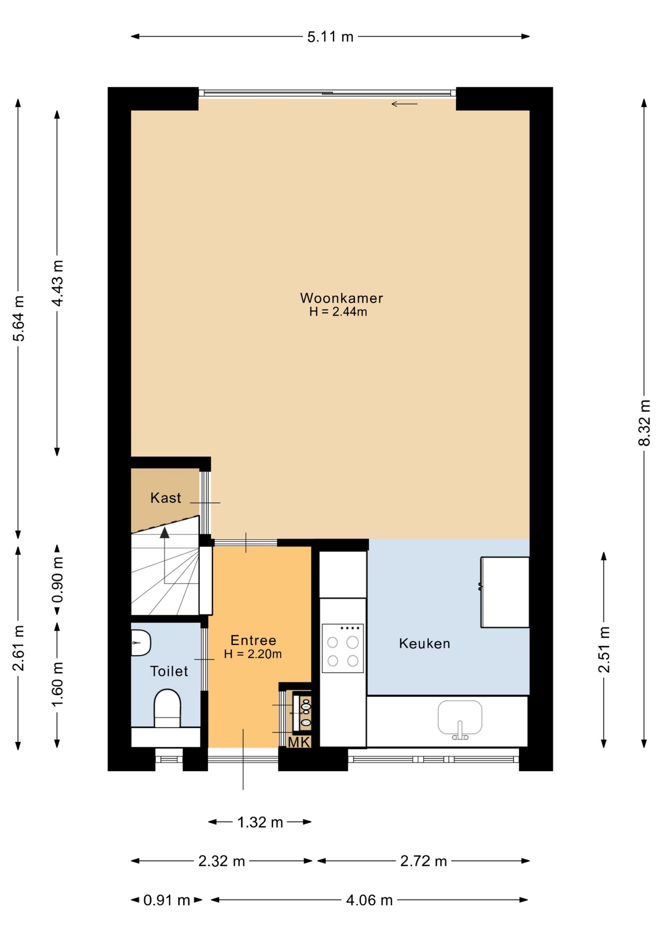 Bij binnenkomst kom je in de entree met toegang tot het toilet, de meterkast en de trap naar boven. Vanuit hier loop je door naar de woonkamer aan de achterzijde van het huis. Deze ruimte is prettig licht dankzij de grote schuifpui en biedt voldoende plek voor een ruime zithoek. Het contact met de tuin maakt dit een fijne leefruimte waar binnen en buiten moeiteloos in elkaar overlopen.