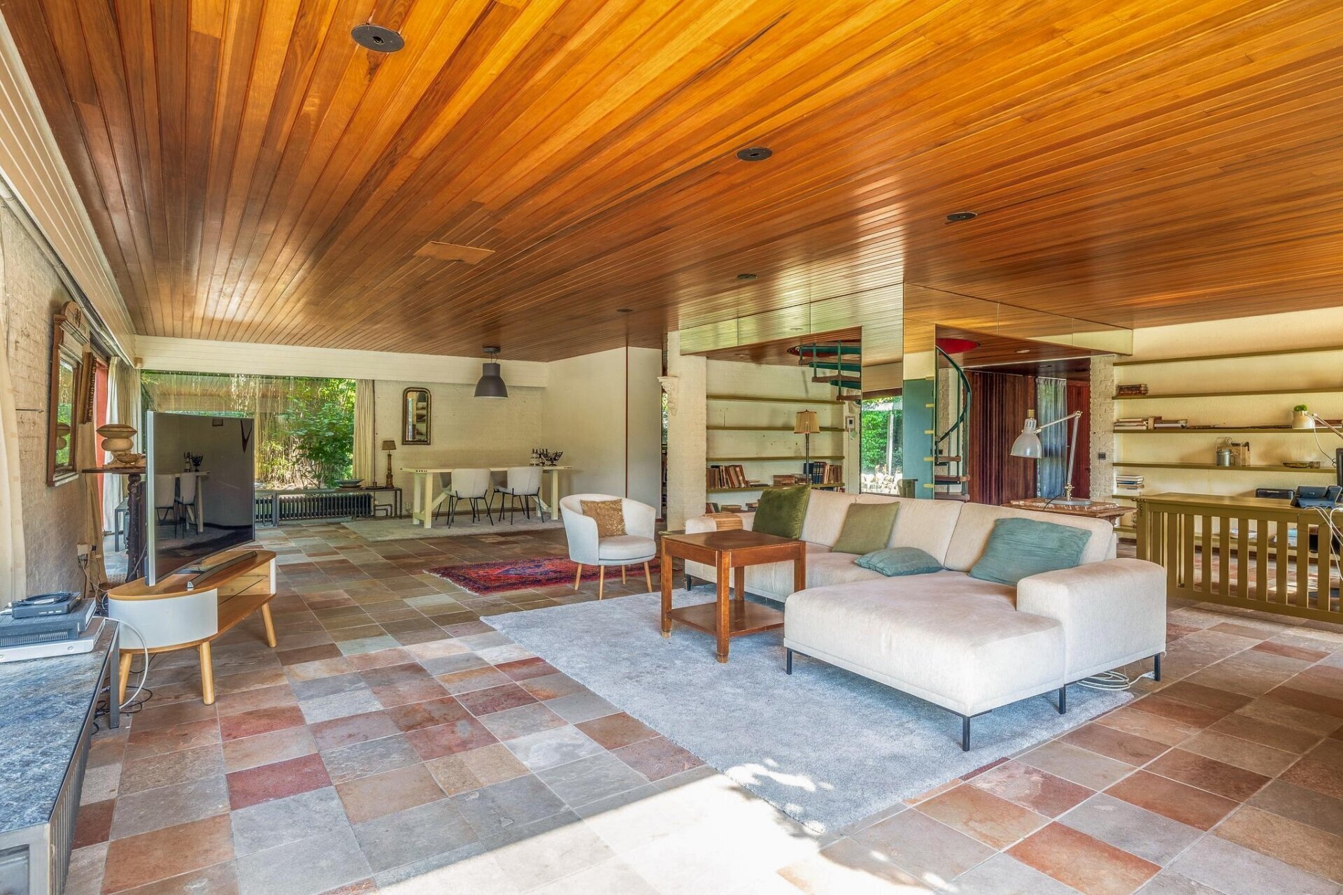 Inside, you’ll find a spacious, garden-oriented living room with large windows that bring in lots of light and offer views of the surrounding greenery. The warm atmosphere and generous layout provide plenty of options for different interior arrangements to suit your personal living style. The adjacent open-plan kitchen is roomy and forms the heart of the home.