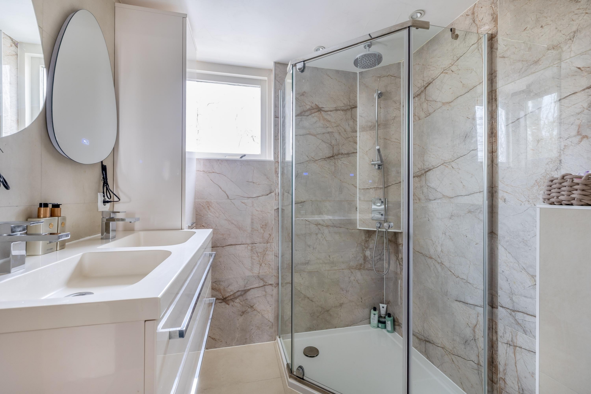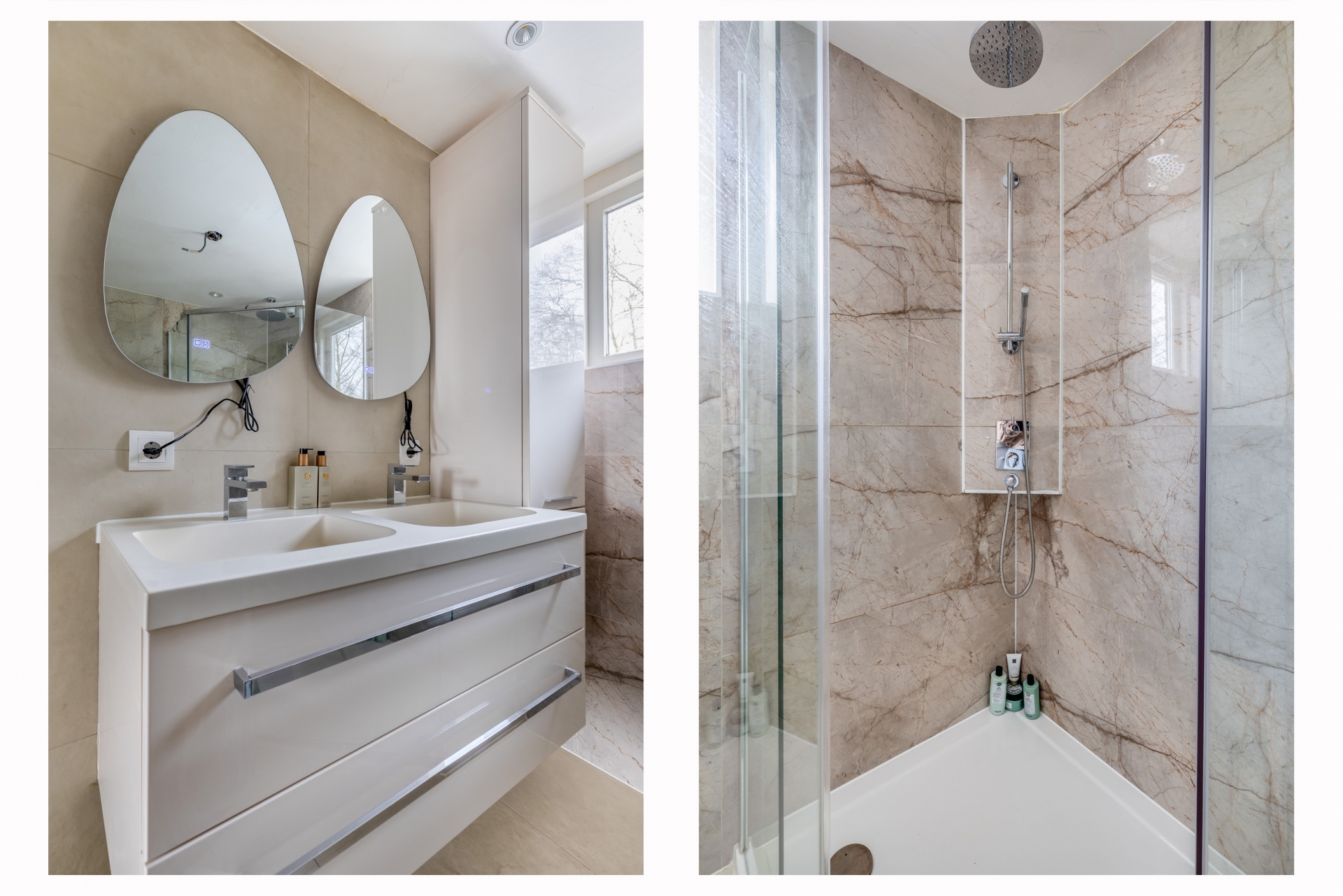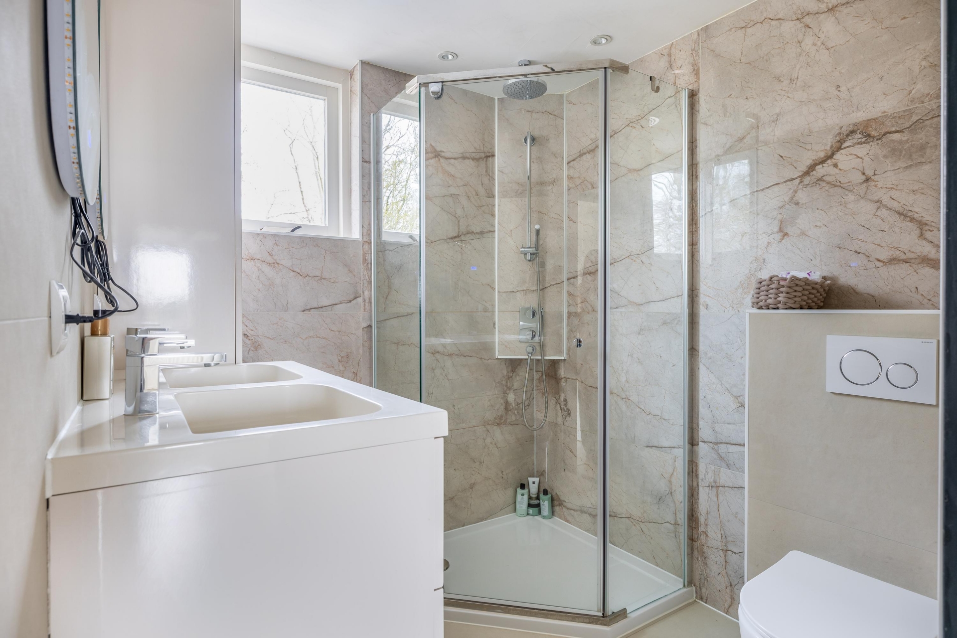 De badkamer (2025) is modern uitgevoerd en beschikt over een ruime inloopdouche, een dubbel wastafelmeubel en een toilet.