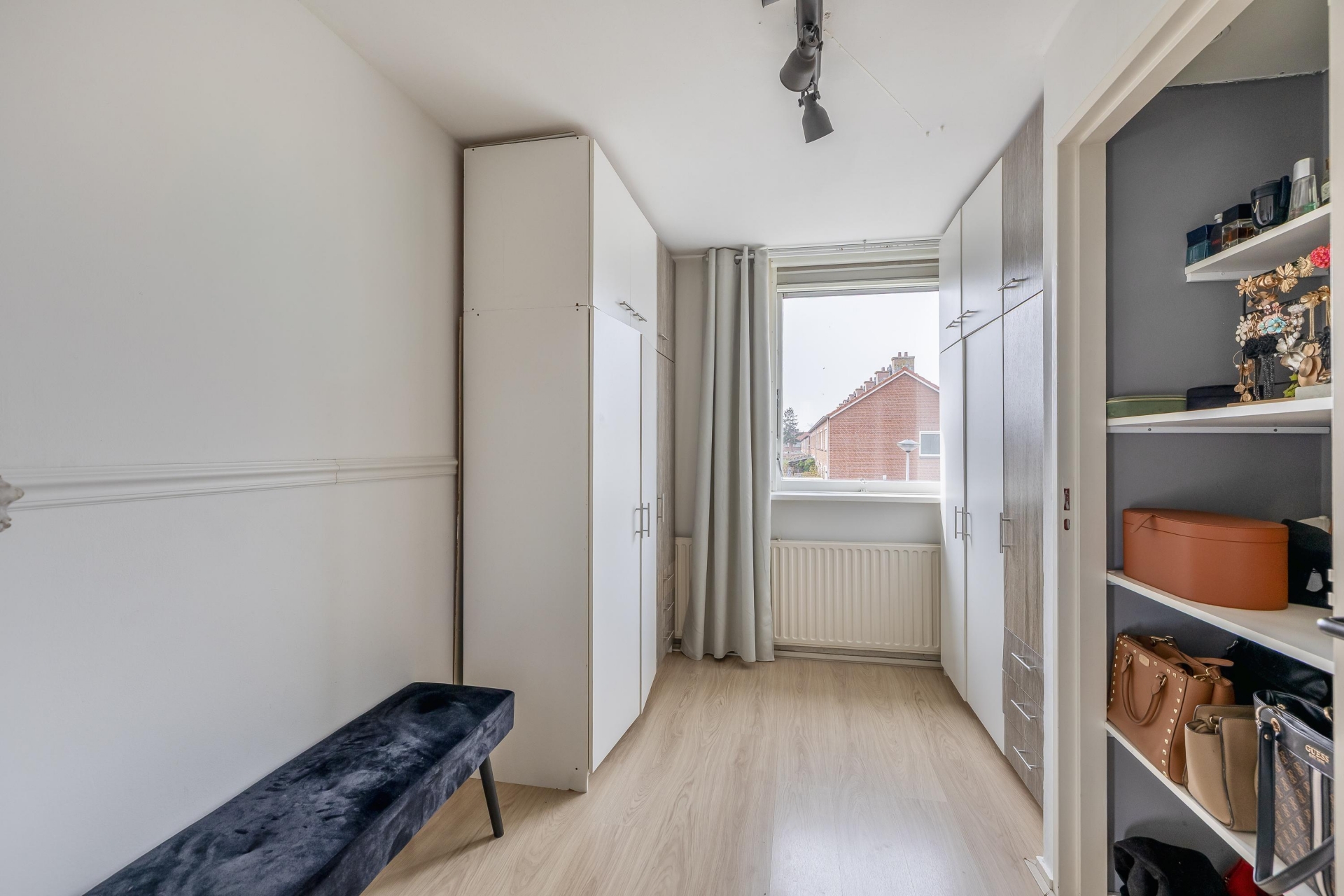 De overloop op de eerste verdieping biedt toegang tot alle vertrekken. Aan de achterzijde bevinden zich twee slaapkamers van circa 13,5 m² en 9 m². De slaapkamer aan de voorzijde heeft een oppervlakte van ongeveer 11 m². Alle slaapkamers zijn voorzien van praktische vaste kasten.