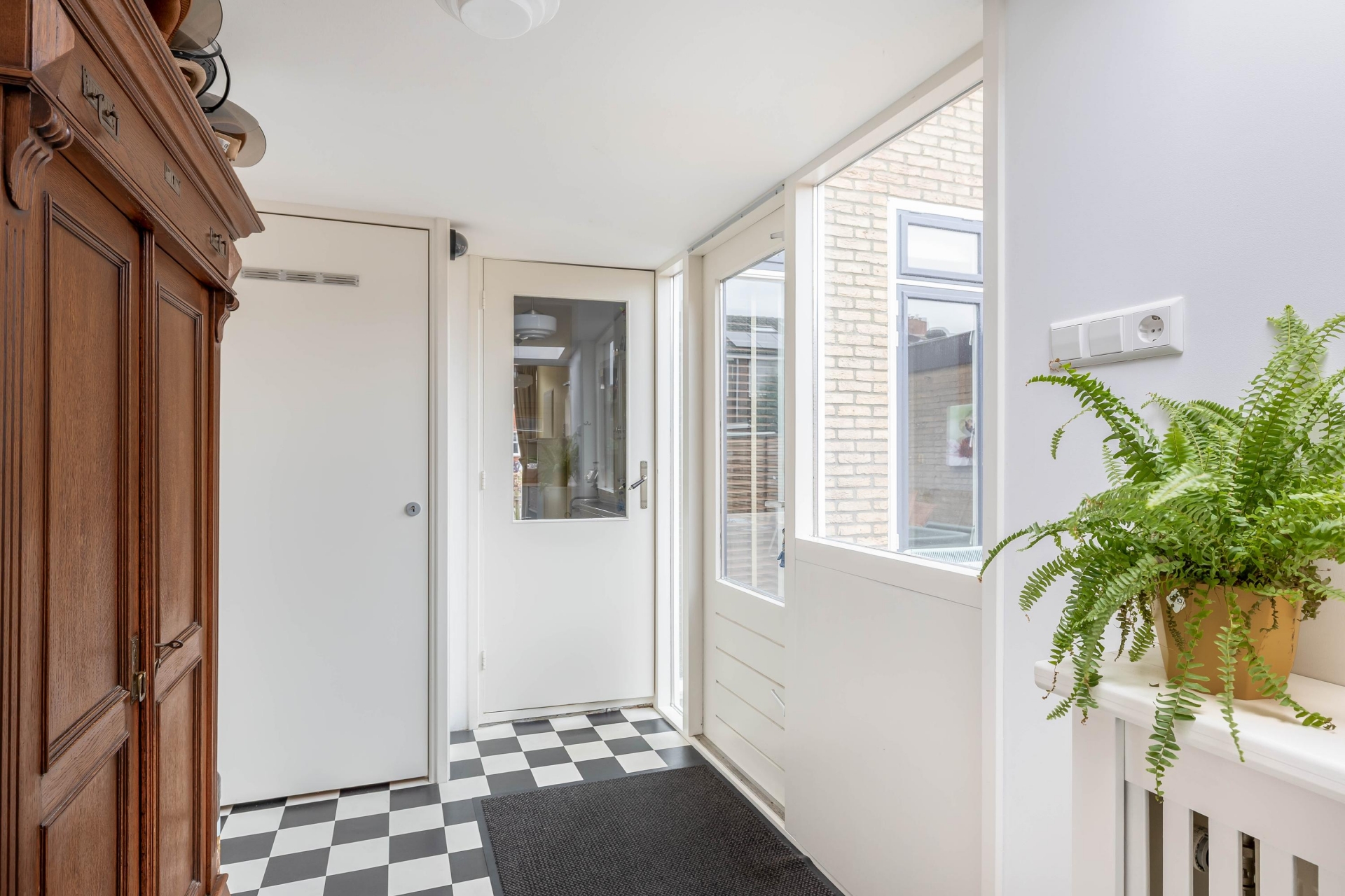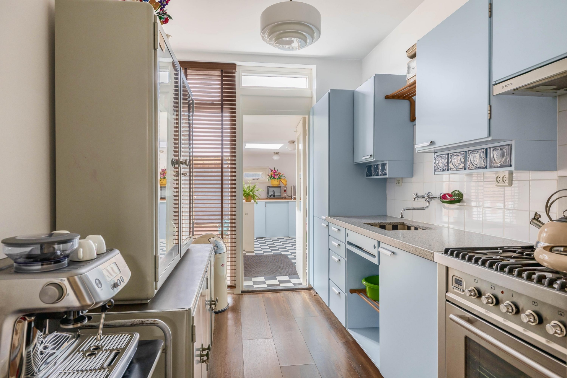 De keuken ligt aan de achterzijde en is uitgevoerd in een zachte blauwgrijze tint met een licht werkblad. De dichte keuken heeft een verzorgde en nette uitstraling. Je beschikt hier over voldoende kastruimte en diverse (deels vernieuwde) inbouwapparatuur. Vanuit de keuken kijk je door naar de bijkeuken met extra lichtinval via een lichtkoepel. Dit is een ideale extra ruimte met de opstelplaats van de was-apparatuur!